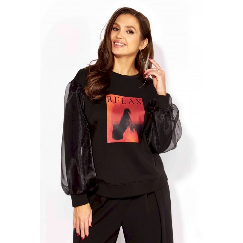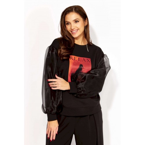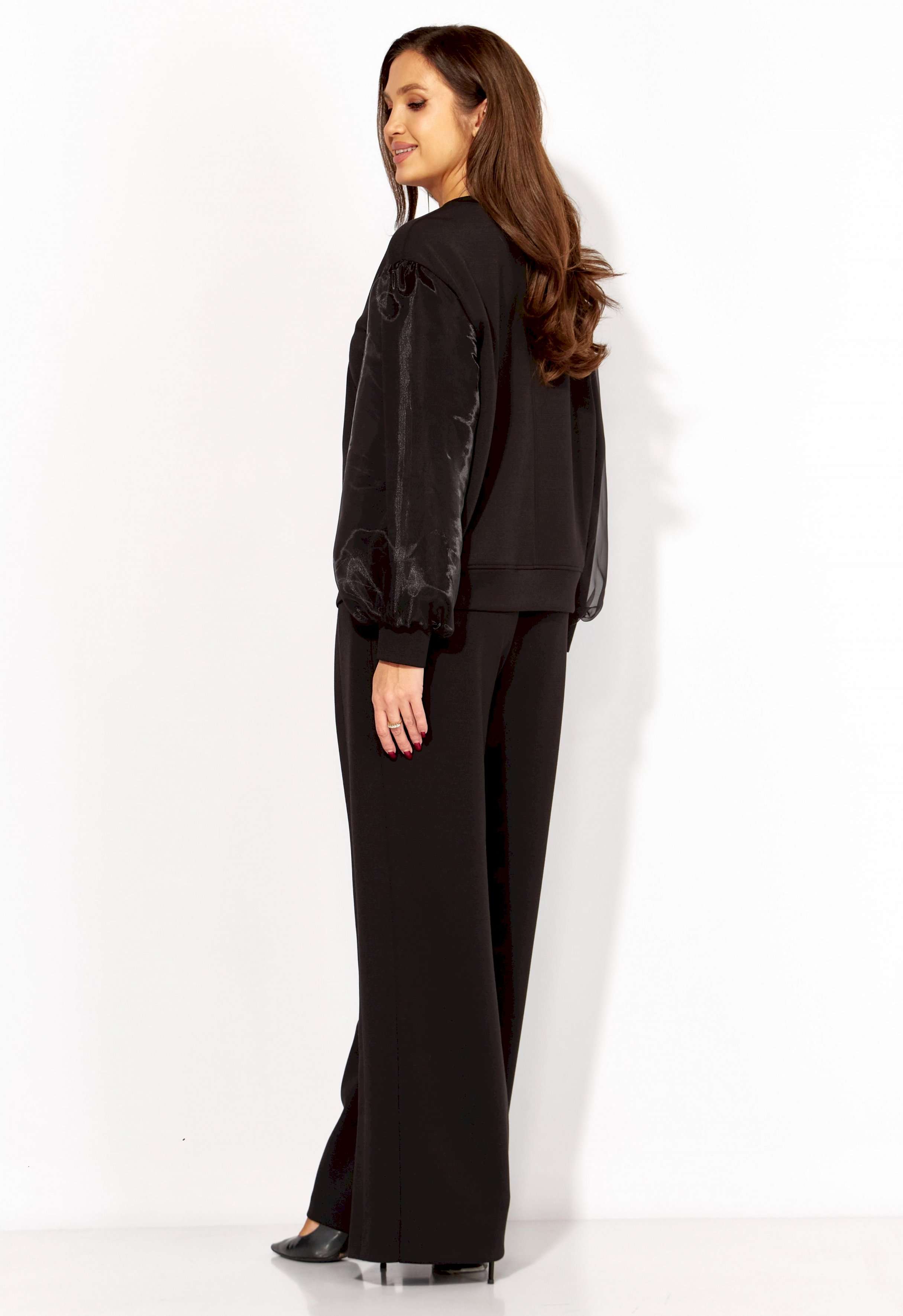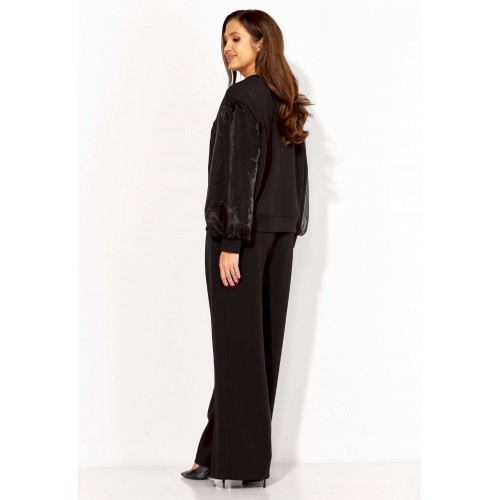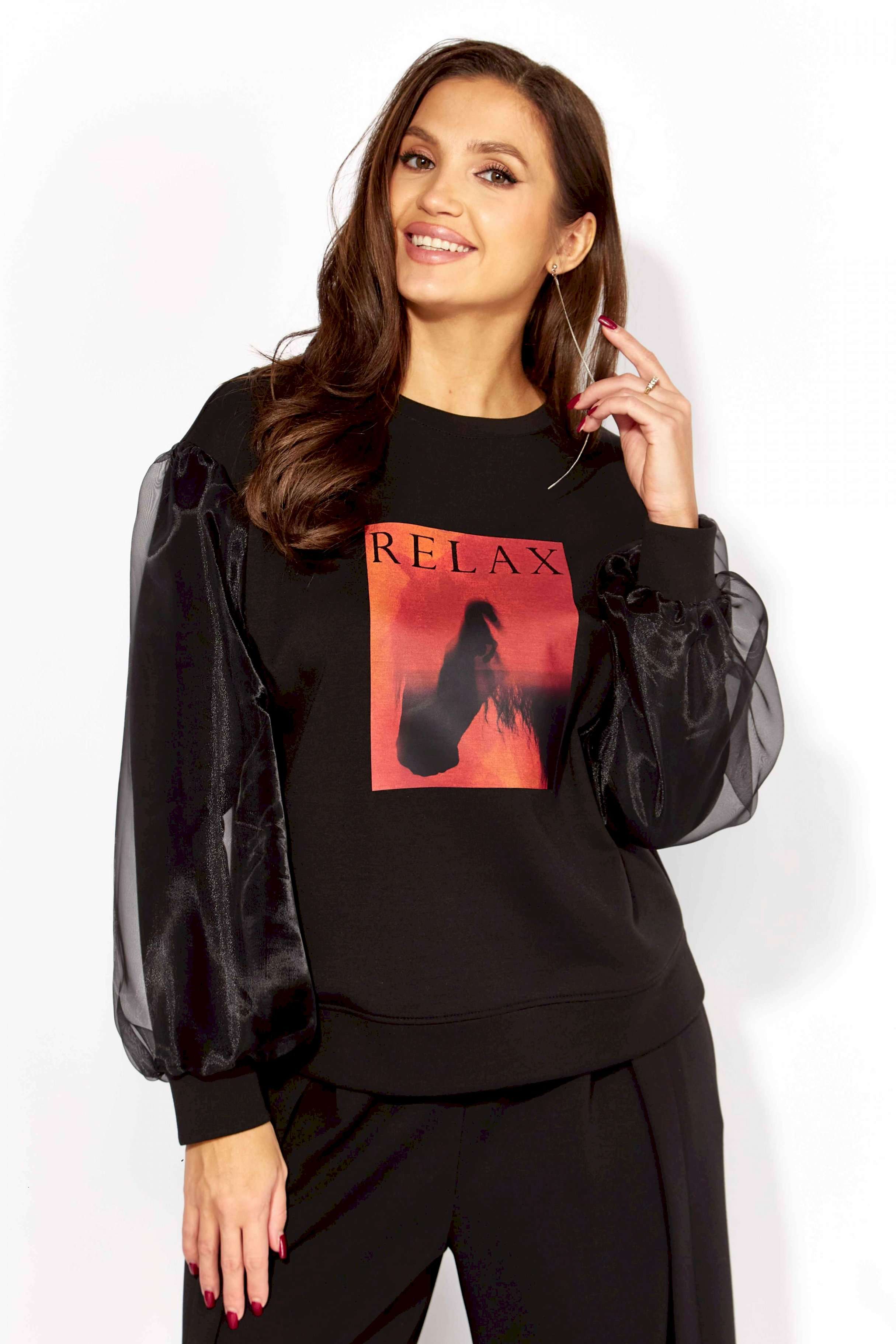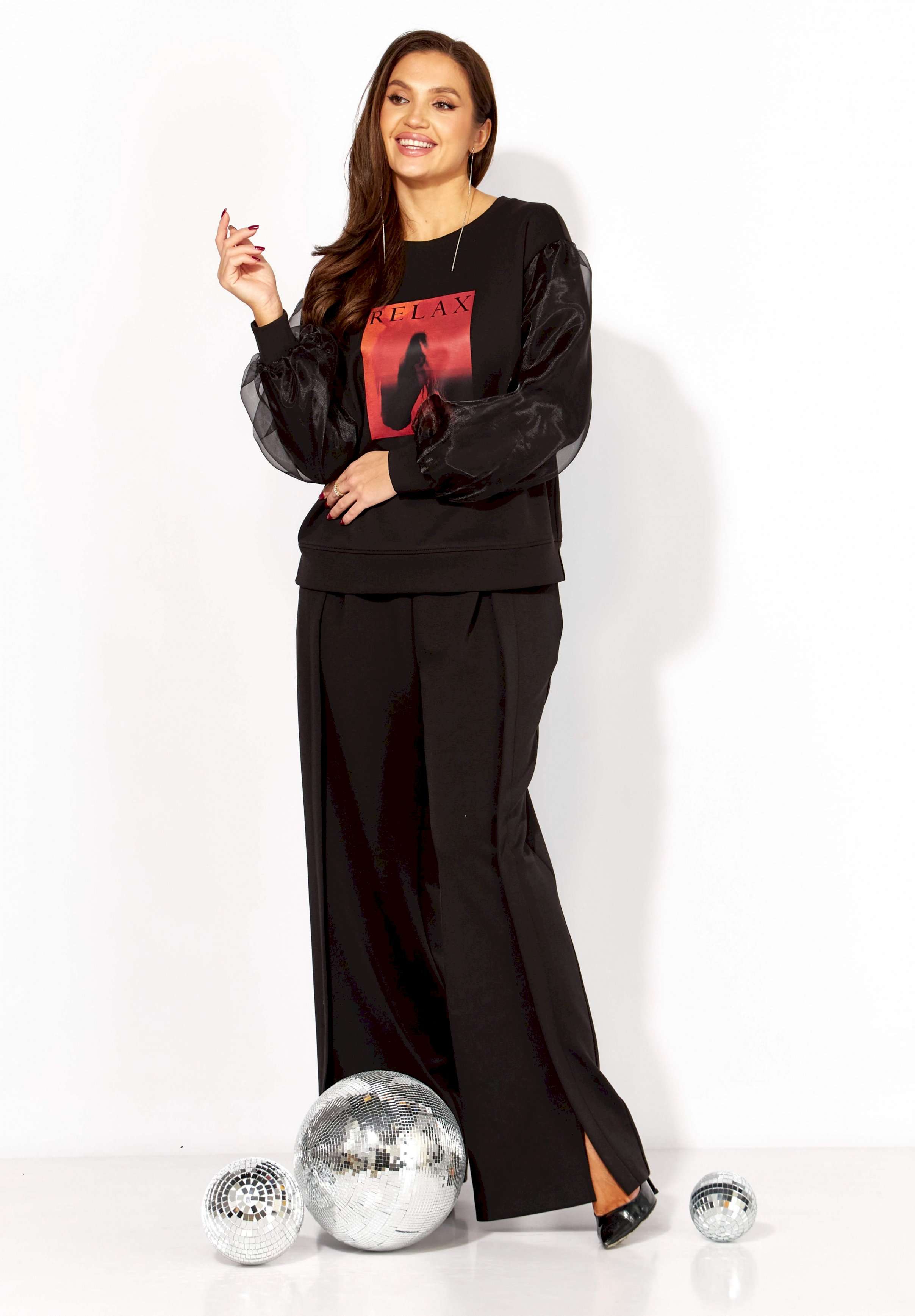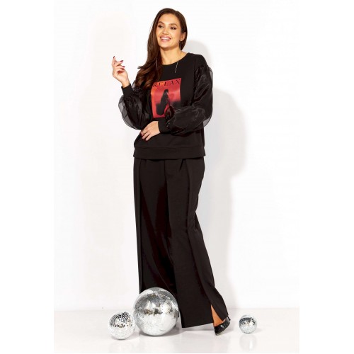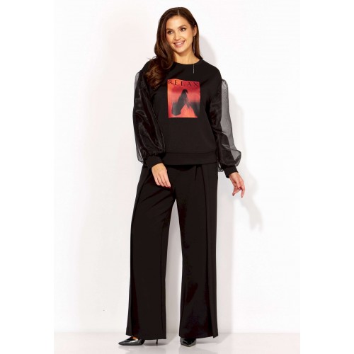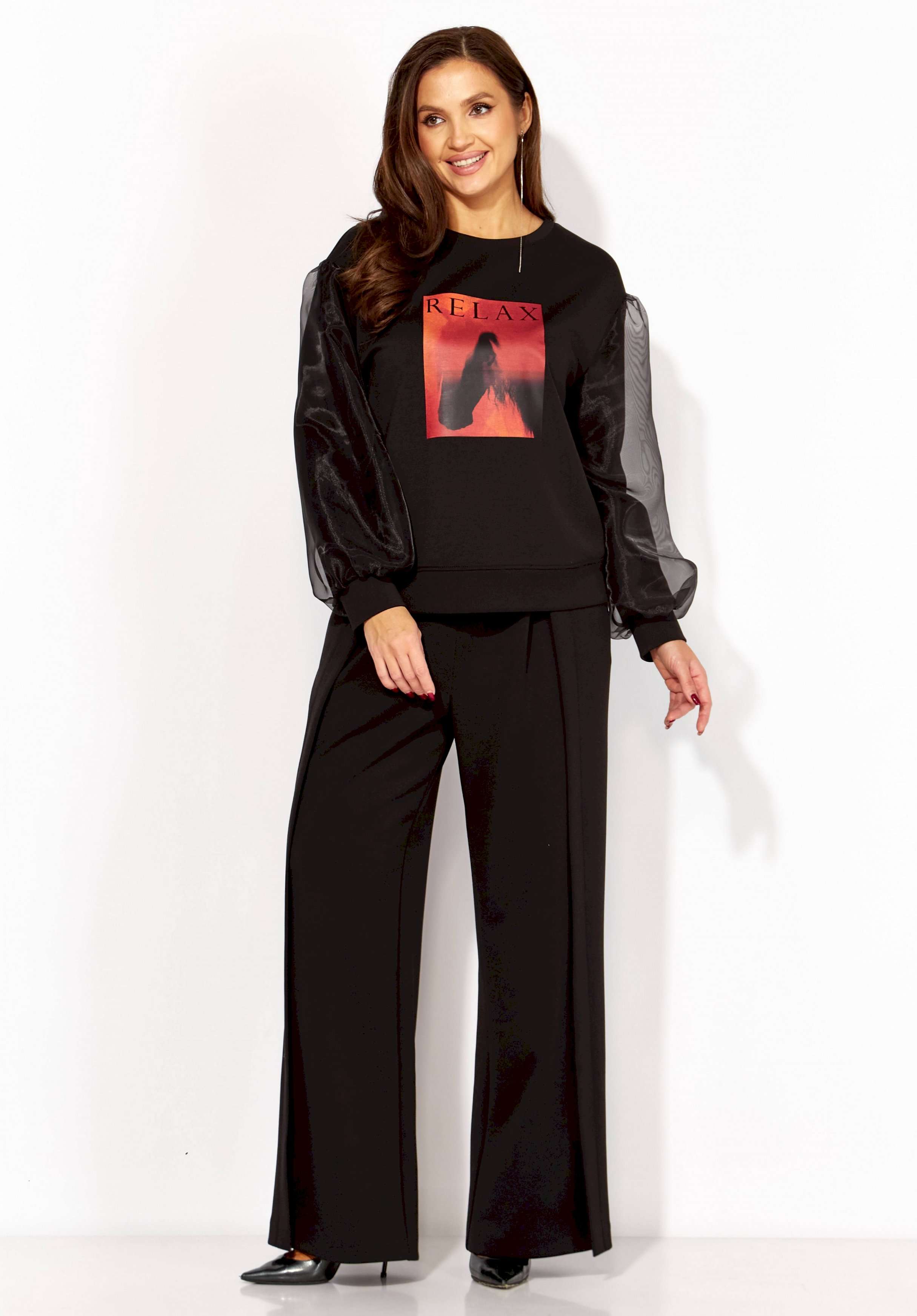 Комплект женский, 2х предметный, состоящий из джемпера и брюк, выполнен из трикотажного полотна\"TENSEL\" с отделкой органзой. Джемпер прямого силуэта с длинным рукавом. Рукав со спущенной линией плеча, двойной. Нижний-трикотажное полотно, верхний- объемный, со сборкой по окату и низу, из органзы. По низу манжета. Вырез горловины круглой формы с подрезной бейкой. По низу притачная планка с разрезами по бокам. Перед задекорирован ярким принтом. Брюки прямые, широкие. По переду отлетные наклонные складки, по низу с разрезами. От пояса мягкая складка. Карманы в боковых швах. Пояс притачной, с резинкой по кругу.