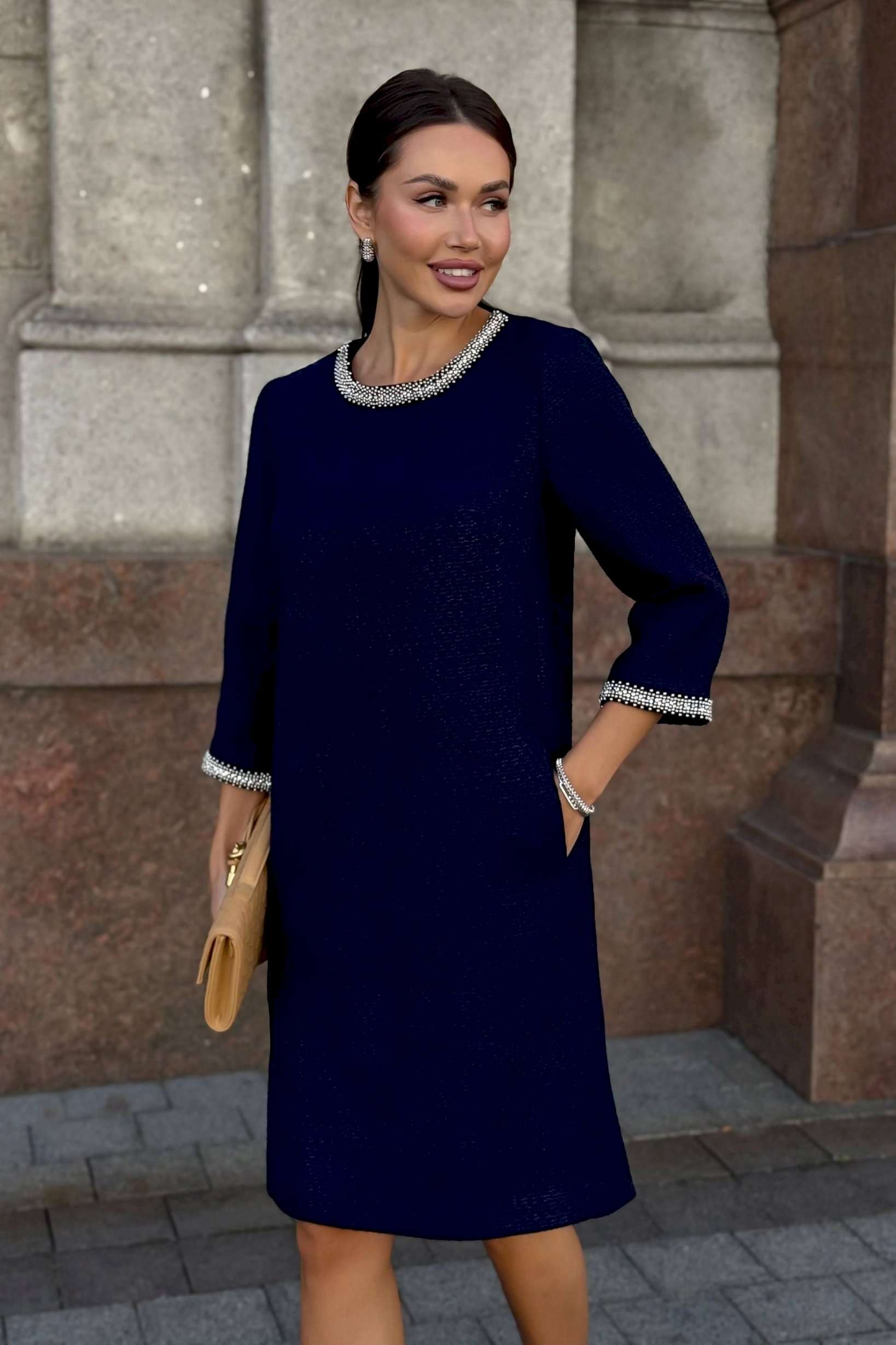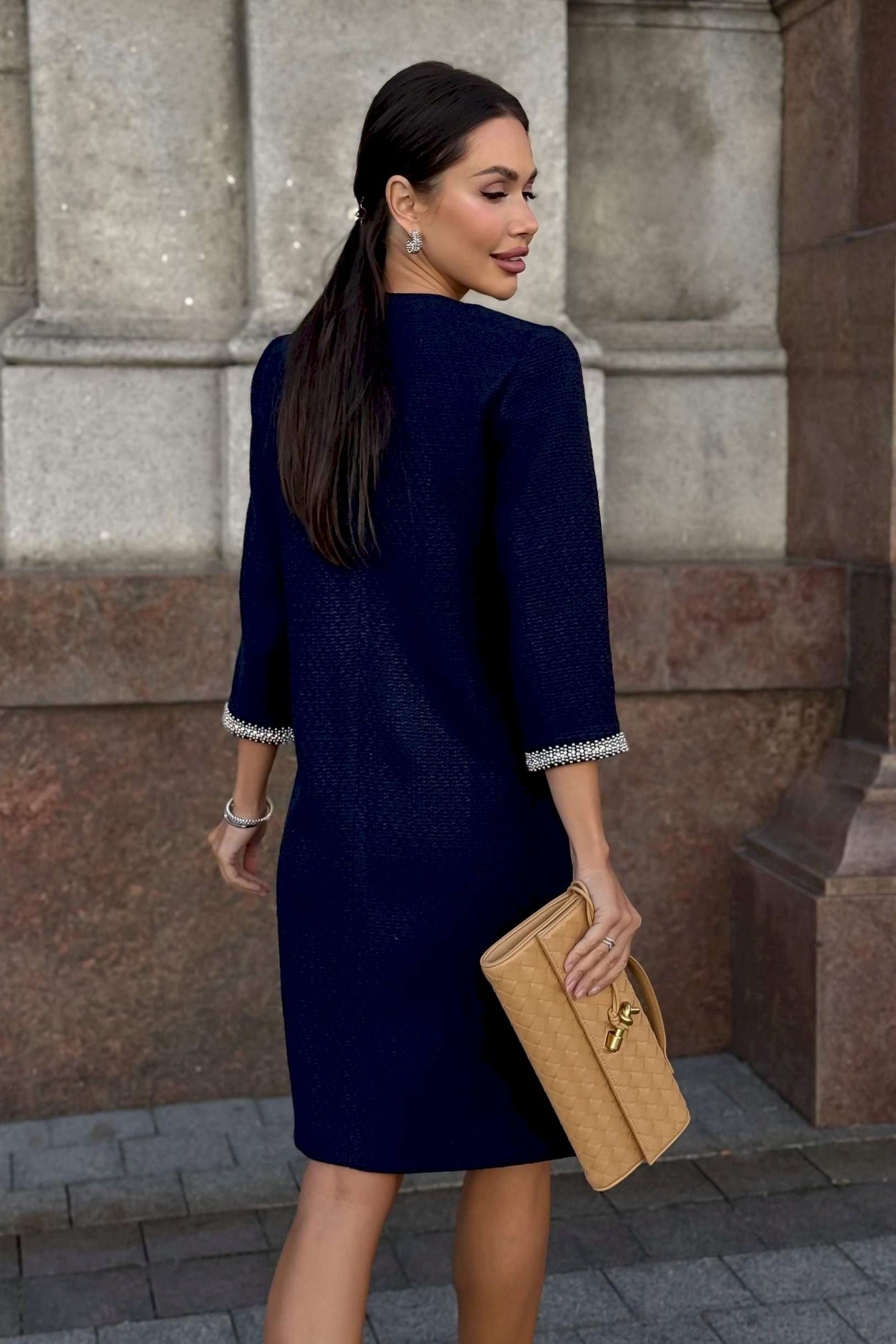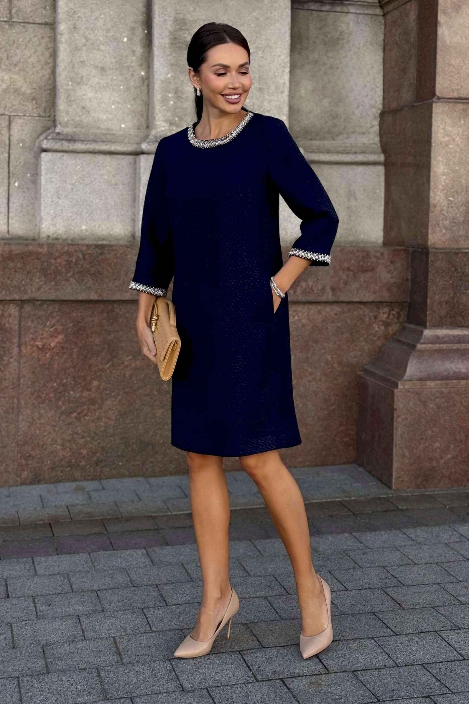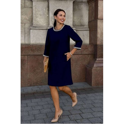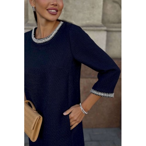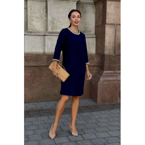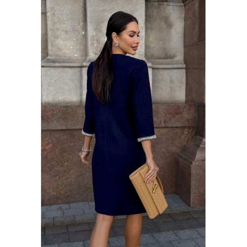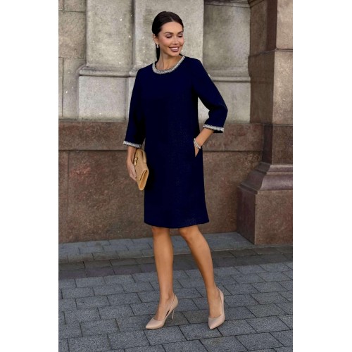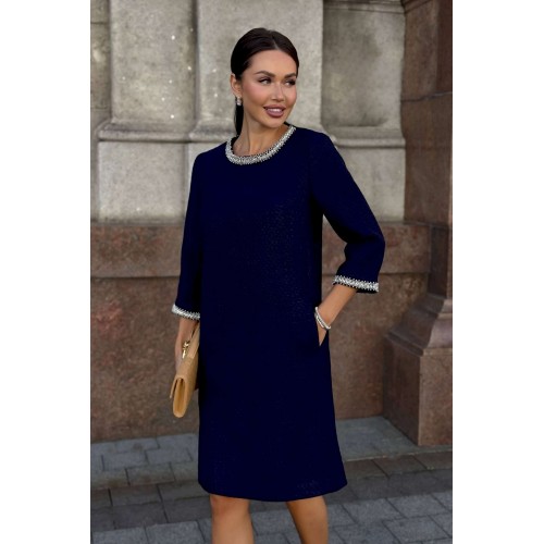 Стильное твидовое платье прямого силуэта — воплощение сдержанной элегантности и утонченного вкуса. Классический оттенок дополняется изысканной отделкой на манжетах и вырезе, что придает образу особую утонченность. Ткань с фактурным плетением подчеркивает качество и премиальность изделия. Удобная длина и свободный крой делают это платье идеальным выбором для деловых встреч, коктейлей или культурных мероприятий. Завершите ансамбль лаконичными аксессуарами и минималистичной обувью, чтобы создать гармоничный и благородный образ. Платье женское прямого силуэта, из костюмной ткани рогожка, на трикотажной подкладке, притачной по низу переда, спинке и низам рукавов. Горловина переда, низа рукавов декорированы отделочной тесьмой, что придает платью нарядный вид (размер и цвет фурнитуры может незначительно отличаться от фото). Перед со смещенными рельефными швами, идущими из пройм до низа, в которых обработан потайной карман в шве. Перед платья с нагрудными вытачками от рельефов, с притачной планкой с отделочной тесьмой по горловине переда. Спинка со средним швом, в верхней части которого обработана застежка на потайную тесьму-молнию. Боковые швы переда и спинки с разрезами от низа по 17,0 см. Горловина переда и спинки круглой формы, обтачная. Рукава втачные, двухшовные, длиной ¾, с притачными планками с отделочной тесьмой по низу рукавов.