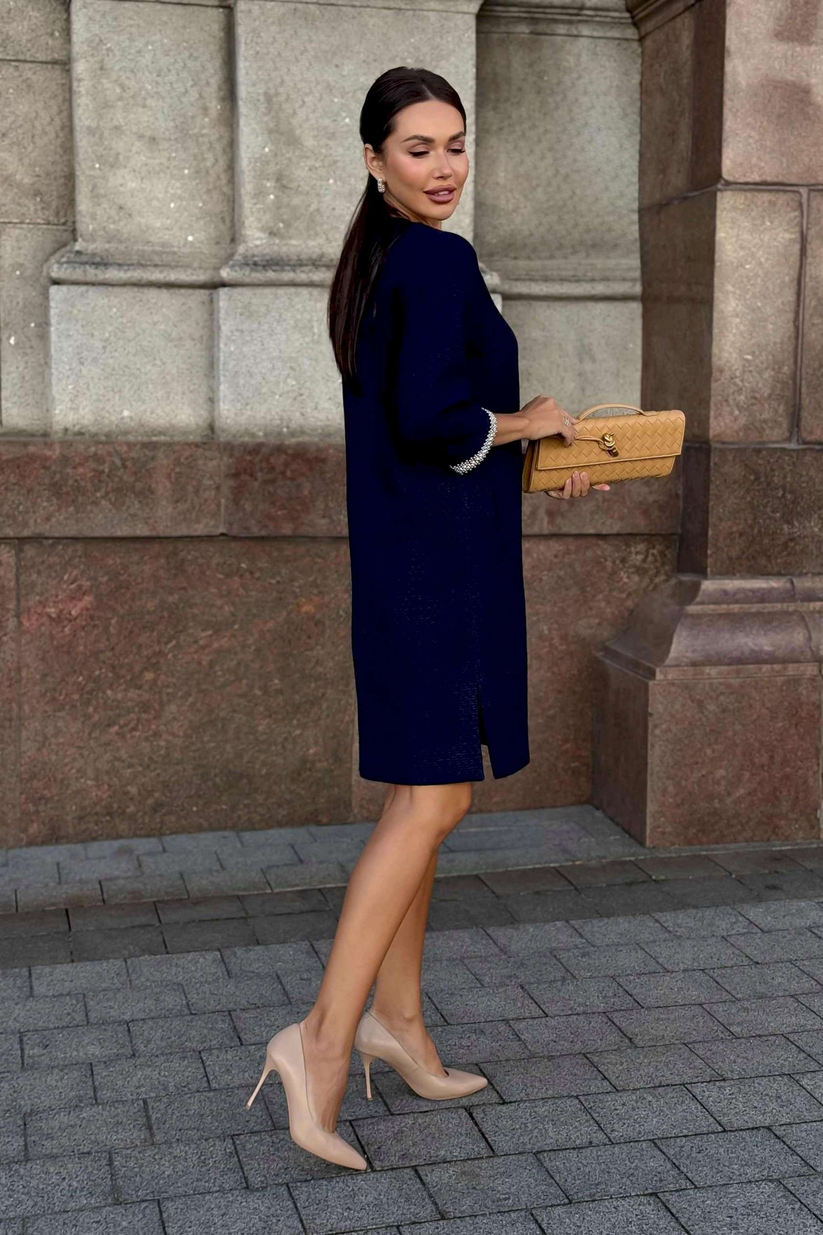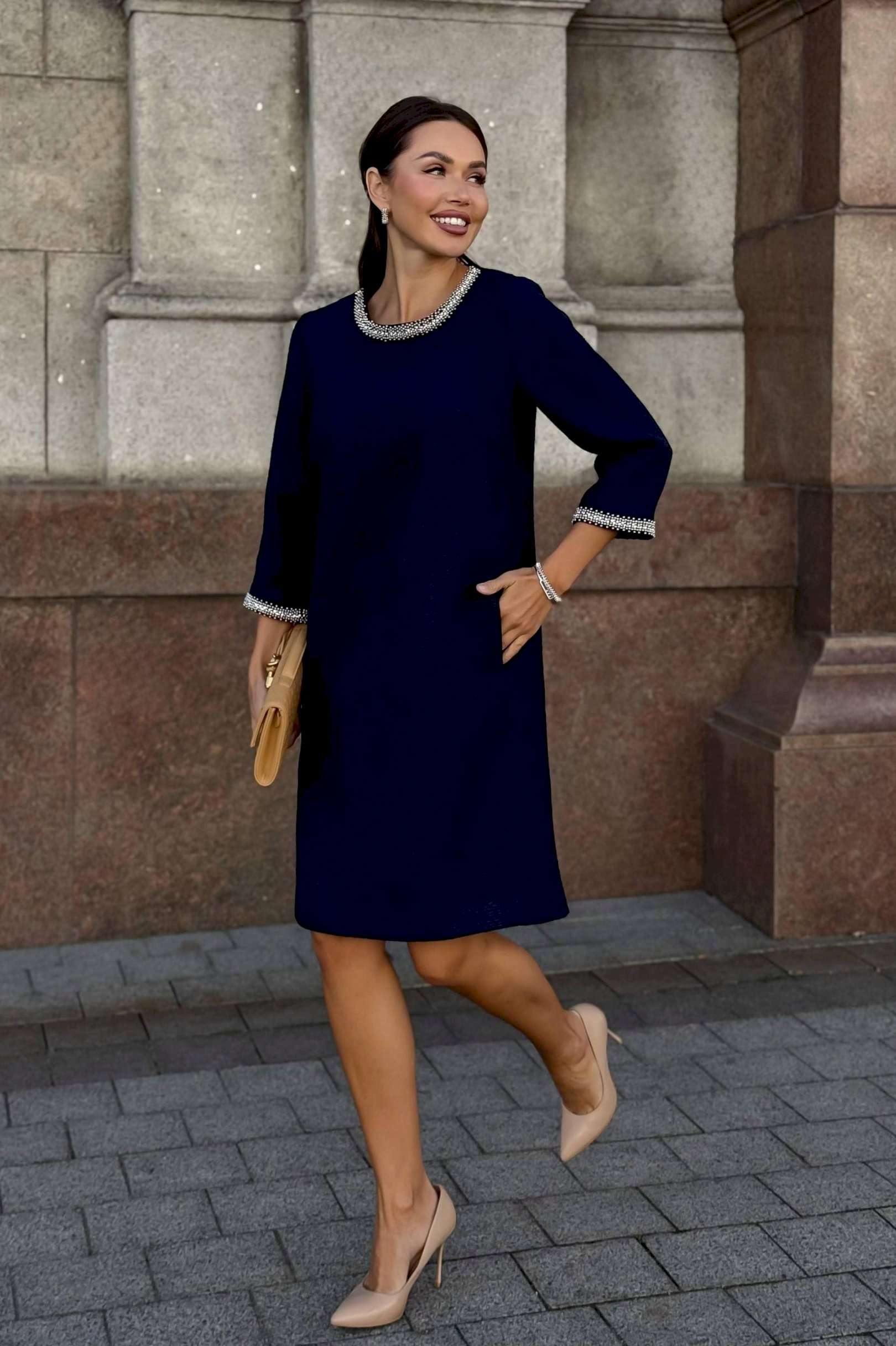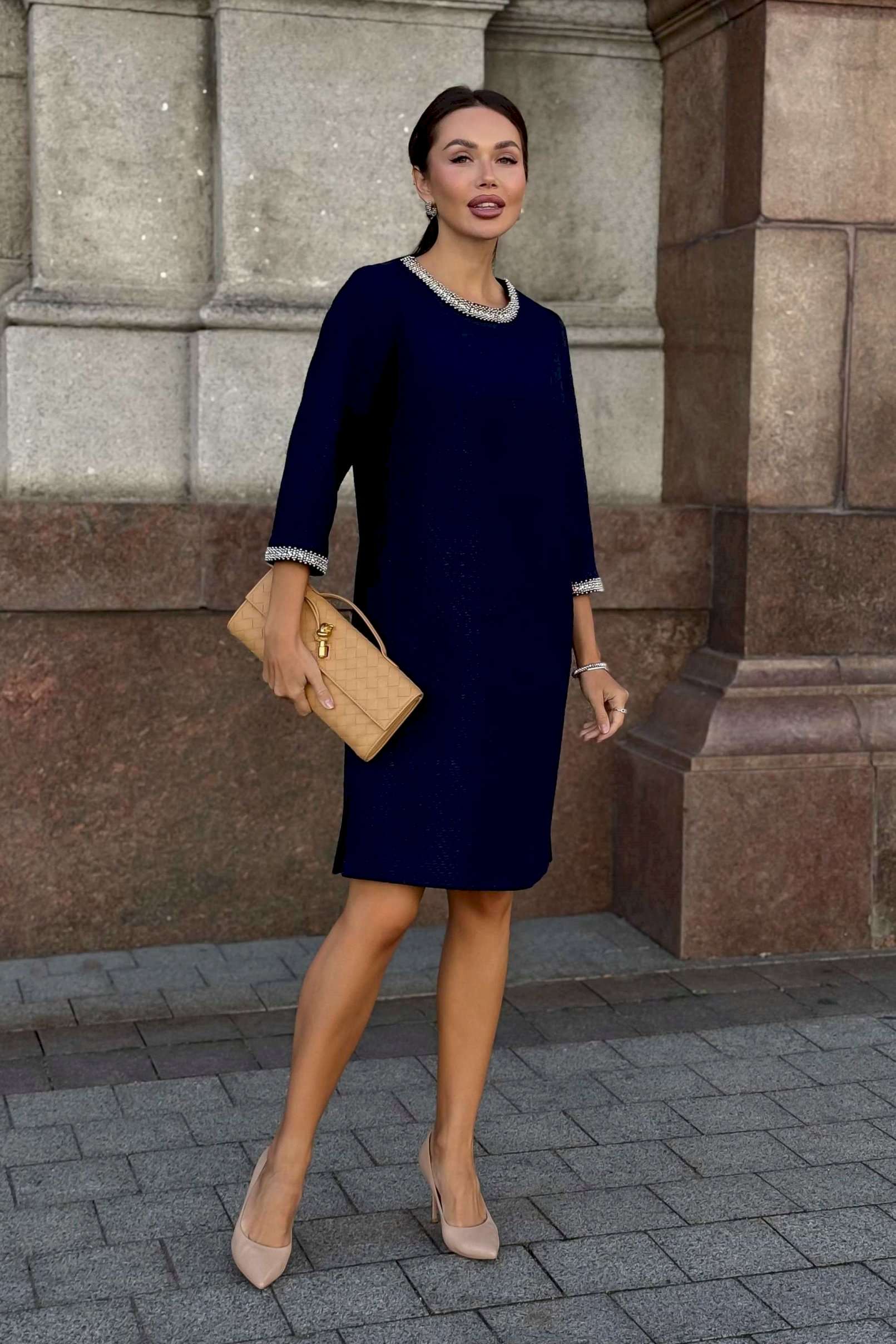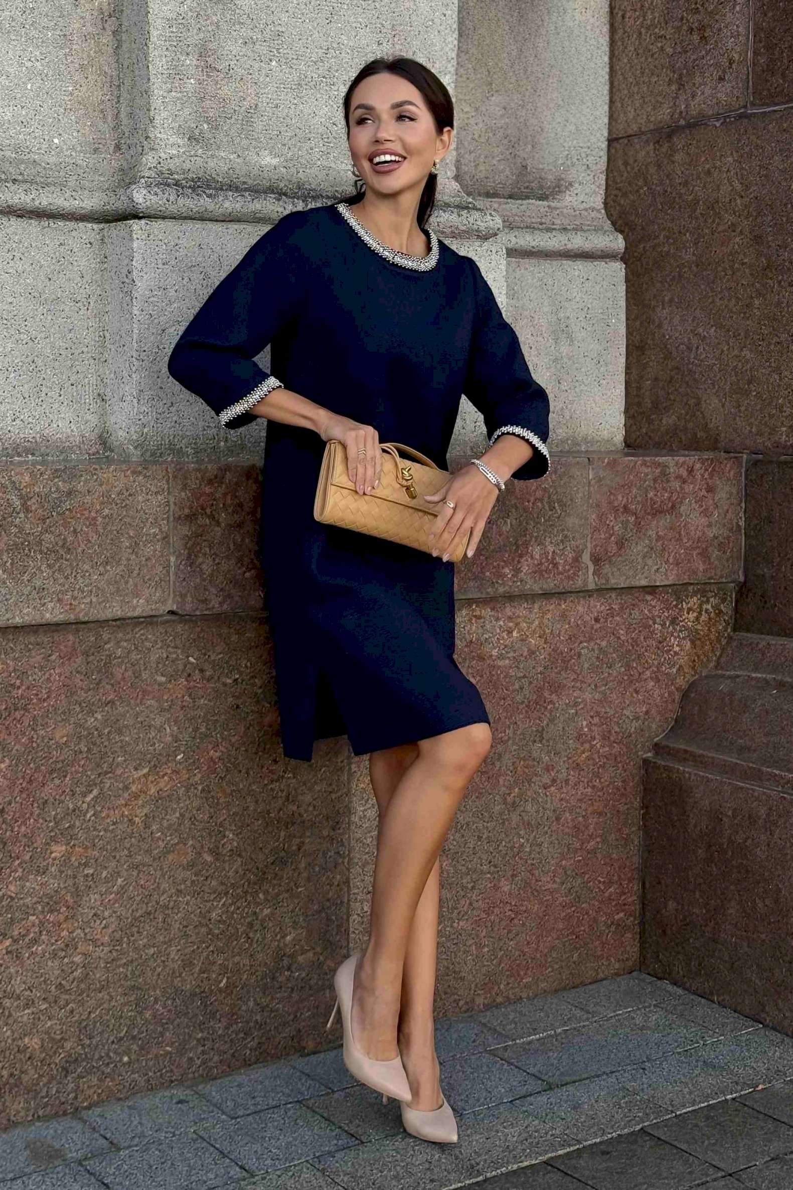 Стильное твидовое платье прямого силуэта — воплощение сдержанной элегантности и утонченного вкуса. Классический оттенок дополняется изысканной отделкой на манжетах и вырезе, что придает образу особую утонченность. Ткань с фактурным плетением подчеркивает качество и премиальность изделия. Удобная длина и свободный крой делают это платье идеальным выбором для деловых встреч, коктейлей или культурных мероприятий. Завершите ансамбль лаконичными аксессуарами и минималистичной обувью, чтобы создать гармоничный и благородный образ. Платье женское прямого силуэта, из костюмной ткани рогожка, на трикотажной подкладке, притачной по низу переда, спинке и низам рукавов. Горловина переда, низа рукавов декорированы отделочной тесьмой, что придает платью нарядный вид (размер и цвет фурнитуры может незначительно отличаться от фото). Перед со смещенными рельефными швами, идущими из пройм до низа, в которых обработан потайной карман в шве. Перед платья с нагрудными вытачками от рельефов, с притачной планкой с отделочной тесьмой по горловине переда. Спинка со средним швом, в верхней части которого обработана застежка на потайную тесьму-молнию. Боковые швы переда и спинки с разрезами от низа по 17,0 см. Горловина переда и спинки круглой формы, обтачная. Рукава втачные, двухшовные, длиной ¾, с притачными планками с отделочной тесьмой по низу рукавов.