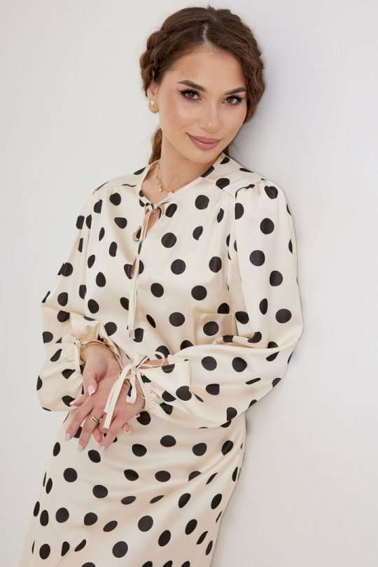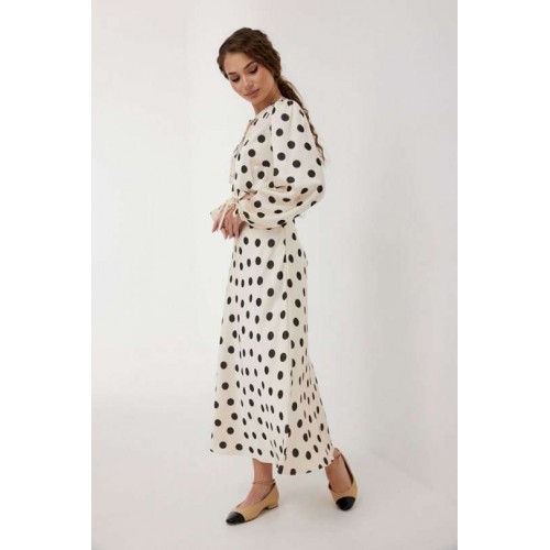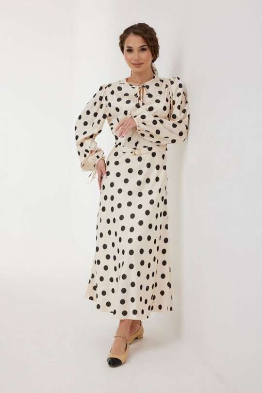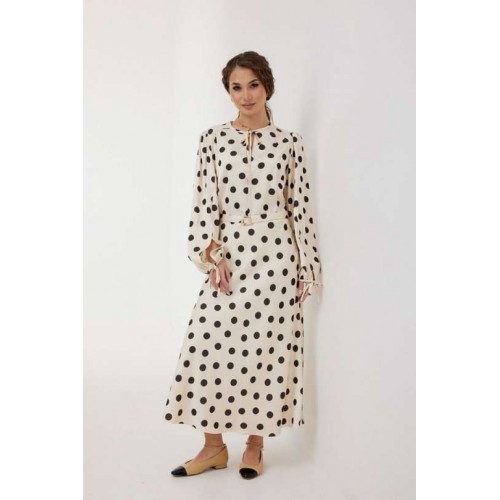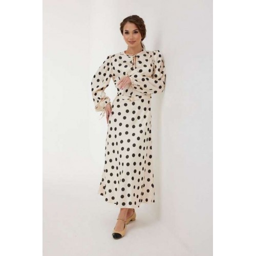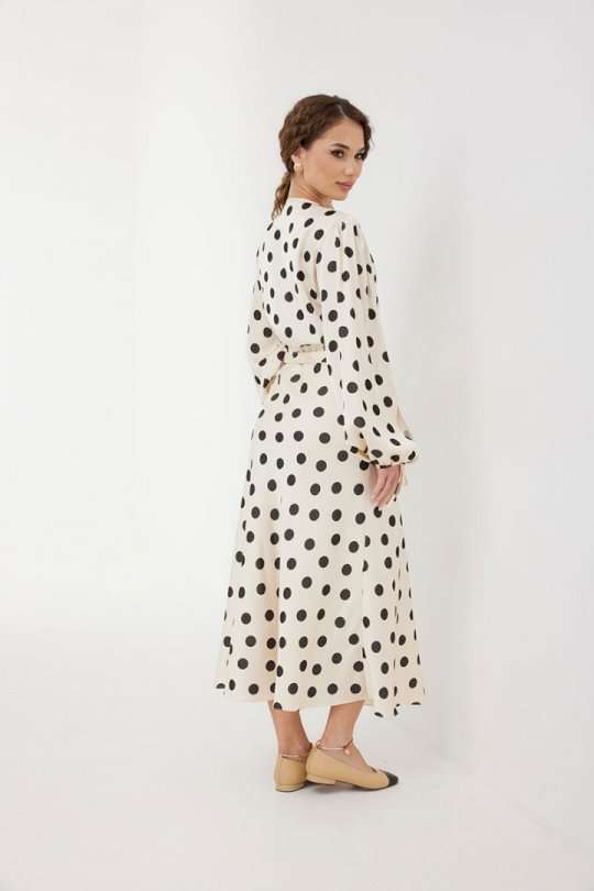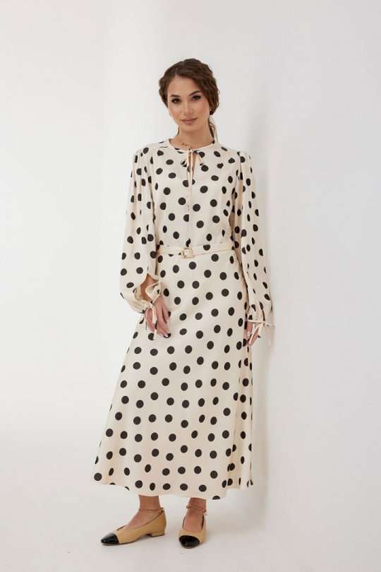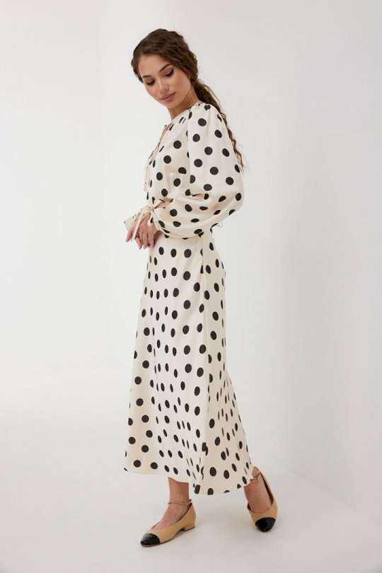 Платье женское нарядное, полуприлегающего силуэта, отрезное по линии талии, юбка косого кроя, на подкладке, расширенная книзу.Рукав втачной со сборкой в верхней части и по низу, по переднему шву рукава обработан разрез, низ рукава окантован бейкой, переходящей в завязки.Лиф с переходящим плечевым швом на перед, нагрудными вытачками, по спинке - с талиевыми вытачками, по плечевым швам небольшая сборка, по переду средний шов, горловина окантована бейкой, переходящей в завязки. Длина платья ниже колена. Длина рукава 63 см. 44 р-р: ОГ - 98 см., ОТ - 77 см., ОБ - 152 см. 46 р-р: ОГ - 102 см., ОТ - 81 см., ОБ - 158 см. 48 р-р: ОГ - 106 см., ОТ - 85 см., ОБ - 164 см. 50 р-р: ОГ - 110 см., ОТ - 89 см., ОБ - 170 см. 52 р-р: ОГ - 114 см., ОТ - 93 см., ОБ - 174 см.