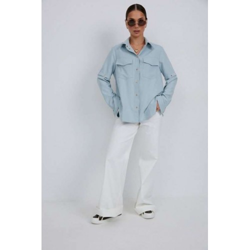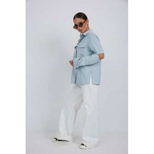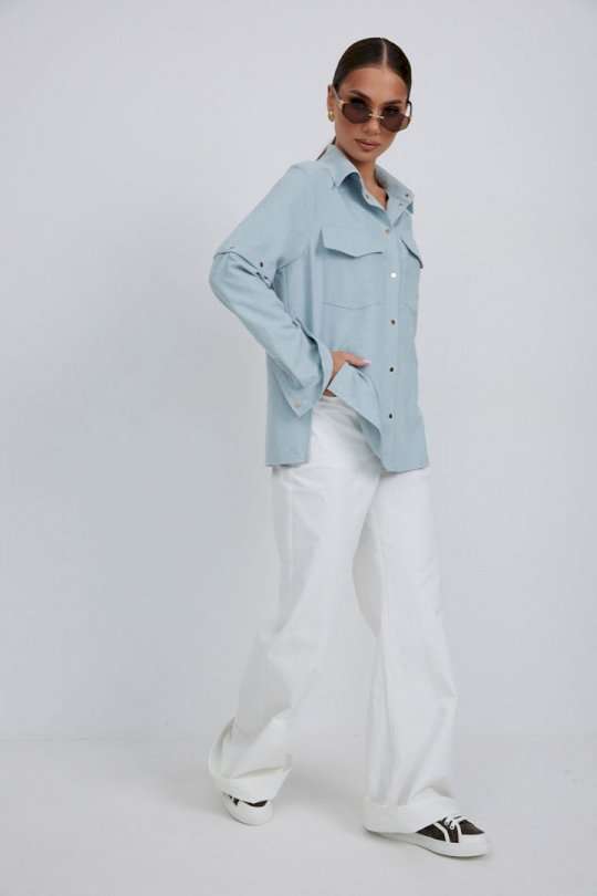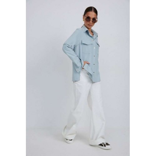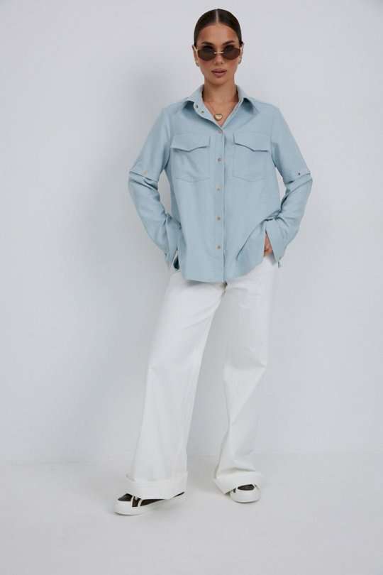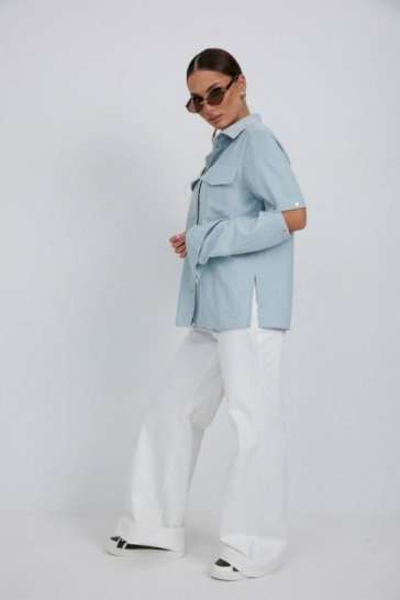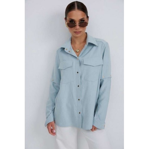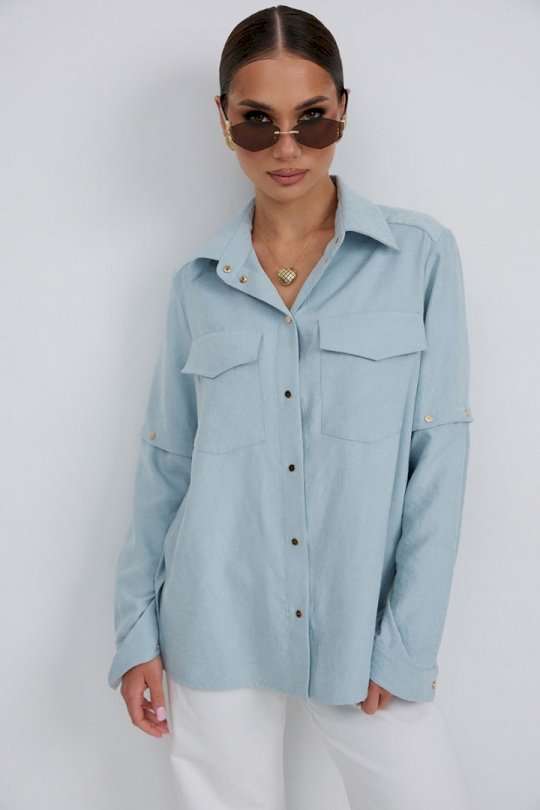 Блузка из плательно-блузочной ткани свободного силуэта. Спинка с кокеткой и встречной складкой. По переду центральная застежка на кнопки, сверху накладные карманы с клапанами. Втачной рукав с отстегивающейся нижней частью. По низу рукава манжет с кнопкой. Воротник рубашечный со стойкой. Длина рукава 63 см. 44 р-р: ОГ - 116 см., ОТ - 114 см., ОБ - 114 см. 46 р-р: ОГ - 120 см., ОТ - 118 см., ОБ - 118 см. 48 р-р: ОГ - 124 см., ОТ - 122 см., ОБ - 122 см. 50 р-р: ОГ - 128 см., ОТ - 126 см., ОБ - 126 см. 52 р-р: ОГ - 132 см., ОТ - 130 см., ОБ - 130 см.