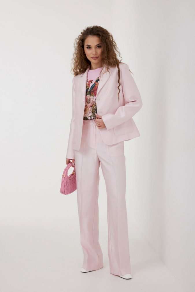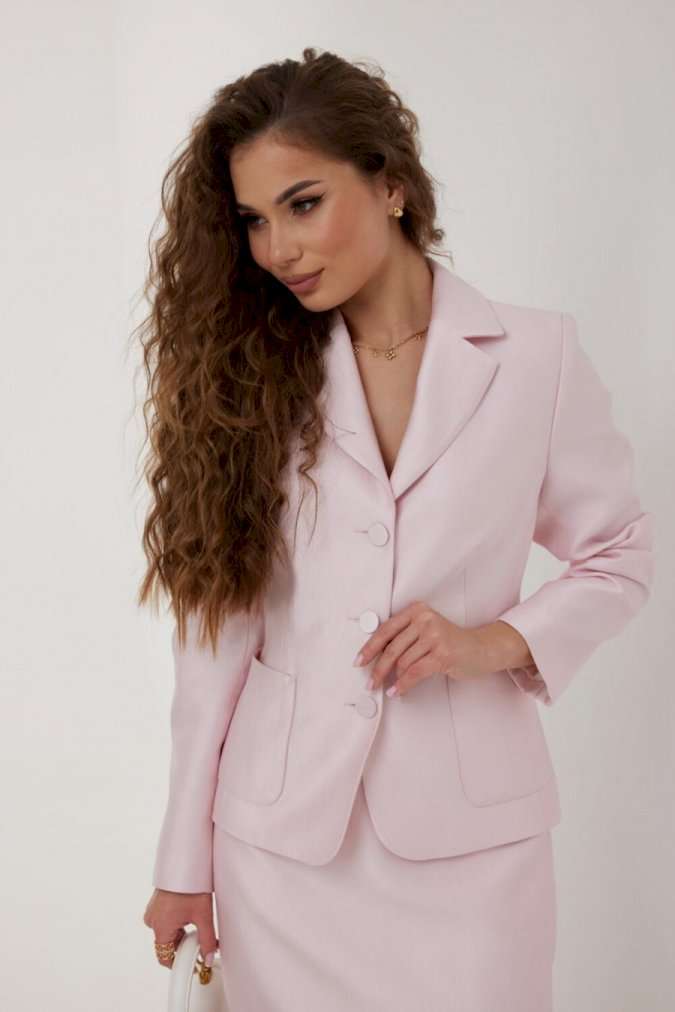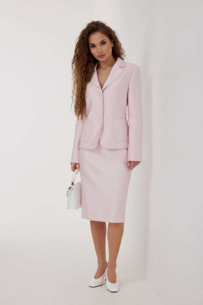 Жакет из костюмно-плательной ткани полуприлегающего силуэта, с центральной застежкой на три петли и обтяжные пуговицы. Перед с нагрудной вытачкой, отрезным бочком и накладным карманом. Спинка с отрезным бочком и средним швом. Рукав втачной двухшовный. Воротник пиджачный. Жакет на подкладке с плечевыми накладками. Длина жакета 60 см. Длина рукава 63 см. Измерения по готовому изделию: 44 р-р: ОГ - 96 см., ОТ - 86 см., ОБ - 104 см. 46 р-р: ОГ - 100 см., ОТ - 90 см., ОБ - 108 см. 48 р-р: ОГ - 104 см., ОТ - 94 см., ОБ - 112 см. 50 р-р: ОГ - 108 см., ОТ - 98 см., ОБ - 116 см. 52 р-р: ОГ - 112 см., ОТ - 102 см., ОБ - 120 см.
