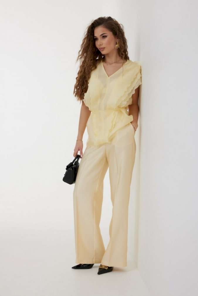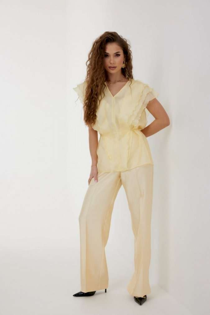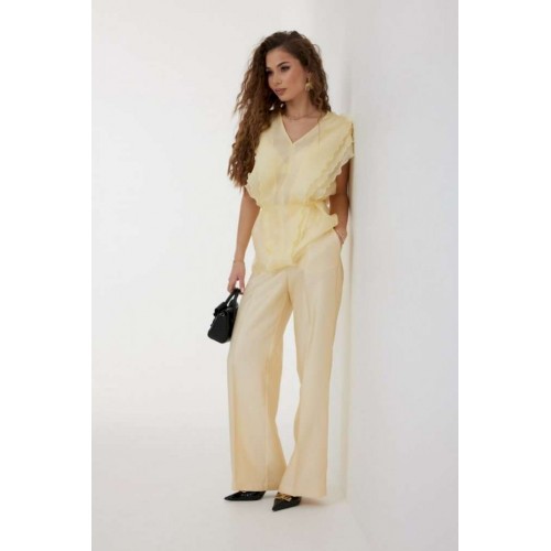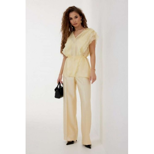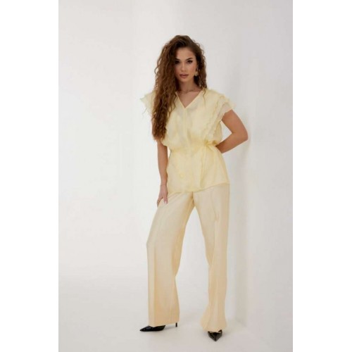Брюки из костюмно-плательной ткани, прямые со стрелками, полной длины. Средняя посадка, пояс притачной, застежка спереди на молнию и пуговицу. По переду боковые карманы. Длина по боковому шву - 107 см. Длина по шаговому шву - 81 см. Измерения по готовому изделию: 44 р-р: ОТ - 72 см., ОБ - 98 см. 46 р-р: ОТ - 76 см., ОБ - 102 см. 48 р-р: ОТ - 80 см., ОБ - 106 см. 50 р-р: ОТ - 84 см., ОБ - 110 см. 52 р-р: ОТ - 88 см., ОБ - 114 см.