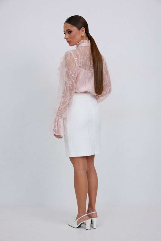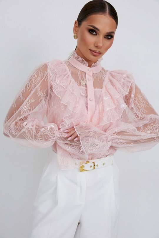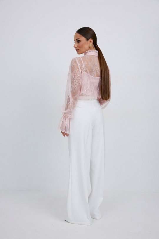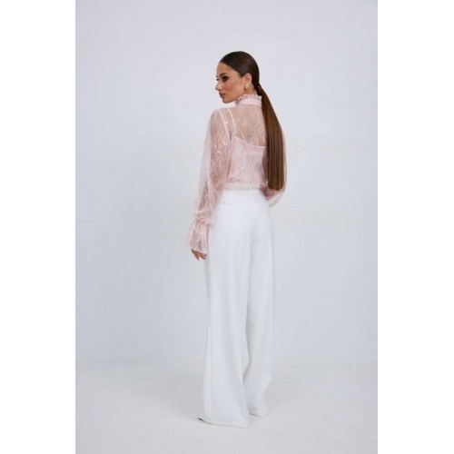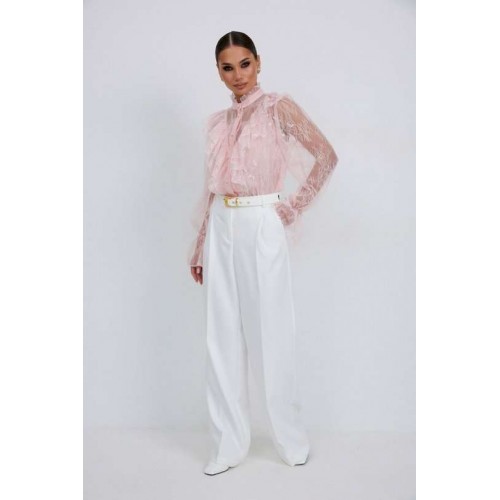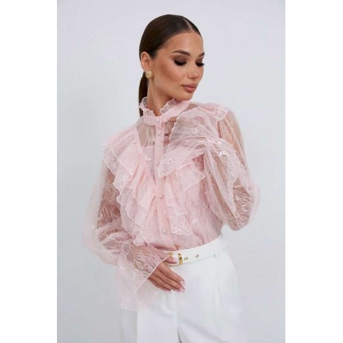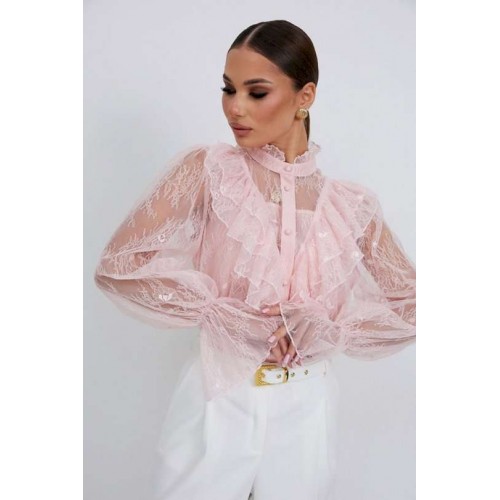 Блузка женская свободного силуэта, из легчайшего кружева. По переду подрез с воланами. Застежка на планку с декоративными пуговицами. Воротник - стойка с небольшой рюшей. Рукав длинный объемный со сборкой в верхней части, в нижней части рукав собран на эластичную тесьму и образует волан. В комплект с блузкой предлагается топ на регулируемых бретелях. Длина блузки 60 см. Длина топа по спинке - 34 см. Длина рукава с учетом напуска - 69 см. Измерения по готовому изделию: 44 р-р: ОГ - 112 см., ОТ - 108 см., ОБ - 114 см. ; Топ ОГ - 92 см., ОБ - 92 см., ОТ - 92 см. 46 р-р: ОГ - 116 см., ОТ - 112 см., ОБ - 118 см.; Топ ОГ - 96 см., ОБ - 96 см., ОТ - 96 см. 48 р-р: ОГ - 120 см., ОТ - 116 см., ОБ - 122 см.; Топ ОГ - 100 см., ОБ - 100 см., ОТ - 100 см. 50 р-р: ОГ - 124 см., ОТ - 120 см., ОБ - 126 см.; Топ ОГ - 104 см., ОБ - 104 см., ОТ - 104 см. 52 р-р: ОГ - 128 см., ОТ - 124 см., ОБ - 130 см.; Топ ОГ - 108 см., ОБ - 108 см., ОТ - 108 см.