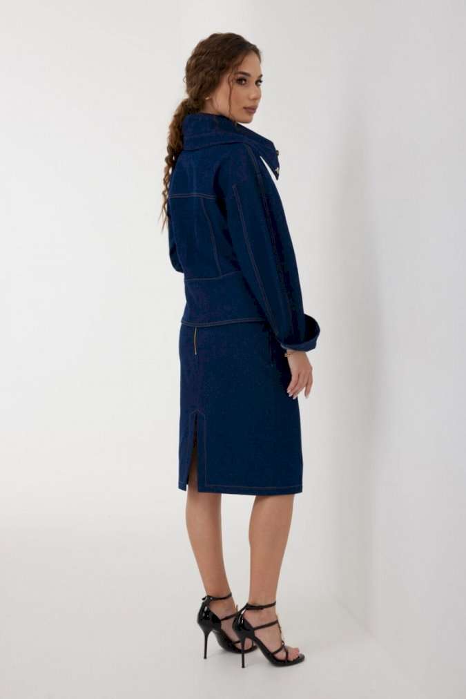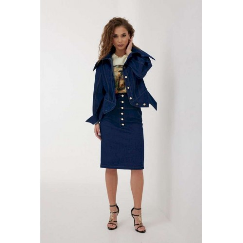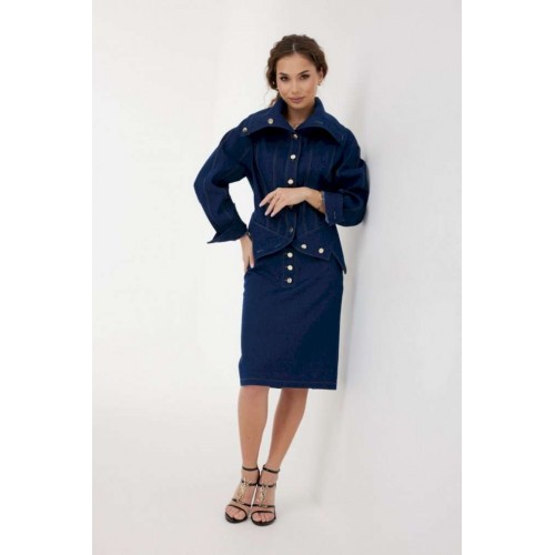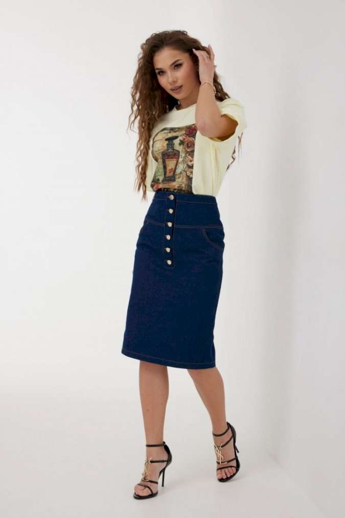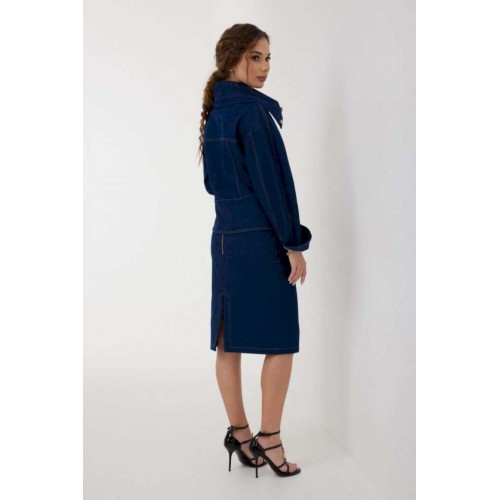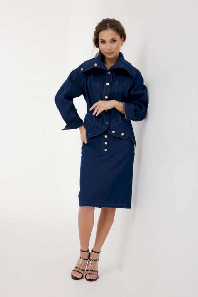 Юбка женская из джинсовой ткани, длиной чуть ниже уровня колена, зауженная книзу. Пояс притачной, застежка на декоративную молнию сзади, по переду и спинке широкие кокетки, спереди боковые карманы, а также имитация застежки на планку с джинсовыми пуговицами. По среднему шву спинки разрез. Все швы отстрочены контрастными нитками. Длина юбки без пояса - 61 см. Измерения по готовому изделию: 44 р-р: ОТ - 72 см., ОБ - 96 см. 46 р-р: ОТ - 76 см., ОБ - 100 см. 48 р-р: ОТ - 80 см., ОБ - 104 см. 50 р-р: ОТ - 84 см., ОБ - 108 см. 52 р-р: ОТ - 88 см., ОБ - 112 см.