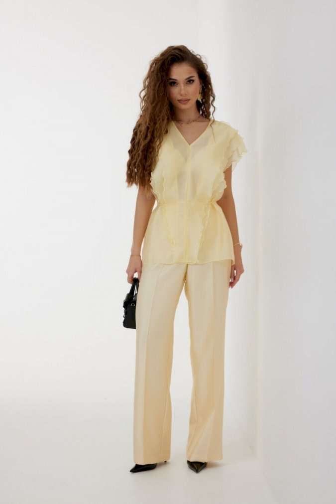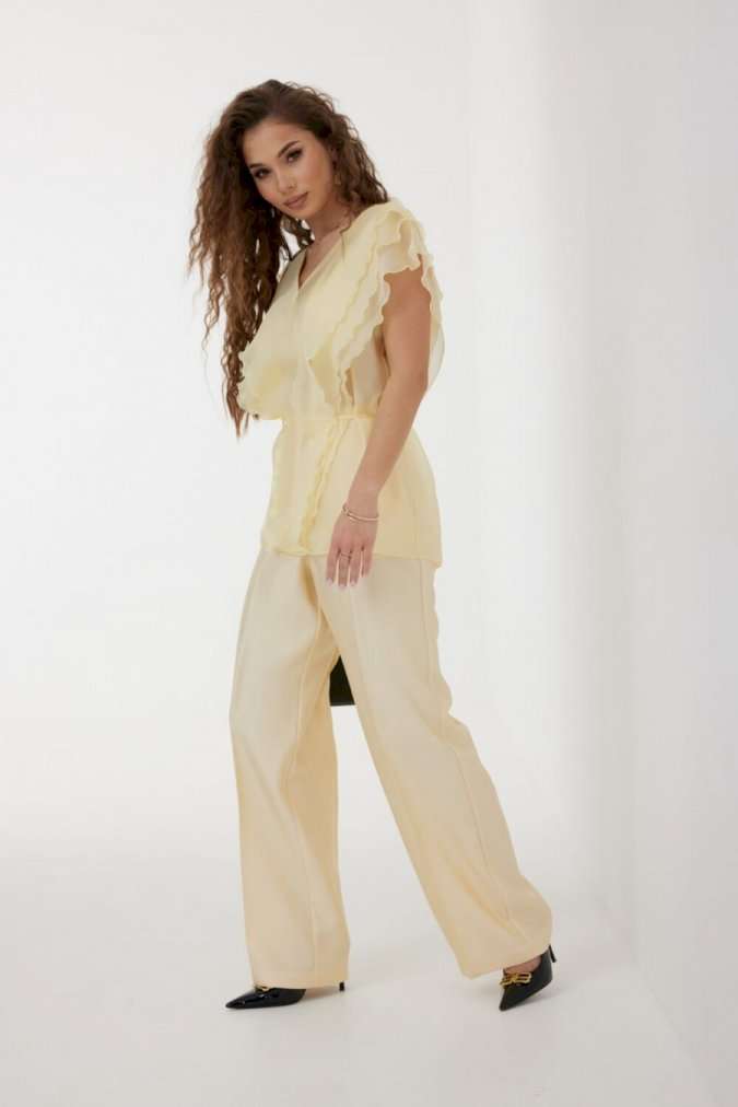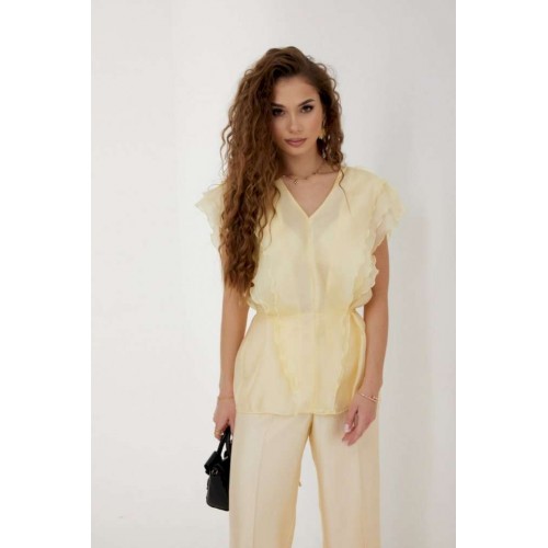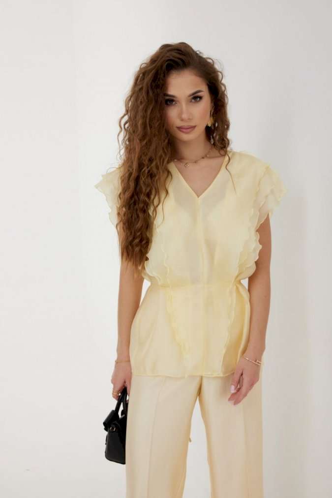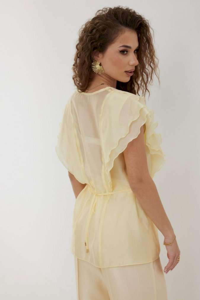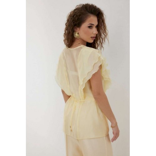 Блузка женская прямого силуэта, длиной до уровня бедер, с воланами, образующими рукава-«крылышки», по переду воланы до низа, по спинке входят в рельефы на уровне талии. Вырез горловины V-образной формы. Спереди под верхний волан вставлен пояс-шнурок, завязывающийся вокруг талии. Длина 68 см. Измерения по готовому изделию: 44 р-р: ОГ - 96 см., ОТ - 98 см., ОБ - 106 см. 46 р-р: ОГ - 100 см., ОТ - 102 см., ОБ - 110 см. 48 р-р: ОГ - 104 см., ОТ - 106 см., ОБ - 114 см. 50 р-р: ОГ - 108 см., ОТ - 110 см., ОБ - 118 см. 52 р-р: ОГ - 112 см., ОТ - 114 см., ОБ - 122 см.