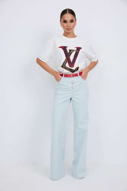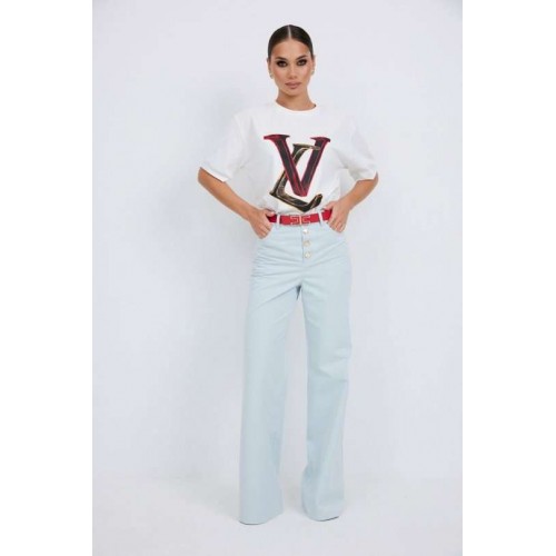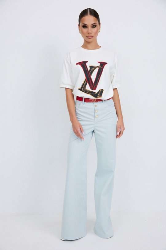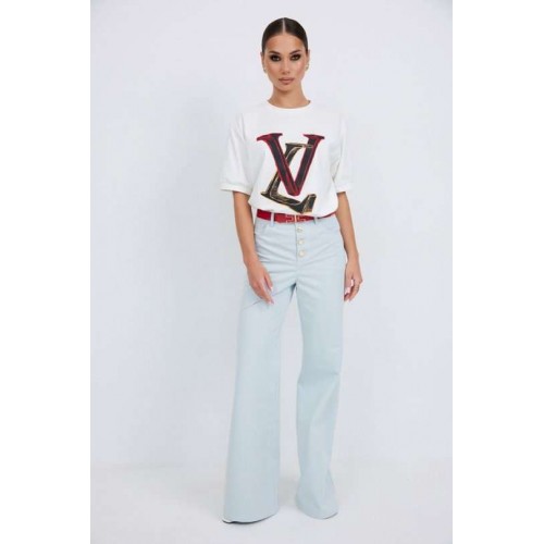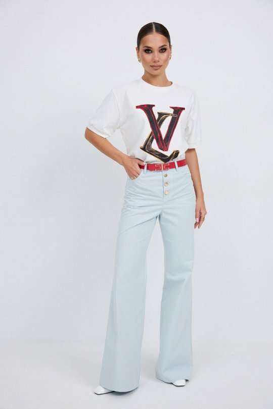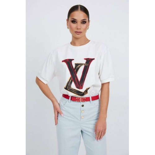 Джемпер прямого силуэта из трикотажного полотна. Горловина круглой формы с бейкой. Расширенная линия плеча. Рукав короткий по низу с манжетой. Перед декорирован печатью. Длина рукава 22 см. 44 р-р: ОГ - 100 см., ОТ - 98 см., ОБ - 102 см. 46 р-р: ОГ - 104 см., ОТ - 102 см., ОБ - 106 см. 48 р-р: ОГ - 108 см., ОТ - 106 см., ОБ - 110 см. 50 р-р: ОГ - 112 см., ОТ - 110 см., ОБ - 114 см. 52 р-р: ОГ - 116 см., ОТ - 114 см., ОБ - 118 см.