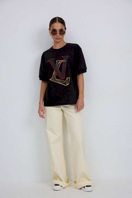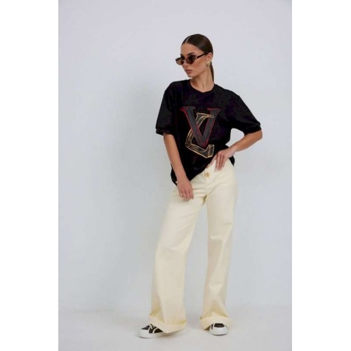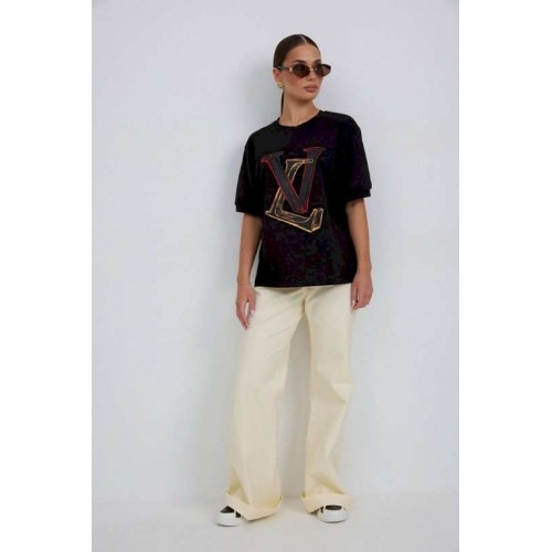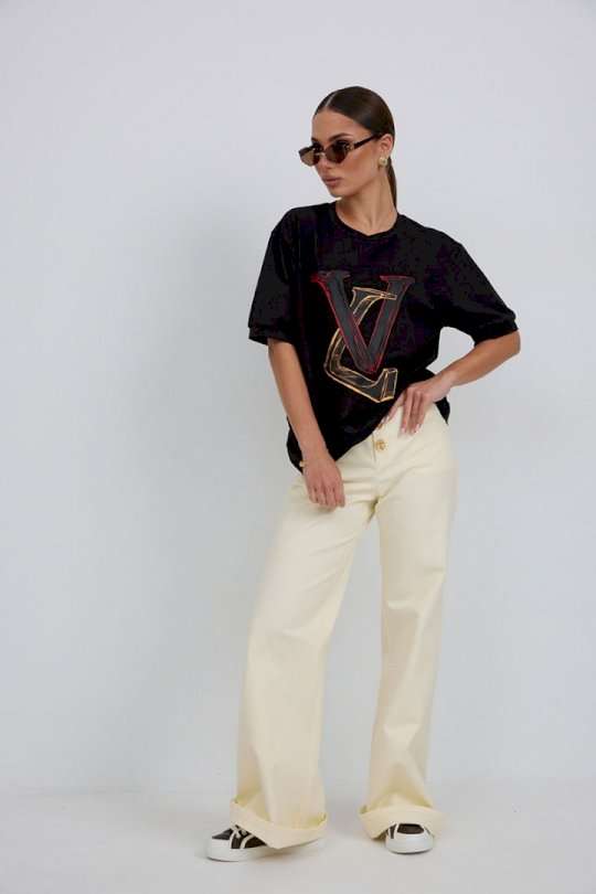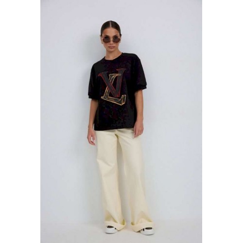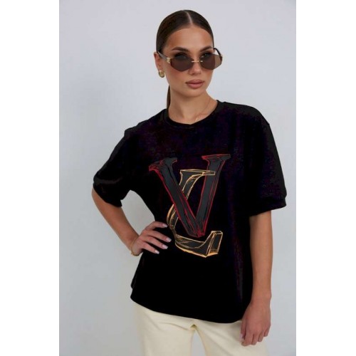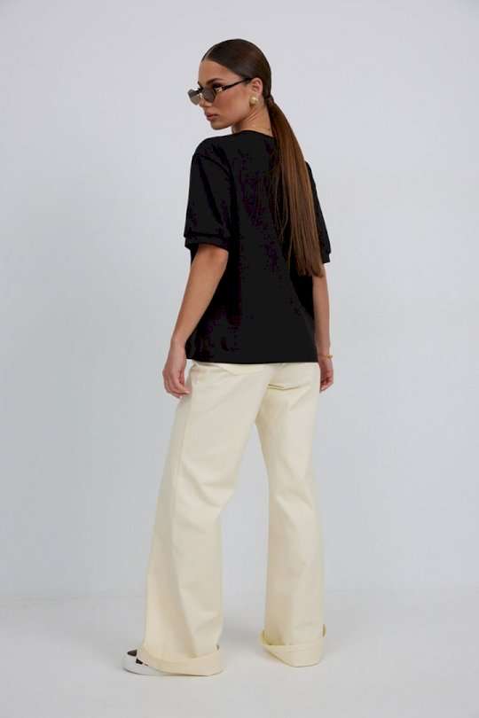 Джемпер прямого силуэта из трикотажного полотна. Горловина круглой формы с бейкой. Расширенная линия плеча. Рукав короткий по низу с манжетой. Перед декорирован печатью. Длина рукава 22 см. 44 р-р: ОГ - 100 см., ОТ - 98 см., ОБ - 102 см. 46 р-р: ОГ - 104 см., ОТ - 102 см., ОБ - 106 см. 48 р-р: ОГ - 108 см., ОТ - 106 см., ОБ - 110 см. 50 р-р: ОГ - 112 см., ОТ - 110 см., ОБ - 114 см. 52 р-р: ОГ - 116 см., ОТ - 114 см., ОБ - 118 см.