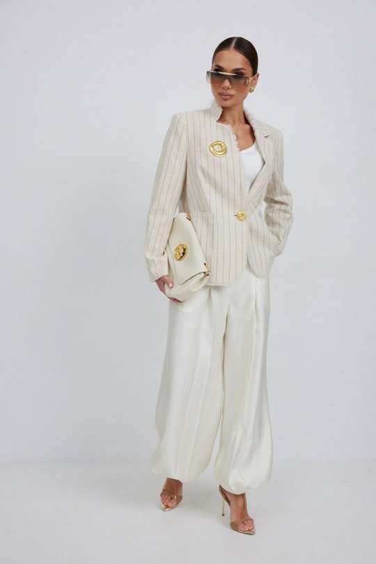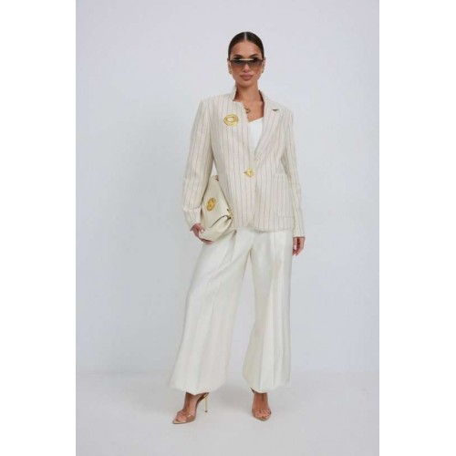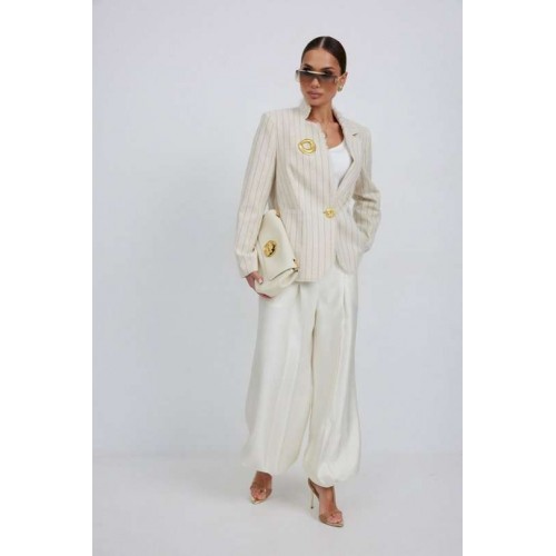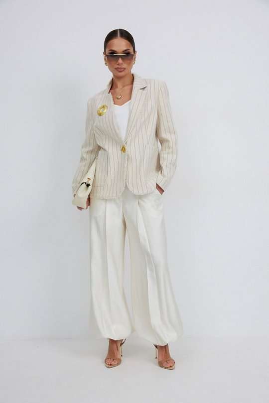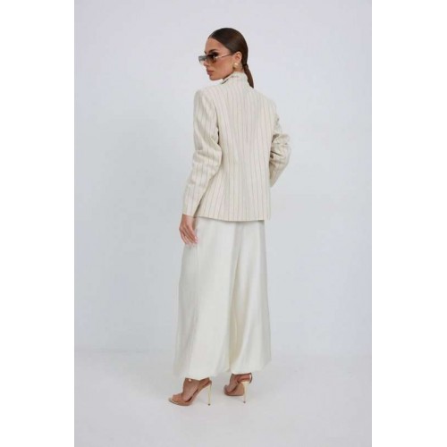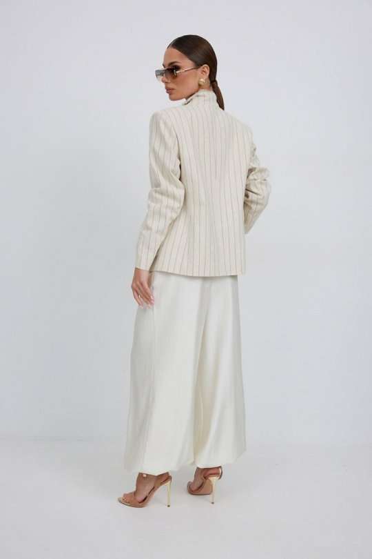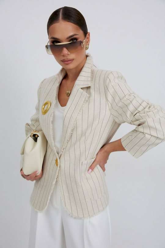 Жакет из льняной ткани в полоску, полуприлегающего силуэта, с центральной застежкой на одну петлю и декоративную пуговицу. Перед с нагрудной вытачкой и накладным карманом. Спинка с отрезным бочком, средним швом. Воротник ассиметричный. Слева - пиджачный, справа- стойка. По краю борта, низу переда, входу в карман и отлету воротника вставлена бахрома. Жакет на подкладке с плечевыми накладками. Длина рукава 62 см. 44 р-р: ОГ - 98 см., ОТ - 92 см., ОБ - 108 см. 46 р-р: ОГ - 102 см., ОТ - 96 см., ОБ - 112 см. 48 р-р: ОГ - 106 см., ОТ - 100 см., ОБ - 116 см. 50 р-р: ОГ - 110 см., ОТ - 104 см., ОБ - 120 см. 52 р-р: ОГ - 114 см., ОТ - 108 см., ОБ - 124 см.