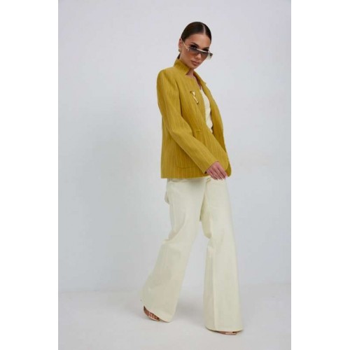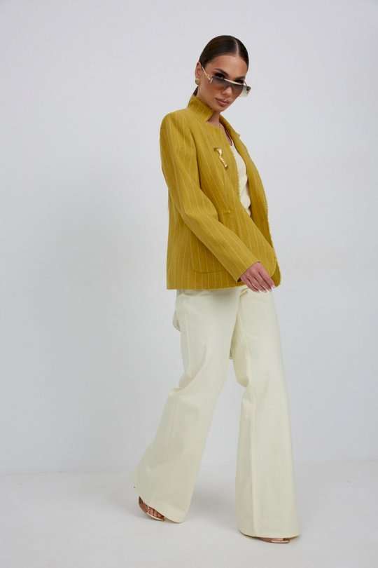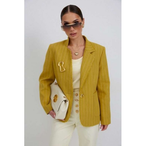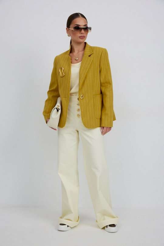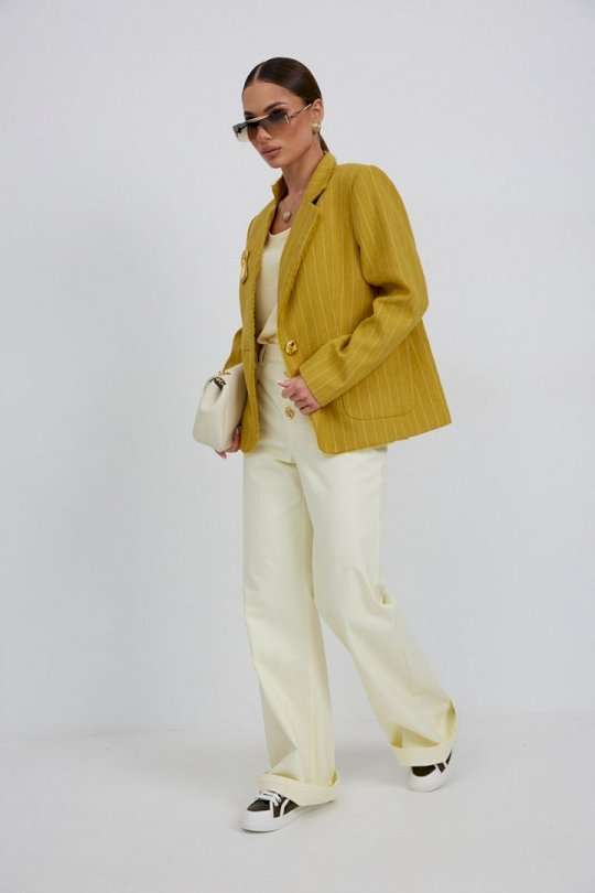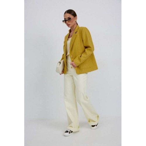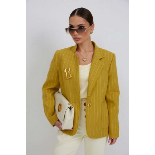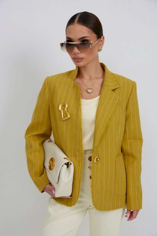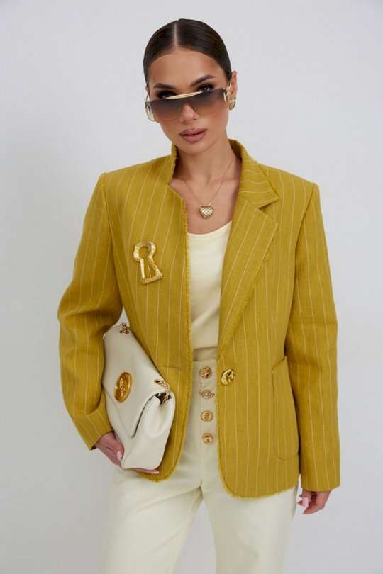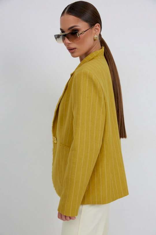 Жакет из льняной ткани в полоску, полуприлегающего силуэта, с центральной застежкой на одну петлю и декоративную пуговицу. Перед с нагрудной вытачкой и накладным карманом. Спинка с отрезным бочком, средним швом. Воротник ассиметричный. Слева - пиджачный, справа- стойка. По краю борта, низу переда, входу в карман и отлету воротника вставлена бахрома. Жакет на подкладке с плечевыми накладками. Длина рукава 62 см. 44 р-р: ОГ - 98 см., ОТ - 92 см., ОБ - 108 см. 46 р-р: ОГ - 102 см., ОТ - 96 см., ОБ - 112 см. 48 р-р: ОГ - 106 см., ОТ - 100 см., ОБ - 116 см. 50 р-р: ОГ - 110 см., ОТ - 104 см., ОБ - 120 см. 52 р-р: ОГ - 114 см., ОТ - 108 см., ОБ - 124 см.