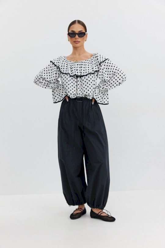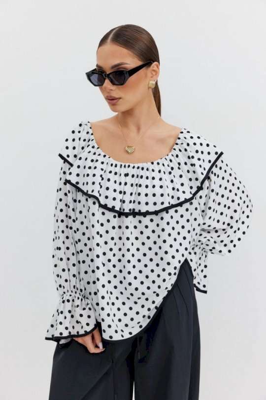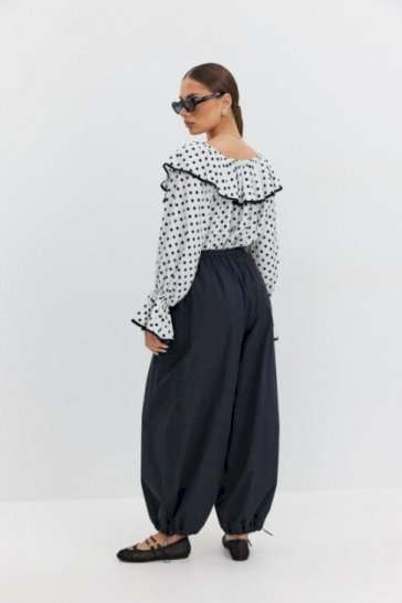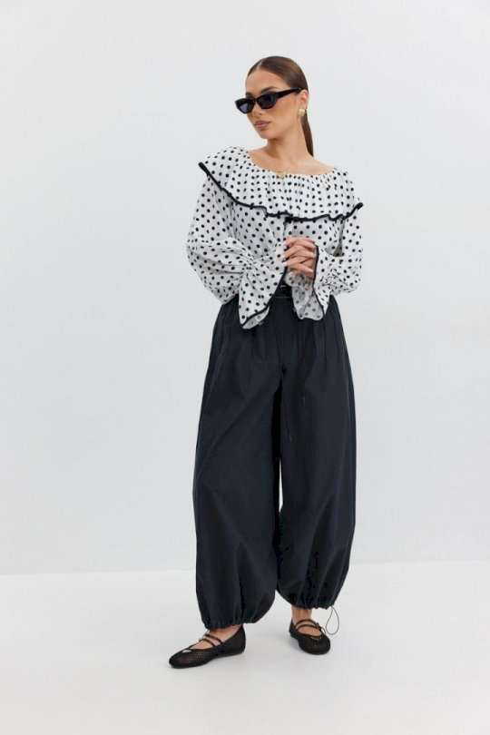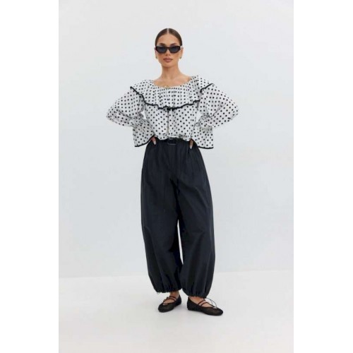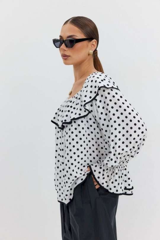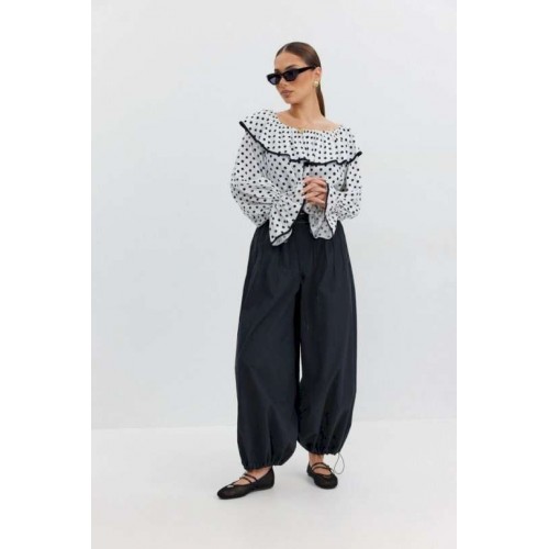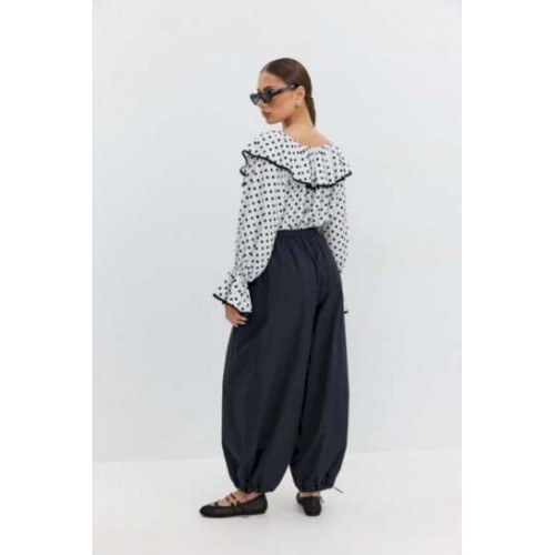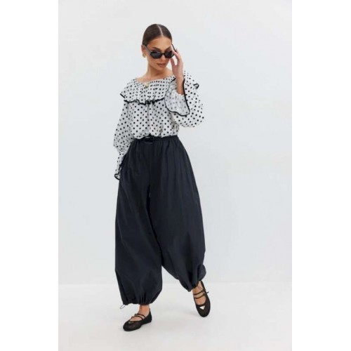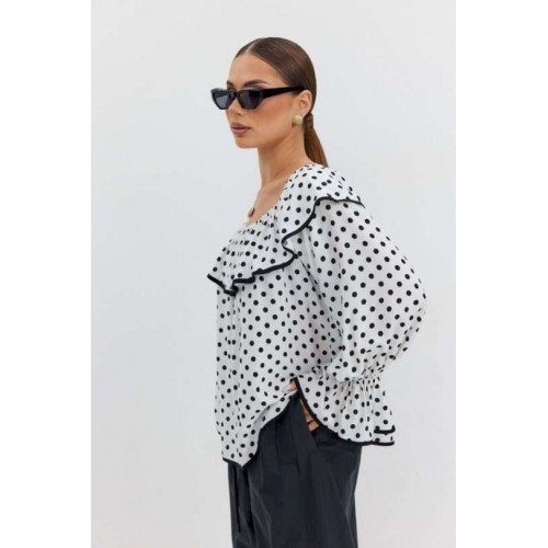 Блузка женская объёмного силуэта, длиной до уровня бедер. Вырез горловины плавной округлой формы с воланом, по верху переда, спинки и рукавов резинка. Рукав длинный объёмный. По низу рукава прострочена тонкая резинка, позволяющая приспустить или поднять рукав выше. По низу блузки, рукава и волана контрастная окантовка.
