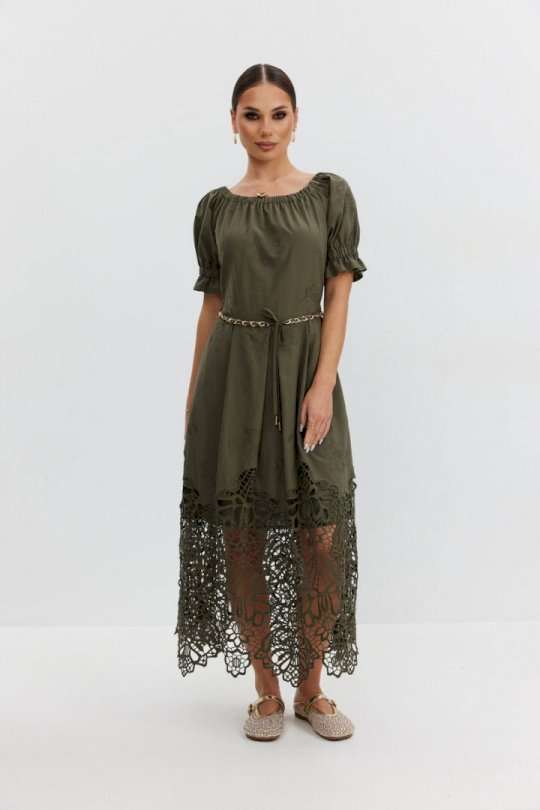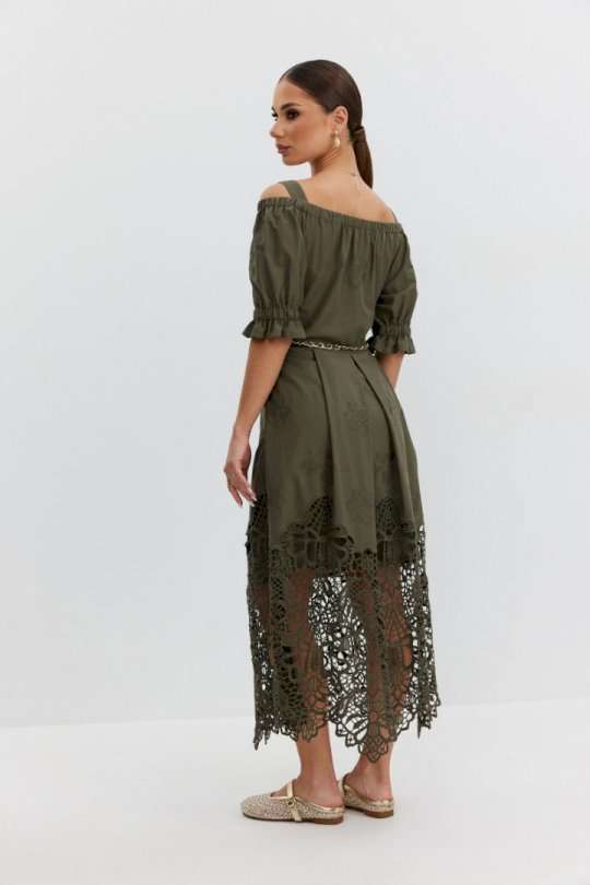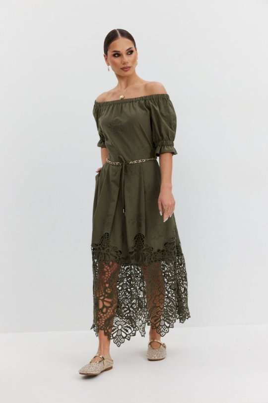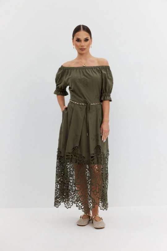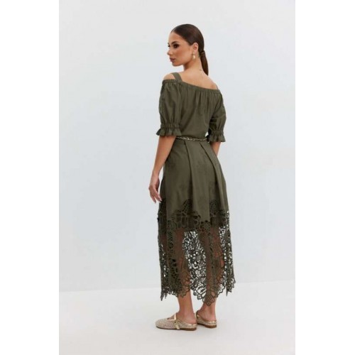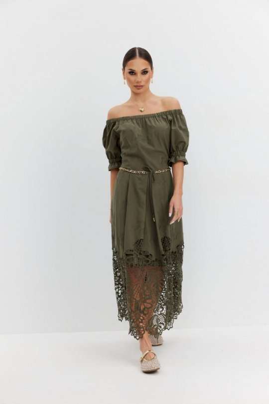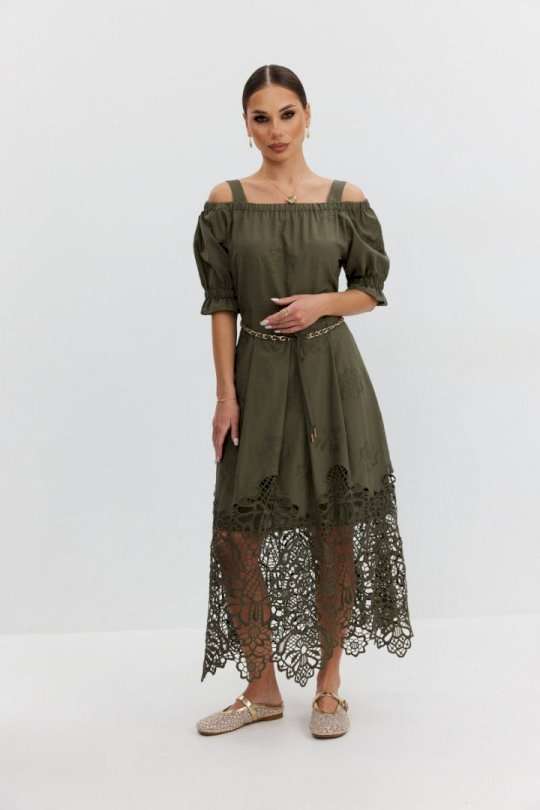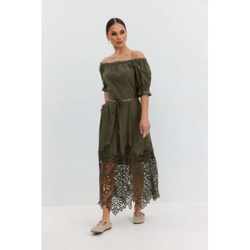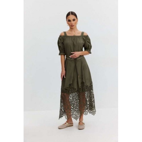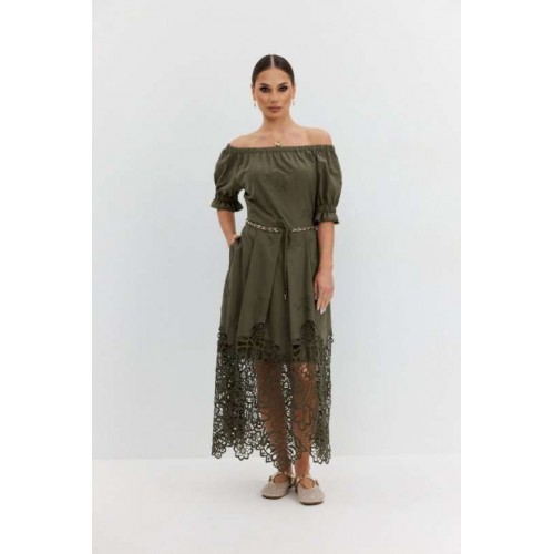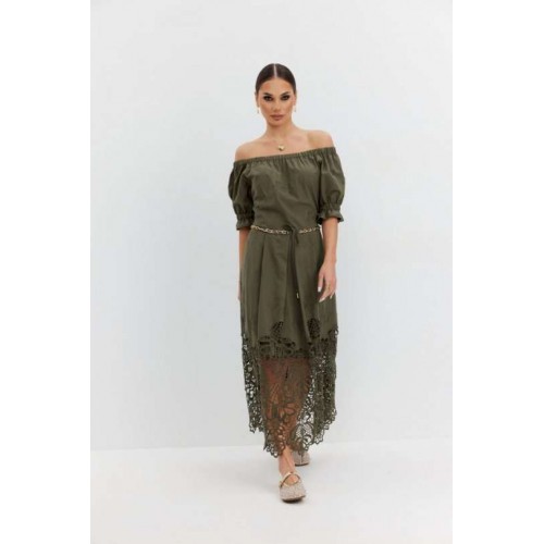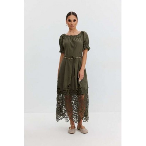 Платье из хлопковой ткани «ришелье». Длина макси. Платье отрезное по талии, юбка со складками. Верх с открытыми плечами и съемными бретелями. Застежка в боковом шве на потайную молнию. Рукав «фонарик». В боковых швах карманы. В комплекте декоративный пояс-завязка. Платье на подкладке. Длина рукава 30 см. 44 р-р: ОГ - 108 см., ОТ - 82 см., ОБ - 112 см. 46 р-р: ОГ - 112 см., ОТ - 86 см., ОБ - 116 см. 48 р-р: ОГ - 116 см., ОТ - 90 см., ОБ - 120 см. 50 р-р: ОГ - 120 см., ОТ - 94 см., ОБ - 124 см. 52 р-р: ОГ - 124 см., ОТ - 98 см., ОБ - 128 см.