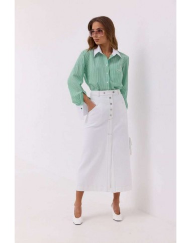 Юбка миди из джинсовой ткани. Верх на поясе со шлевками. Застежка по переду на кнопки. В боковых швах карманы. По переду кокетка и планка, переходящая в разрез. По спинке кокетка и карманы с клапаном. На клапане застежка на кнопку. Сзади на поясе нашивка