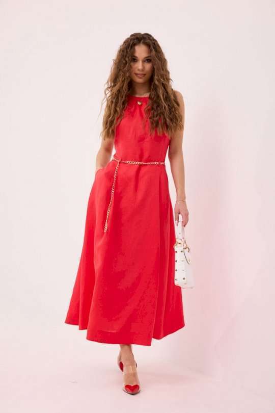 Платье в длине миди. Отрезное по линии талии. Юбка со складками расширена книзу. Горловина имеет сборку по переду и спинке, декорировано по обеим сторонам цепью золотого цвета. В платье две застежки: потайная молния в боковом шве, пуговица сзади горловины. В боковых швах карманы. По талии съемный пояс-цепь с карабином. Нижняя часть платья на подкладке. 44 р-р: ОГ - 98 см., ОТ - 80 см., ОБ - 118 см. 46 р-р: ОГ - 102 см., ОТ - 84 см., ОБ - 122 см. 48 р-р: ОГ - 106 см., ОТ - 88 см., ОБ - 126 см. 50 р-р: ОГ - 110 см., ОТ - 92 см., ОБ - 130 см.