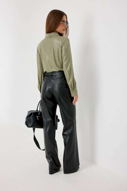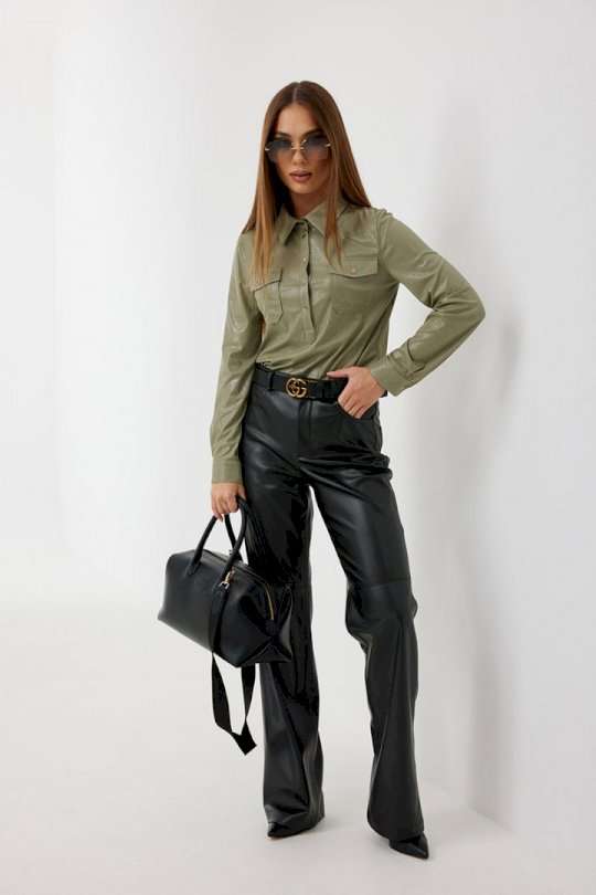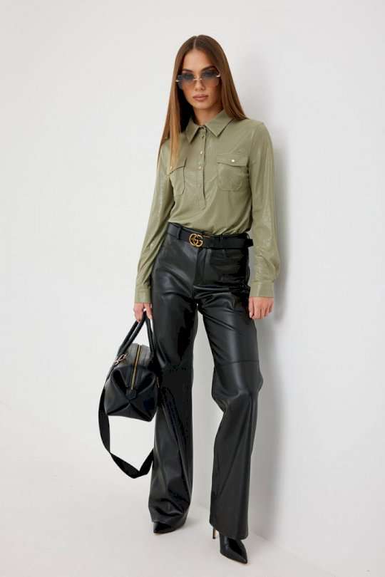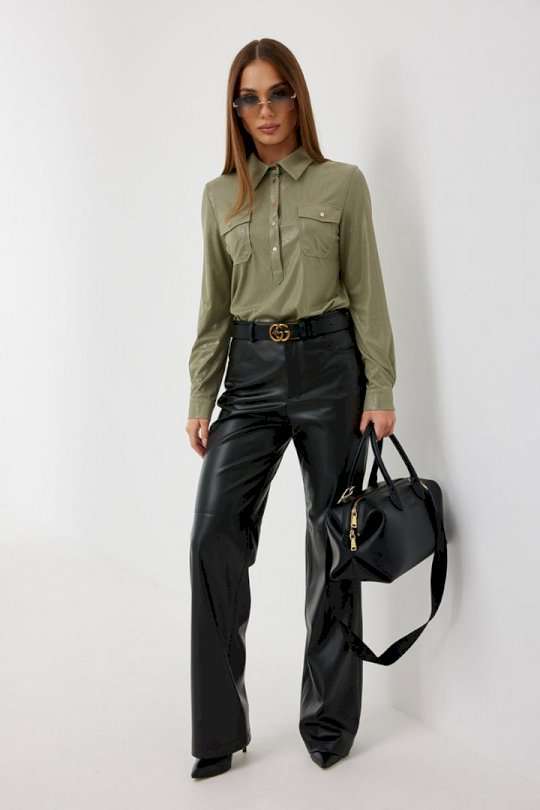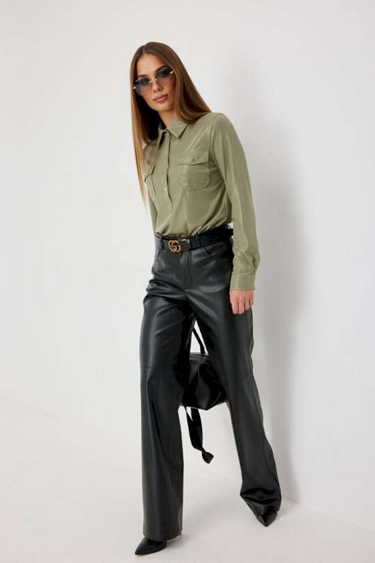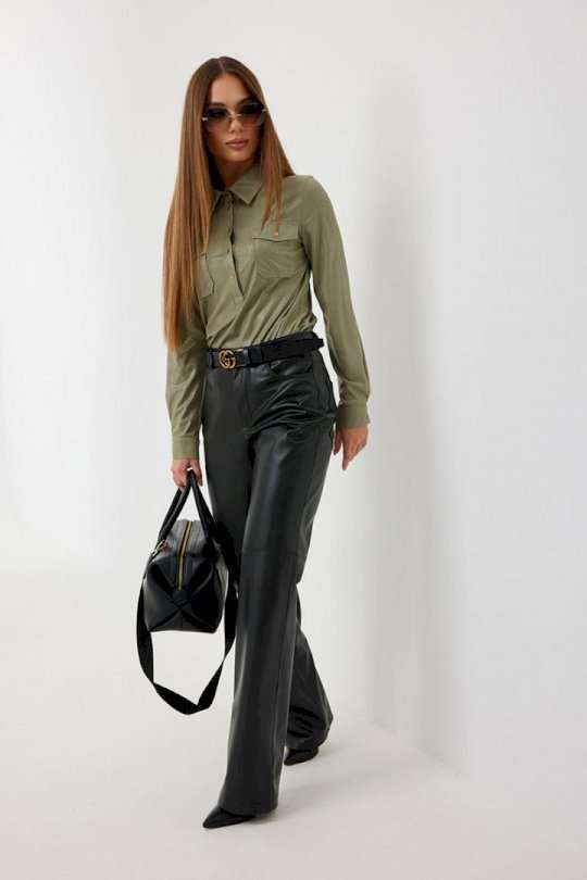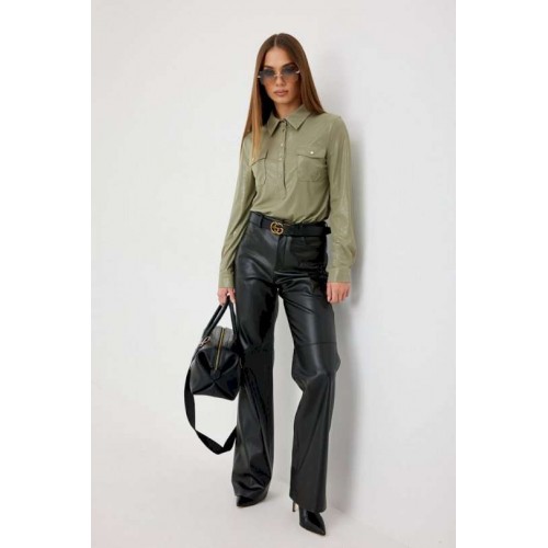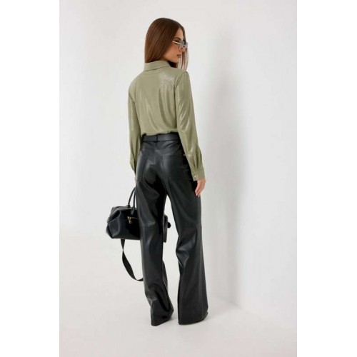 Брюки прямого силуэта из экокожи. Застёжка по переду на молнию и кнопку на поясе. Пояс притачной со шлёвками. По переду боковые карманы. Сзади накладные карманы. На брюках выполнен декоративный подрез. 44 р-р: ОТ - 76 см., ОБ - 96 см. 46 р-р: ОТ - 80 см., ОБ - 100 см. 48 р-р: ОТ - 84 см., ОБ - 104 см. 50 р-р: ОТ - 88 см., ОБ - 108 см. 52 р-р: ОТ - 92 см., ОБ - 112 см.