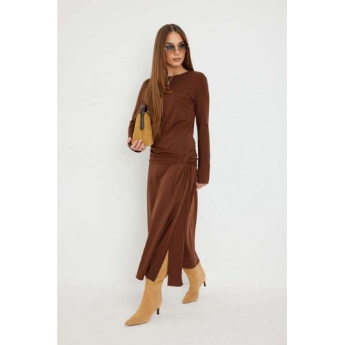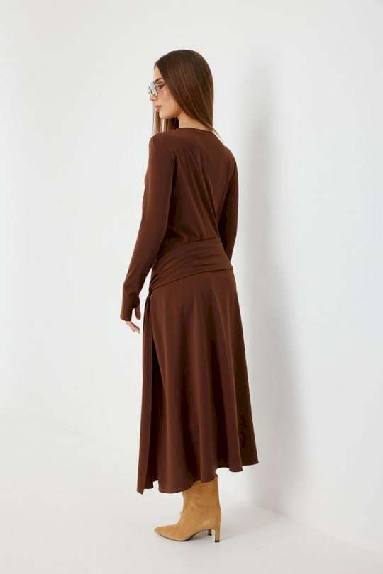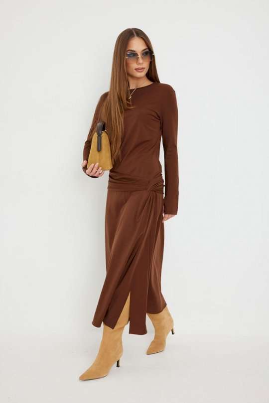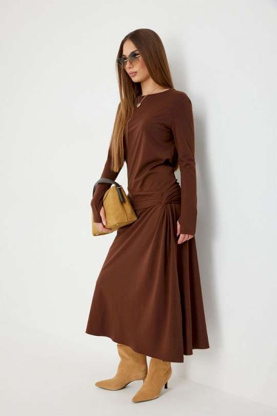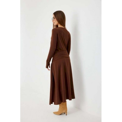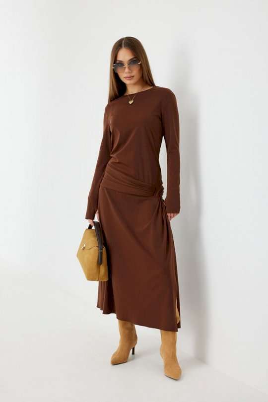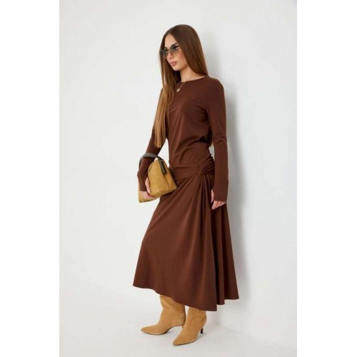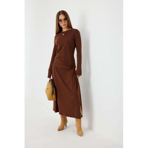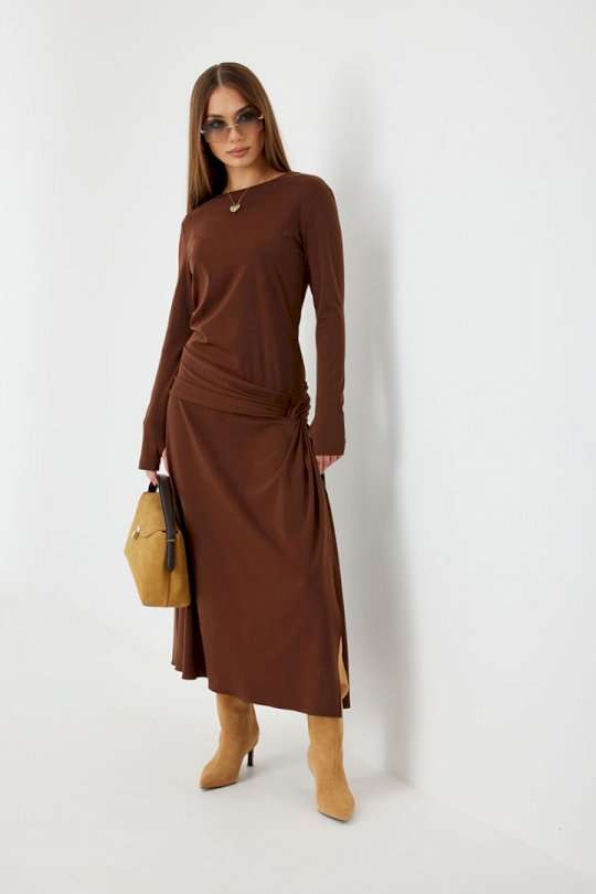 Платье женское прилегающего силуэта, длиной миди, с подрезом и интересной драпировкой в области чуть ниже талии по переду, юбка, расширенная книзу. Горловина обработана бейкой. Рукав втачной, узкий. Длина рукава 96 см. 44 р-р: ОГ - 86 см., ОТ - 76 см., ОБ - 206 см. 46 р-р: ОГ - 90 см., ОТ - 80 см., ОБ - 210 см. 48 р-р: ОГ - 94 см., ОТ - 84 см., ОБ - 214 см. 50 р-р: ОГ - 98 см., ОТ - 88 см., ОБ - 218 см. 52 р-р: ОГ - 102 см., ОТ - 92 см., ОБ - 222 см.