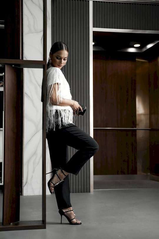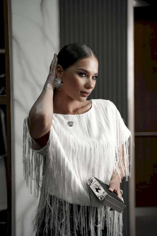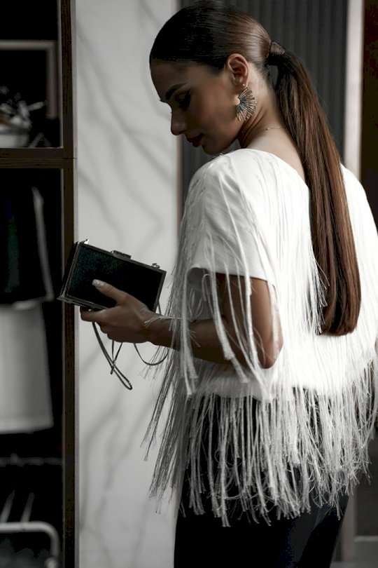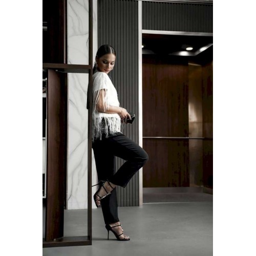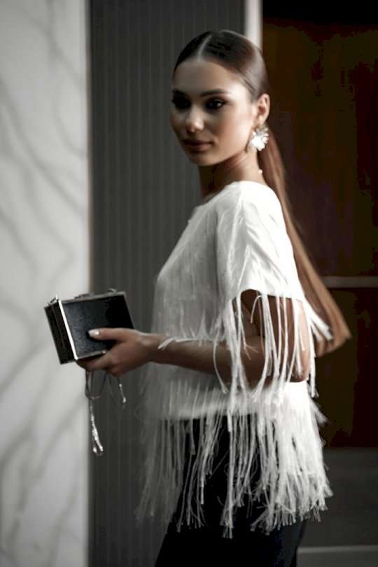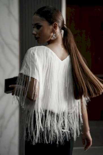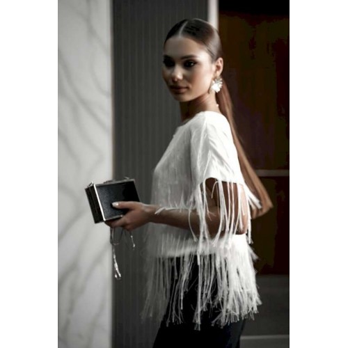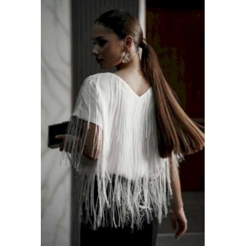 Блузка свободного силуэта с коротким цельновыкроенным рукавом, из нарядной плательно-блузочной ткани с бахромой. По переду горловина округлой формы, по спинке-V-образной. Блузка на атласной подкладке. 44 р-р: ОГ - 104 см., ОТ - 102 см., ОБ - 106 см. 46 р-р: ОГ - 108 см., ОТ - 106 см., ОБ - 110 см. 48 р-р: ОГ - 112 см., ОТ - 110 см., ОБ - 114 см. 50 р-р: ОГ - 116 см., ОТ - 114 см., ОБ - 118 см. 52 р-р: ОГ - 120 см., ОТ - 118 см., ОБ - 122 см.