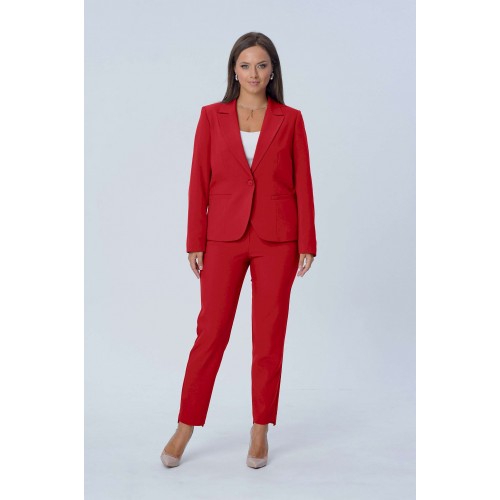 Костюм женский двухпредметный, состоящий из жакета и брюк. Жакет полуприлегающего силуэта с центральной бортовой застёжкой на одну петлю-пуговицу до линии перегиба лацкана. Перед с талиевой вытачкой и прорезным карманом с листочкой с втачными концами. Спинка со средним швом. Рукав втачной двухшовный длинный. Воротник пиджачного типа. Брюки классического кроя, слегка зауженные к низу с притачным поясом с резинкой по задним половинкам брюк. Брюки с наклонным к боковому шву карманом и двумя фигурными хлестиками на одну пуговицу по поясу передних половинок. Застёжка на тесьму - молнию и одну петлю-пуговицу по поясу. Низ брюк имеет фигурную форму - укорочена по передним половинкам и удлинённые по задним. Длина жакета по спинке - 59 см. Длина рукава - 61 см. Длина брюк по боковому шву - 96 см.