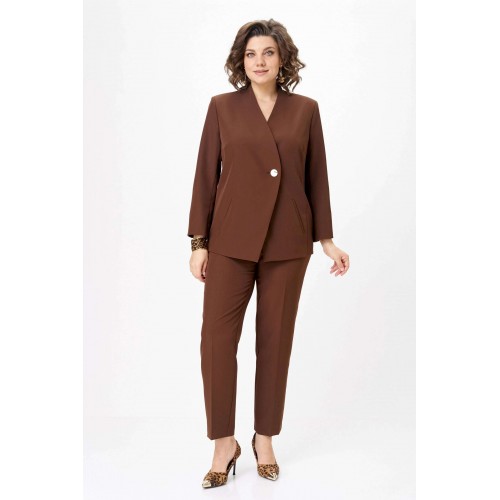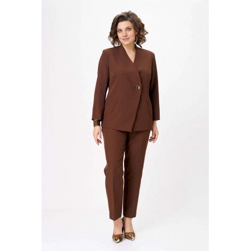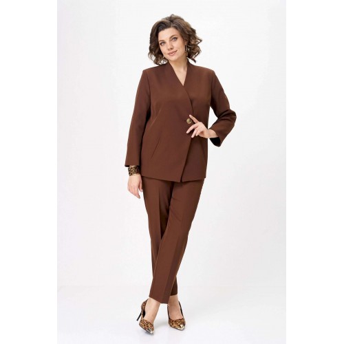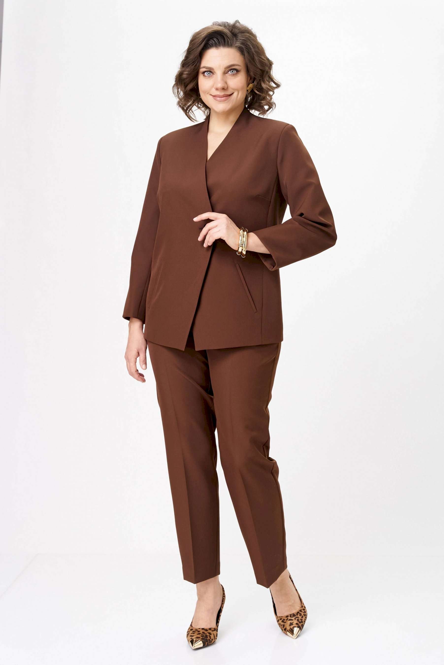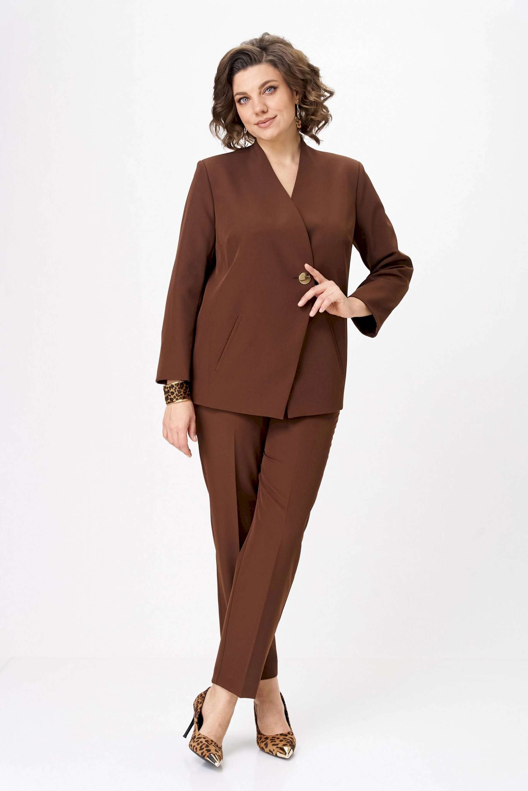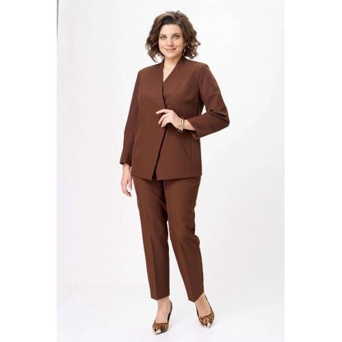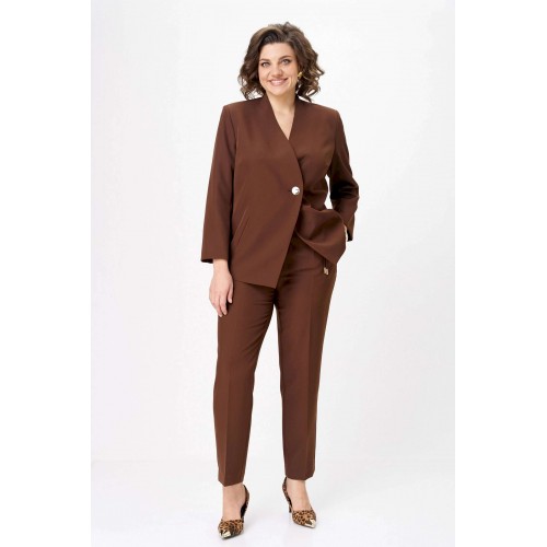 Костюм женский двухпредметный, состоящий из жакета и брюк. Жакет полуприлегающего силуэта со спущенной застежкой на одну декоративную петлю-пуговицу и одну потайную. Перед с отрезным бочком, в котором обработана вытачка, и с карманами с листочкой. Спинка со средним швом. Борт имеет фигурную форму. Горловина - по переду цельнокроенная стойка, а по спинке - отрезная со средним швом. Рукава втачные длинные двухшовные. Брюки классического кроя, зауженные к низу, с притачным поясом, от входа в карман вкруговую с широкой резинкой. Застежка на тесьму-молнию в средних срезах передних половинок и на 2 петли-пуговицы по поясу. Также по поясу вставлен шнурок с фиксатором и наконечниками. Карманы наклонные к боковому шву. На брюках заутюжены канты.