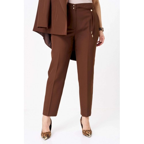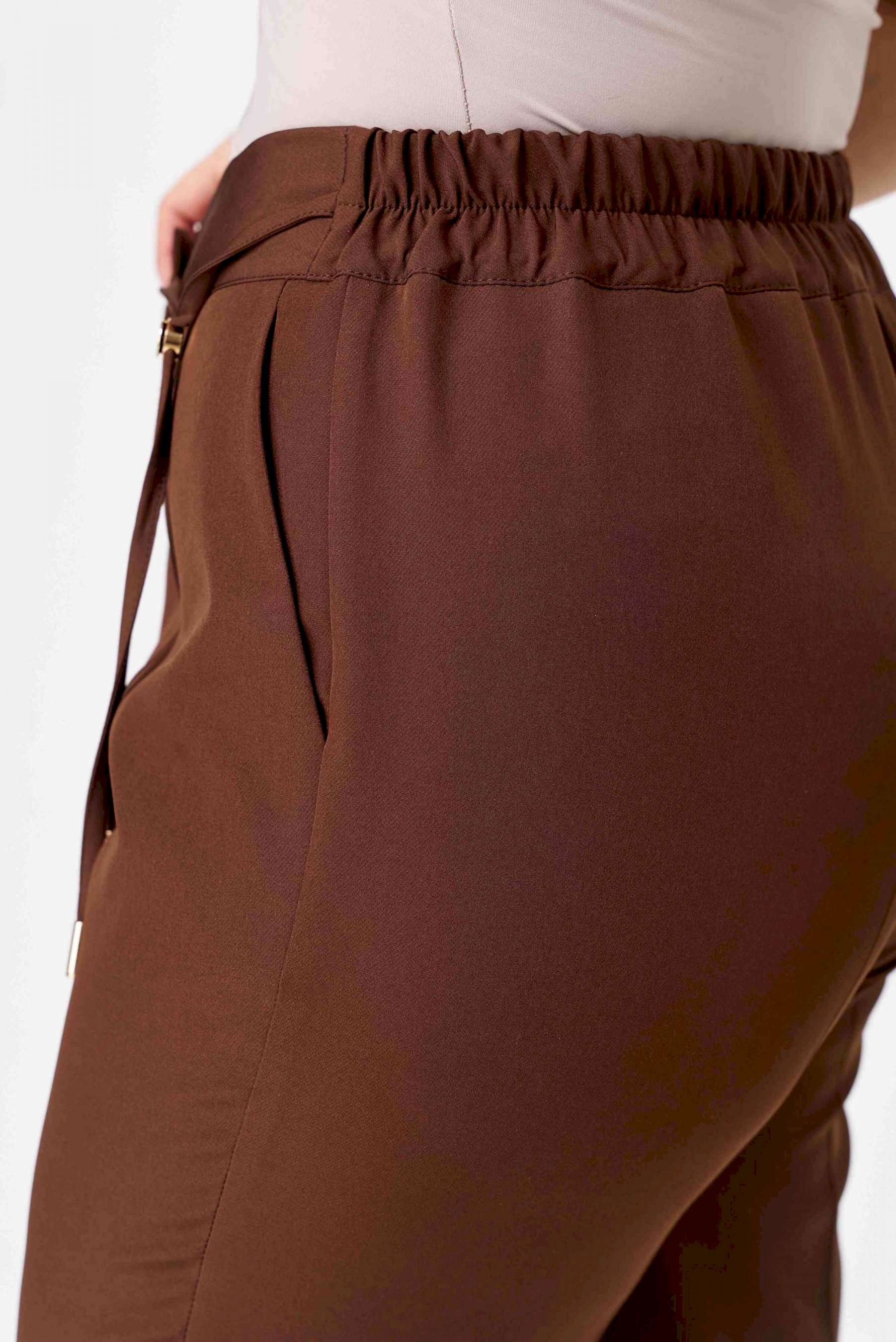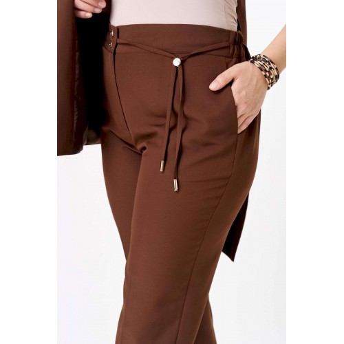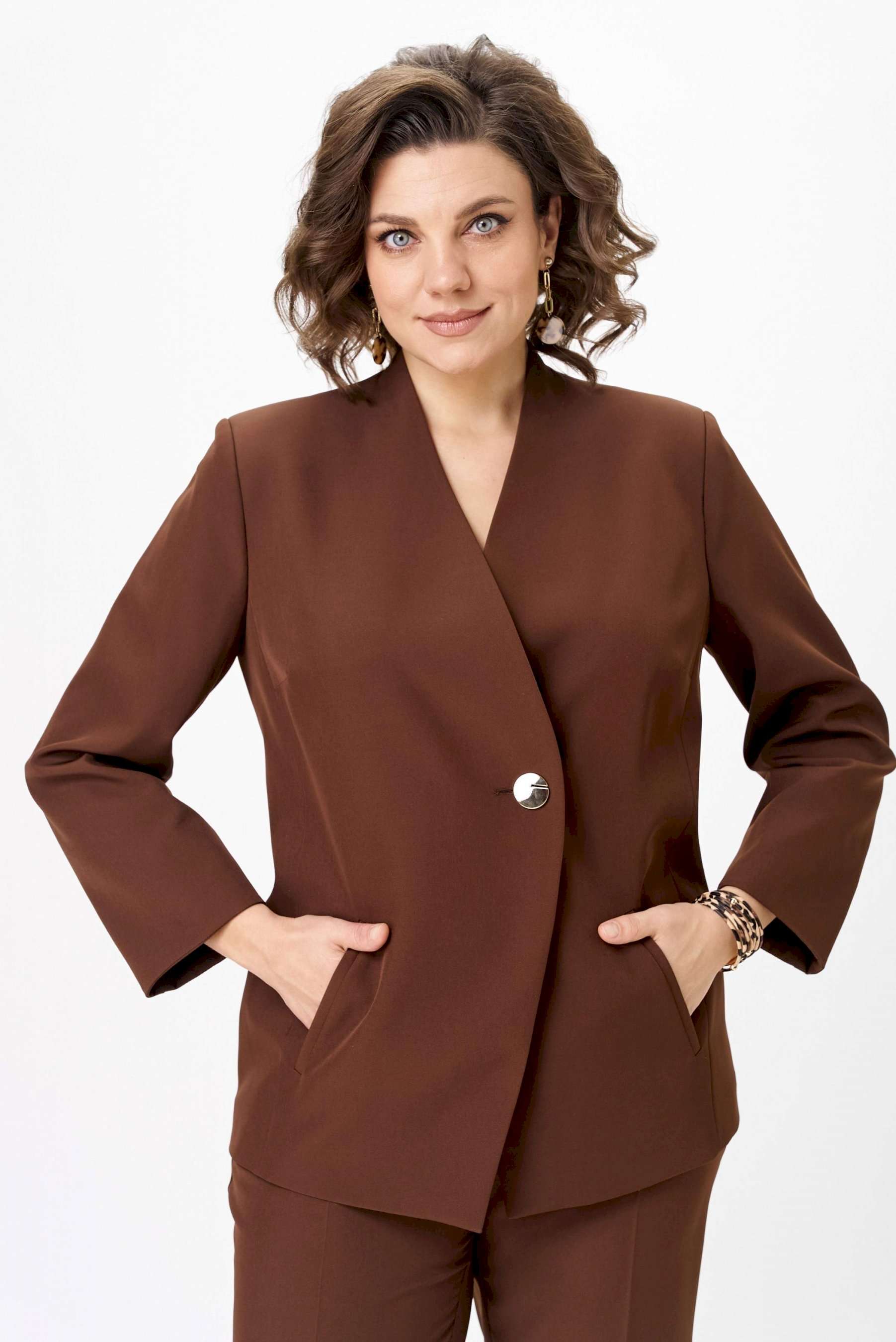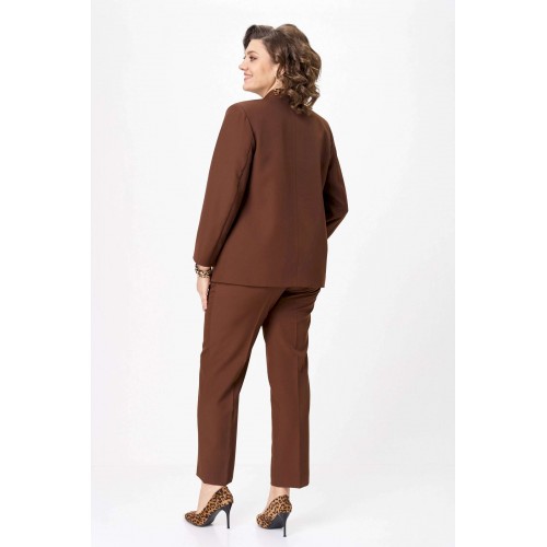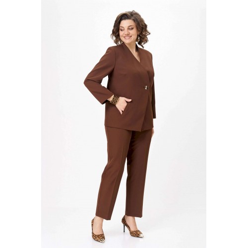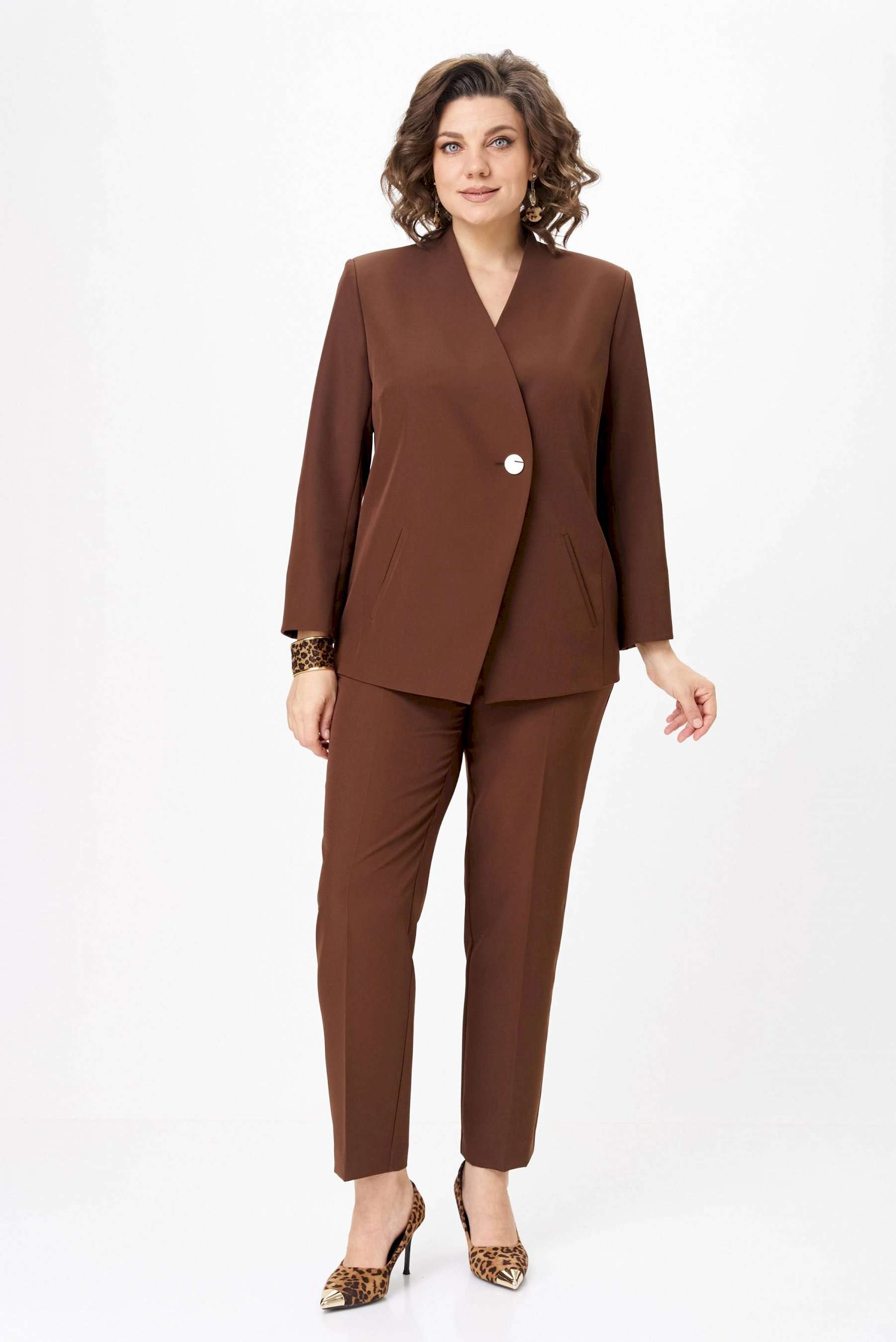 Костюм женский двухпредметный, состоящий из жакета и брюк. Жакет полуприлегающего силуэта со спущенной застежкой на одну декоративную петлю-пуговицу и одну потайную. Перед с отрезным бочком, в котором обработана вытачка, и с карманами с листочкой. Спинка со средним швом. Борт имеет фигурную форму. Горловина - по переду цельнокроенная стойка, а по спинке - отрезная со средним швом. Рукава втачные длинные двухшовные. Брюки классического кроя, зауженные к низу, с притачным поясом, от входа в карман вкруговую с широкой резинкой. Застежка на тесьму-молнию в средних срезах передних половинок и на 2 петли-пуговицы по поясу. Также по поясу вставлен шнурок с фиксатором и наконечниками. Карманы наклонные к боковому шву. На брюках заутюжены канты.