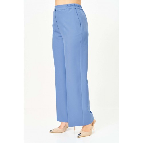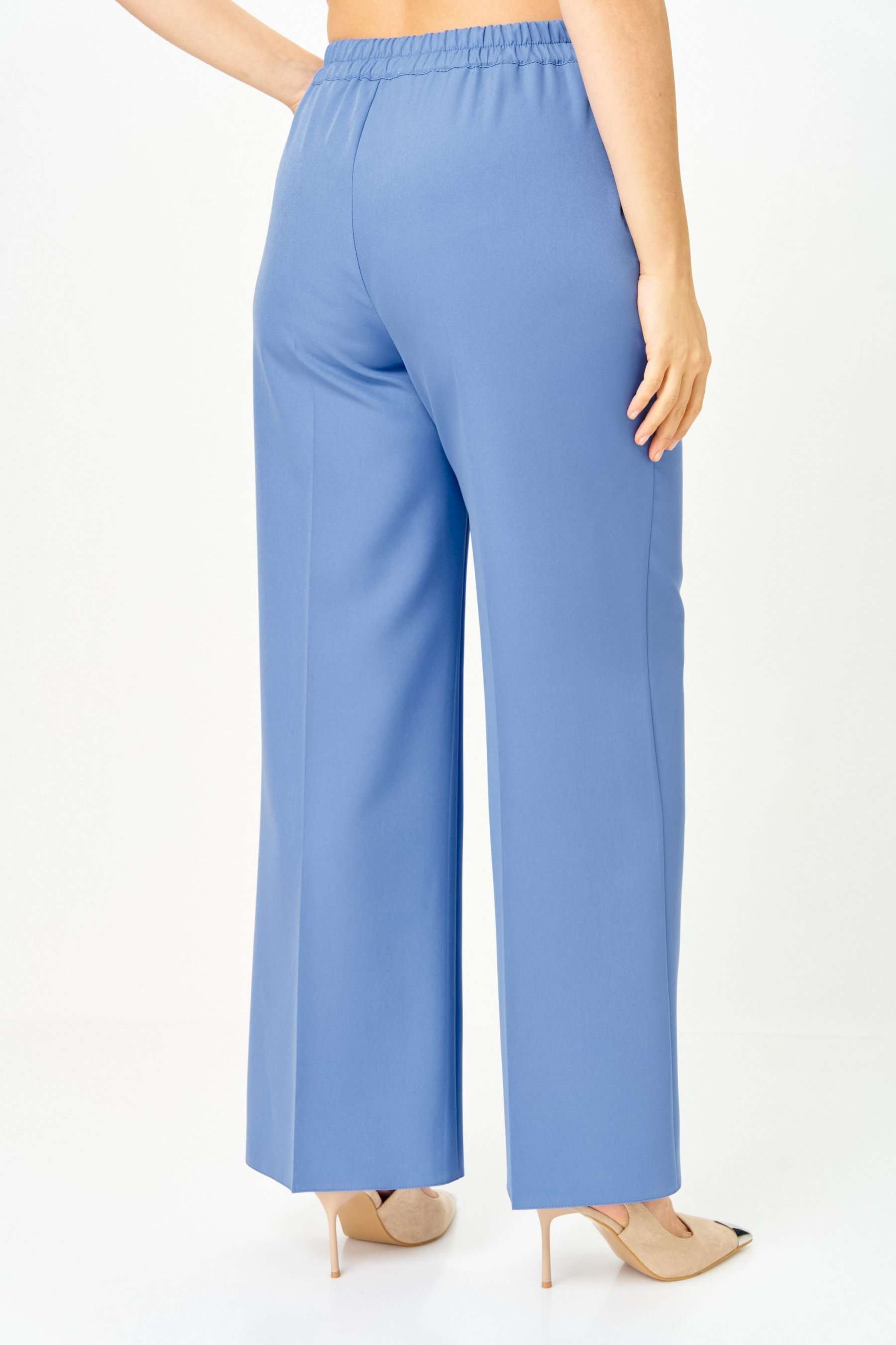 Костюм женский двухпредметный, состоящий из жакета и брюк. Жакет полуприлегающего силуэта, удлиненный, с центральной бортовой застежкой на 2 петли-пуговицы до линии перегиба лацкана. Перед с нагрудными вытачками, выходящими из горловины. Боковые швы с разрезами, между которыми по спинке вставлен пояс фигурной формы с декоратичной нашивкой. Спинка со средним швом. Воротник пиджачного типа. Рукава втачные двухшовные длиной 3/4. Брюки палаццо с притачным широким поясом на резинке от заутюженных стрелок по передней половинке вкруговую. Застежка на тесьму-молнию в средних срезах передних половинок брюк и 2 петли-пуговицы по поясу.