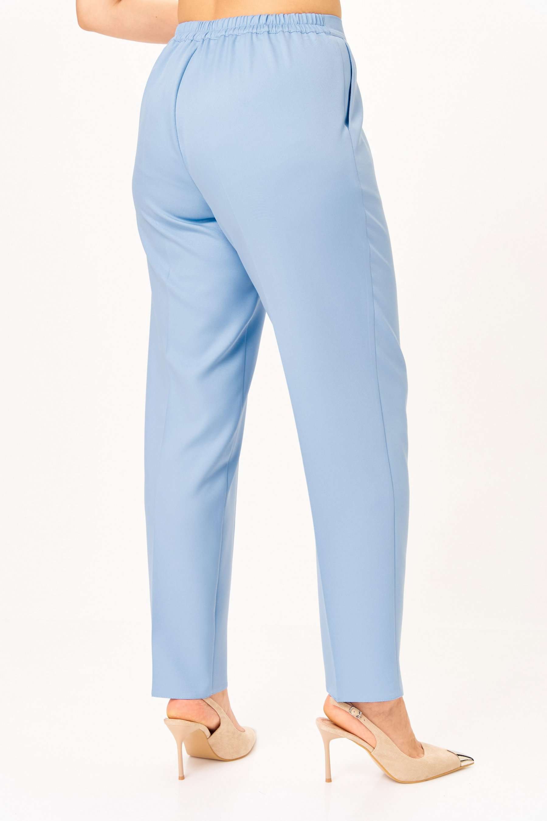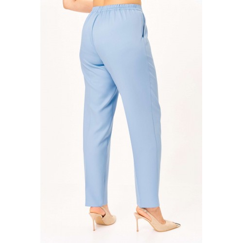 Комплект женский, состоящий из туники и брюк. Туника А-образного силуэта с центральной застежкой на планку до подреза на 3 декоративные петли-пуговицы. Перед с нагрудной вытачкой и фигурными подрезами. Спинка с горизонтальной кокеткой и двумя складками. В боковых швах обработаны разрезы. Низ переда ассиметричен и слегка разведен. Рукава втачные одношовные длиной 3/4 с защипом, имитирующим манжет. Воротник-стойка. Брюки классического кроя, зауженные к низу с притачным поясом сзади на резинке. Застежка на тесьму-молнию в среднем шве передних половинок и 1 петлю-пуговицу по поясу. На брюках заутюжены канты.