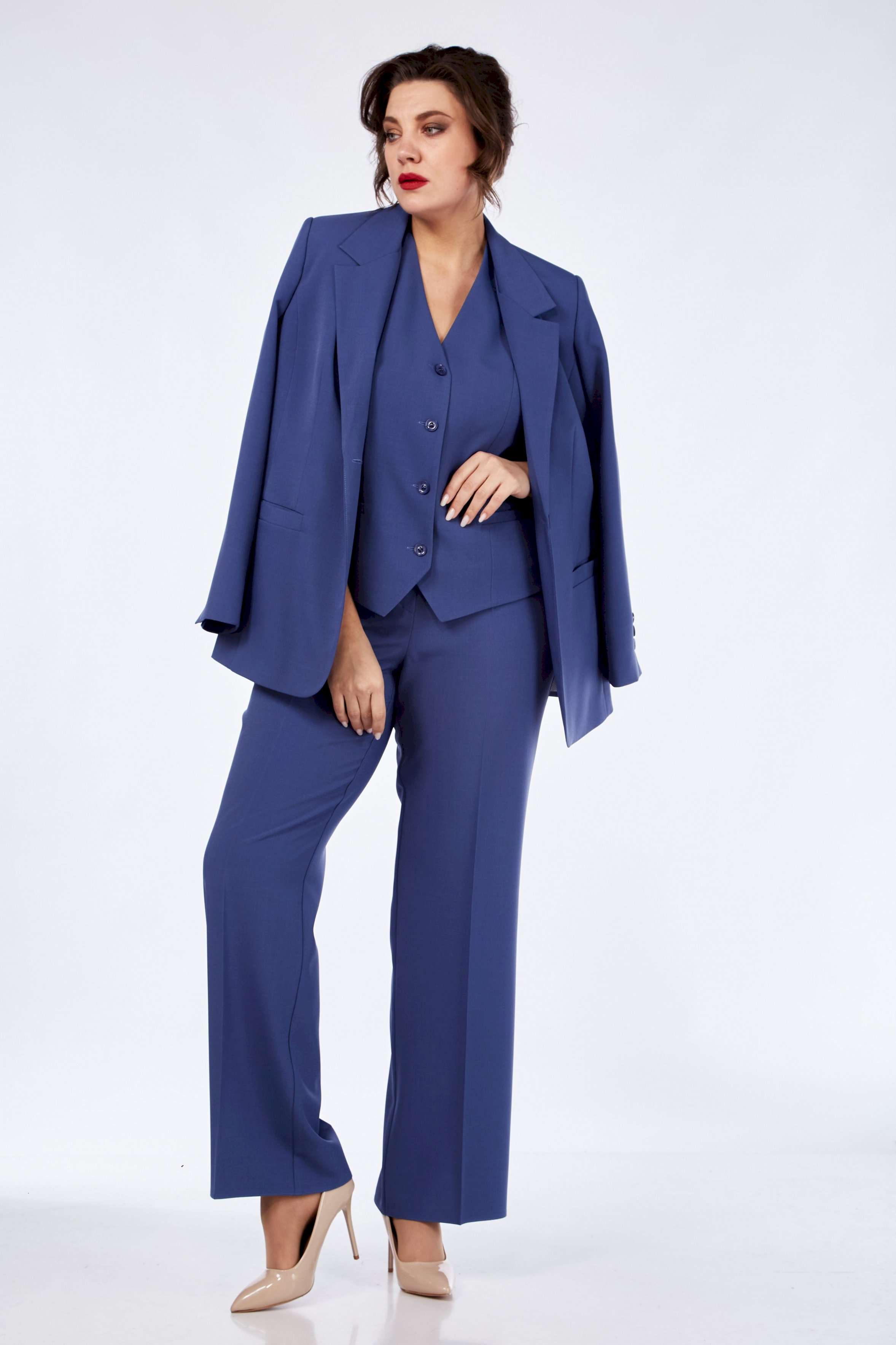 Костюм женский 3-х предметный, полуприлегающего силуэта. Состоит из жакета и жилета на подкладке и брюк. Жакет с воротником пиджачного типа, центральной застёжкой на 1 петлю и 1 пуговицу. Перед с рельефными швами от пройм до низа и талиевыми вытачками и прорезными карманами с листочками с втачными концами. Спинка со средним швом. Рукав втачной, двухшовный, длинный со шлицей. Жилет с рельефными швами от пройм до низа по переду и спинке, с центральной застёжкой на 4 петли и 4 пуговицы. Перед с прорезными карманами с листочками с втачными концами. Брюки с застёжкой на тесьму \"молнию\" в средних срезах передних половинок, с притачным поясом на 1 петлю и 1 пуговицу и резинкой по задним половинкам, с карманами наклонными к боковым швам. По передним и задним половинкам заутюженные канты. Длина жакета по спинке - 71 см. Длина рукава - 61 см. Длина жилета по спинке - 54 см. Длина брюк по боковому шву - 101 см.