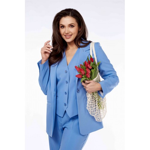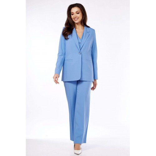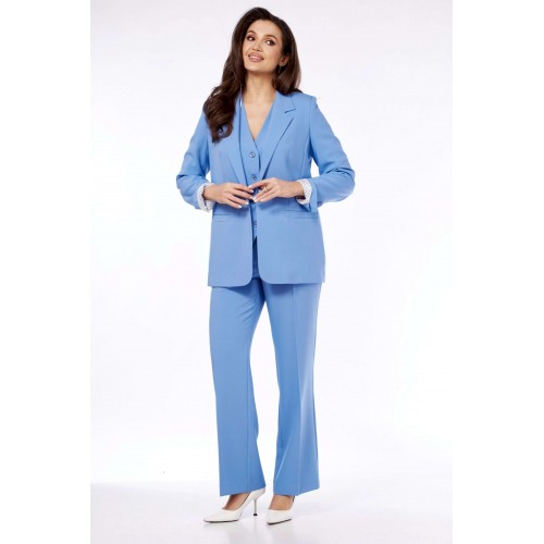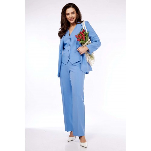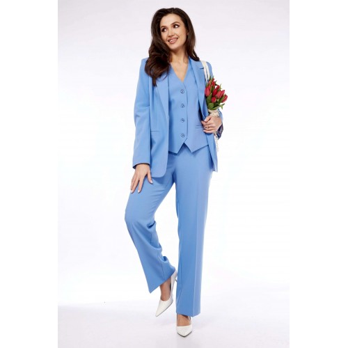 Костюм женский 3-х предметный, полуприлегающего силуэта. Состоит из жакета и жилета на подкладке и брюк. Жакет с воротником пиджачного типа, центральной застёжкой на 1 петлю и 1 пуговицу. Перед с рельефными швами от пройм до низа и талиевыми вытачками и прорезными карманами с листочками с втачными концами. Спинка со средним швом. Рукав втачной, двухшовный, длинный со шлицей. Жилет с рельефными швами от пройм до низа по переду и спинке, с центральной застёжкой на 4 петли и 4 пуговицы. Перед с прорезными карманами с листочками с втачными концами. Брюки с застёжкой на тесьму \"молнию\" в средних срезах передних половинок, с притачным поясом на 1 петлю и 1 пуговицу и резинкой по задним половинкам, с карманами наклонными к боковым швам. По передним и задним половинкам заутюженные канты. Длина жакета по спинке - 70 см. Длина рукава - 61 см. Длина жилета по спинке - 53 см. Длина брюк по боковому шву - 101 см.