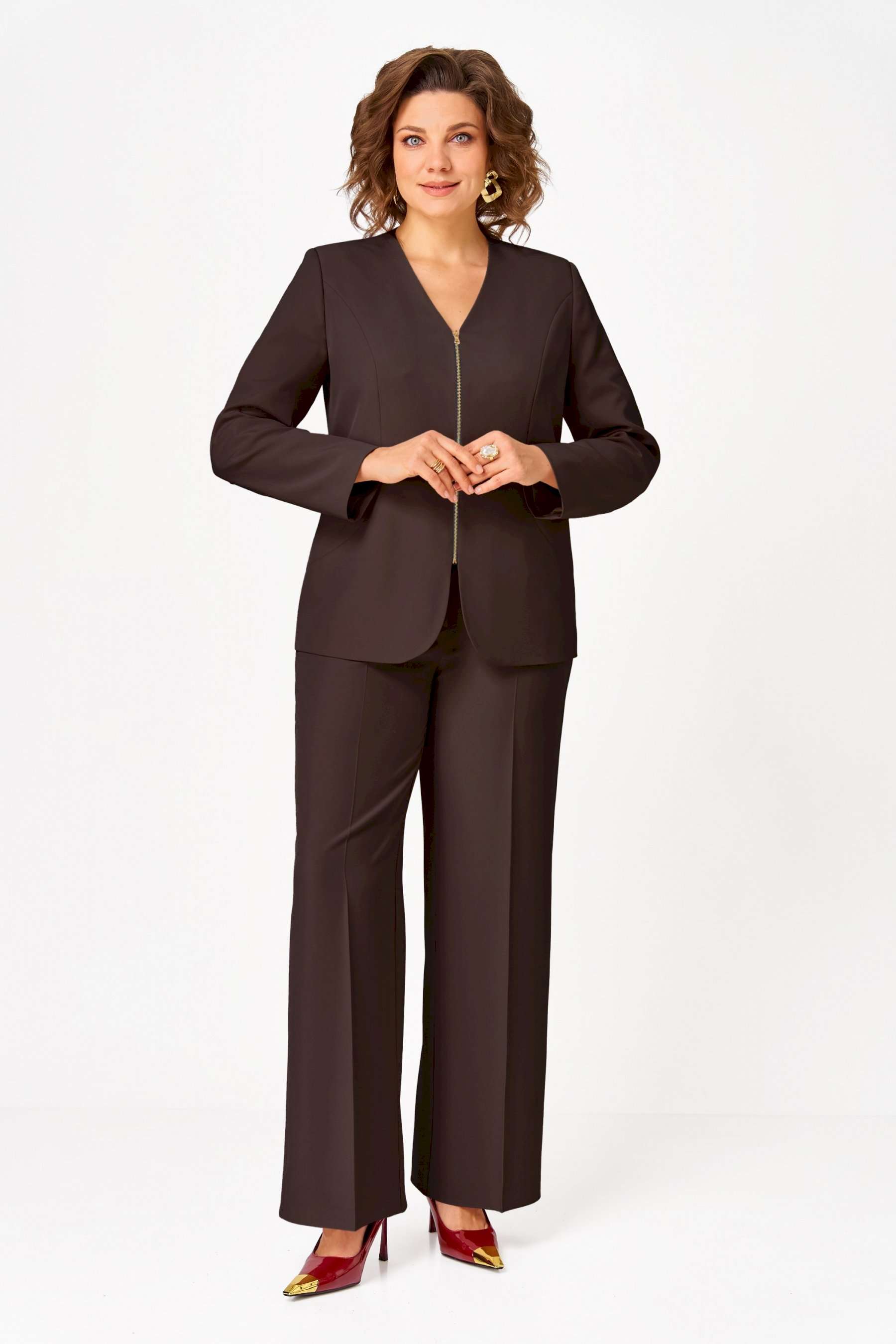 Костюм женский двухпредметный, состоящий из жакета и брюк. Жакет полуприлегающего силуэта с центральной бортовой застежкой на тесьму-молнию, с фигурными бочками. Спинка со средним швом. Вырез горловины V-образной формы. Рукава втачные длинные двухшовные. Брюки-палацо с притачным поясом, сзади на резинке. Застежка на тесьму-молнию в средних срезах передних половинок брюк и 1 петлю-пуговицу. В изделии обработаны карманы, наклонные к боковому шву. На брюках заутюжены стрелки.