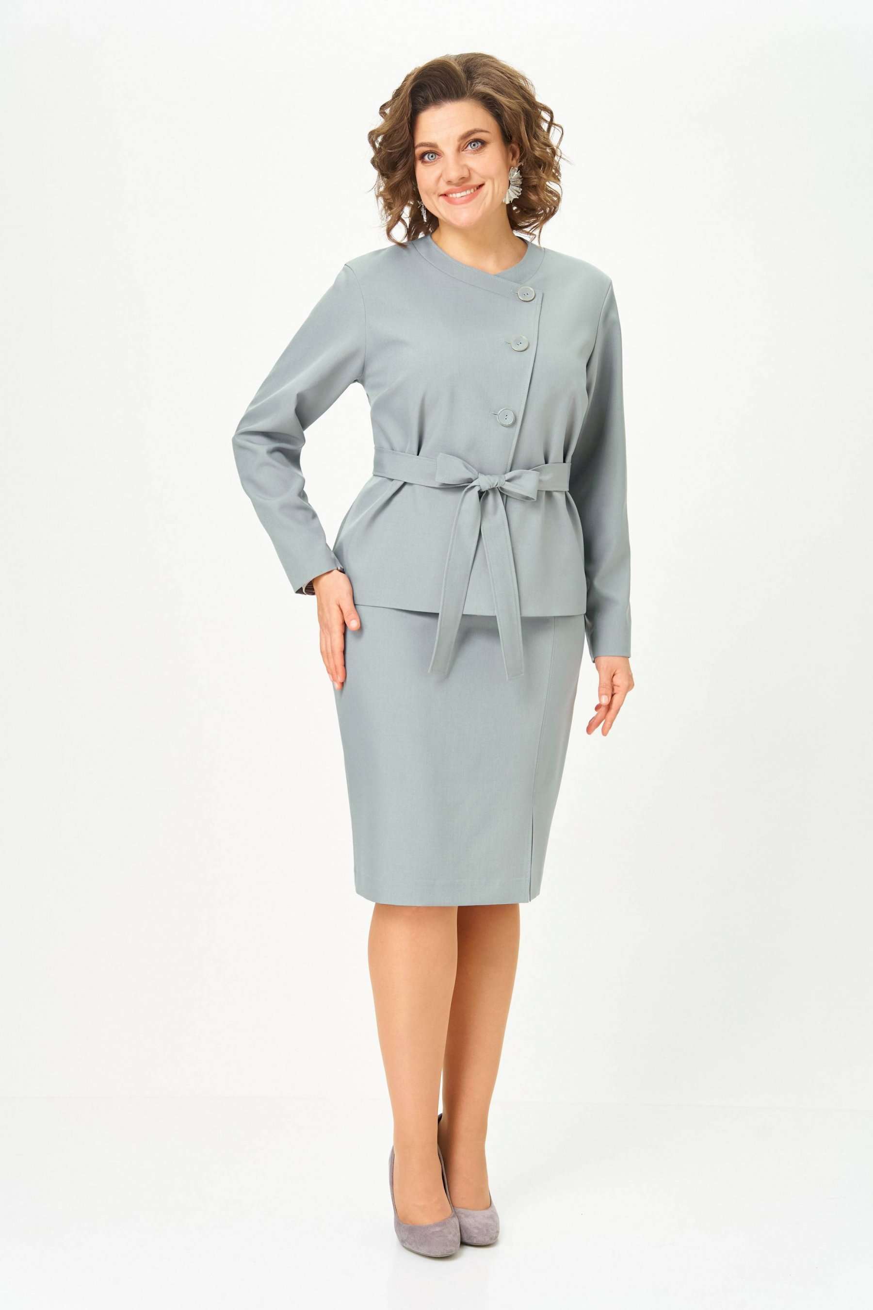 Костюм женский двухпредметный, состоящий из жакета и юбки. Жакет полуприлегающего силуэта со слегка спущеной линией плеча, на подкладке, со смещенной застежкой на 3 пели-пуговицы по линии борта 1 потайной петлей-пуговицей и нагрудными вытачками, выходящими из боковых швов. Горловина с фигурной планкой по переду и спинке. Спинка со средним швом. Рукав втачной длинный двухшовный. Изделие со съемным поясом. Юбка- карандаш длиной за колено, зауженная к низу, с кокетками со шлевками. Переднее полотнище с имитацией карманов и рельефным швом, заканчивающимся разрезом. Заднее полотнище со средним швом, в котором обработана застежка на 2 петли-пуговицы по кокетке и потайная тесьма-молния.