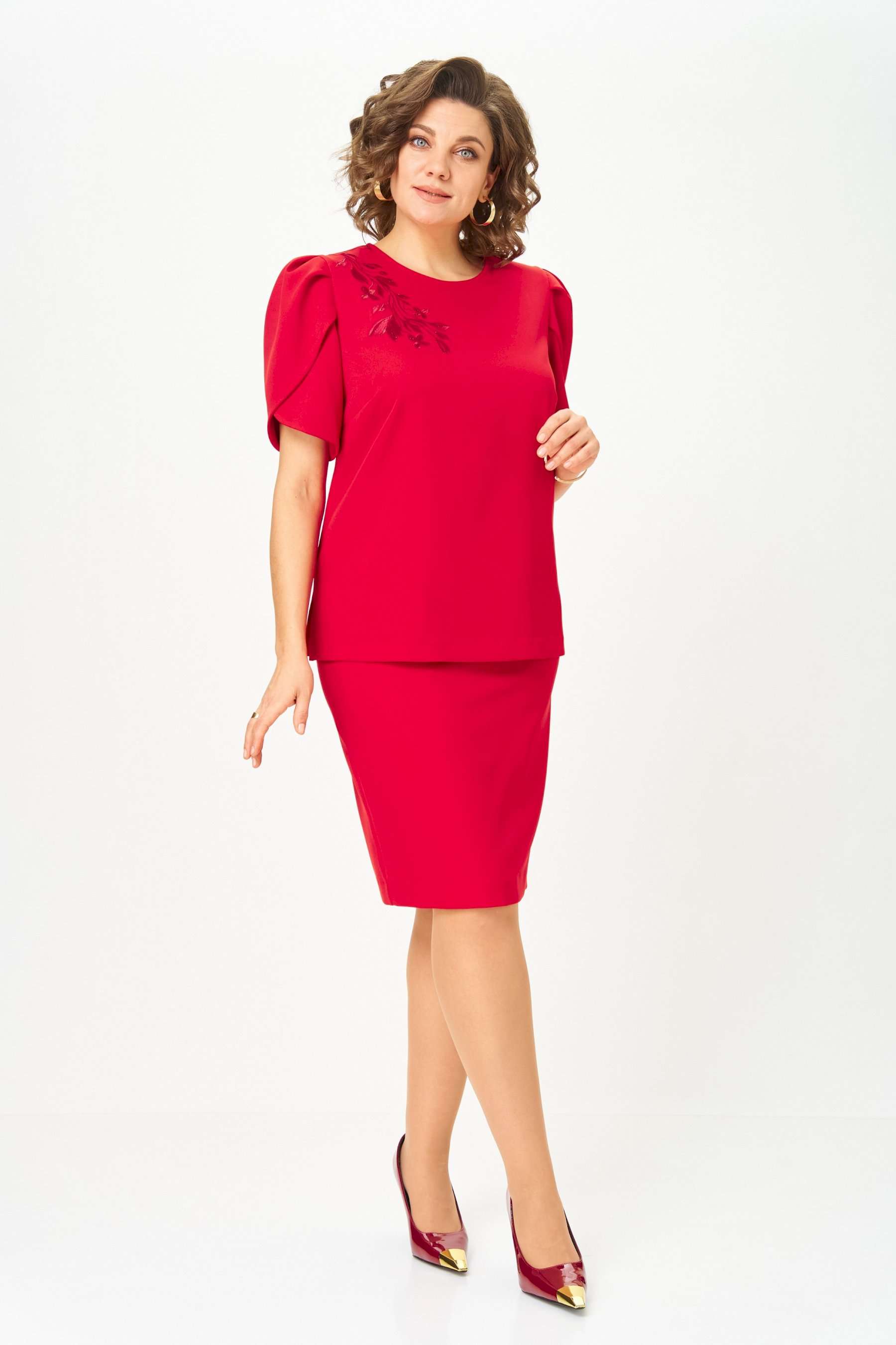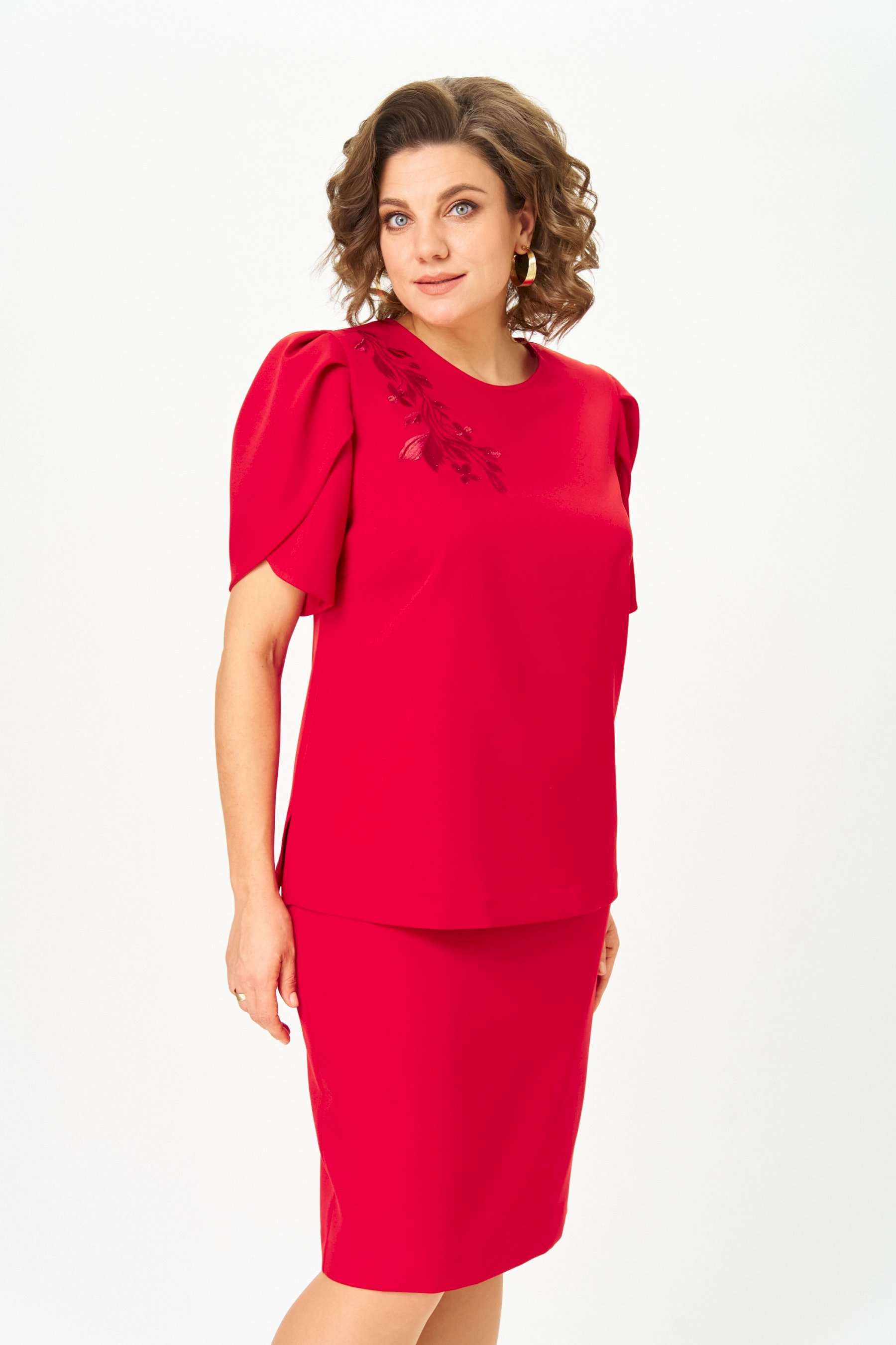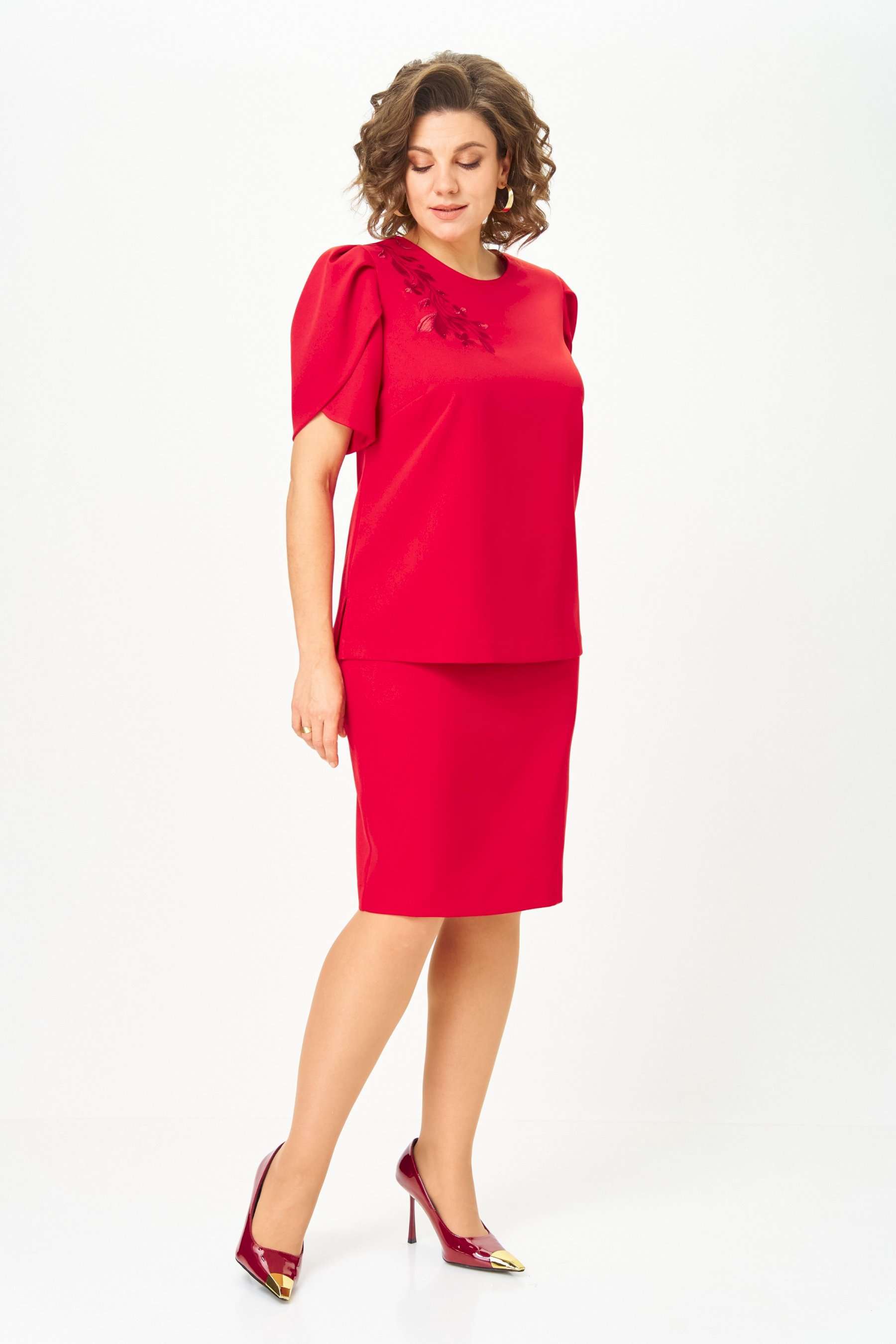 Костюм женский двухпредметный, состоящий из блузы и юбки. Блуза прямого силуэта, декорированная вышивкой, с нагрудными вытачками, выходящими из боковых швов, и с разрезами. Спинка со средним швом, в котором обработан разрез с навесной петлей и пуговицей. Горловина овальной формы. Рукава короткие фантазийной формы на запах со складками по окату. Рукав двойной, обтачен атласной тканью. Юбка-карандаш длиной до линии колена, с притачным поясом из атласа, на резинке между талиевыми вытачками. Заднее полотнище со средним швом, заканчивающимся шлицей. Застежка на одну петлю-пуговицу по поясу и тесьму-молнию в среднем шве.