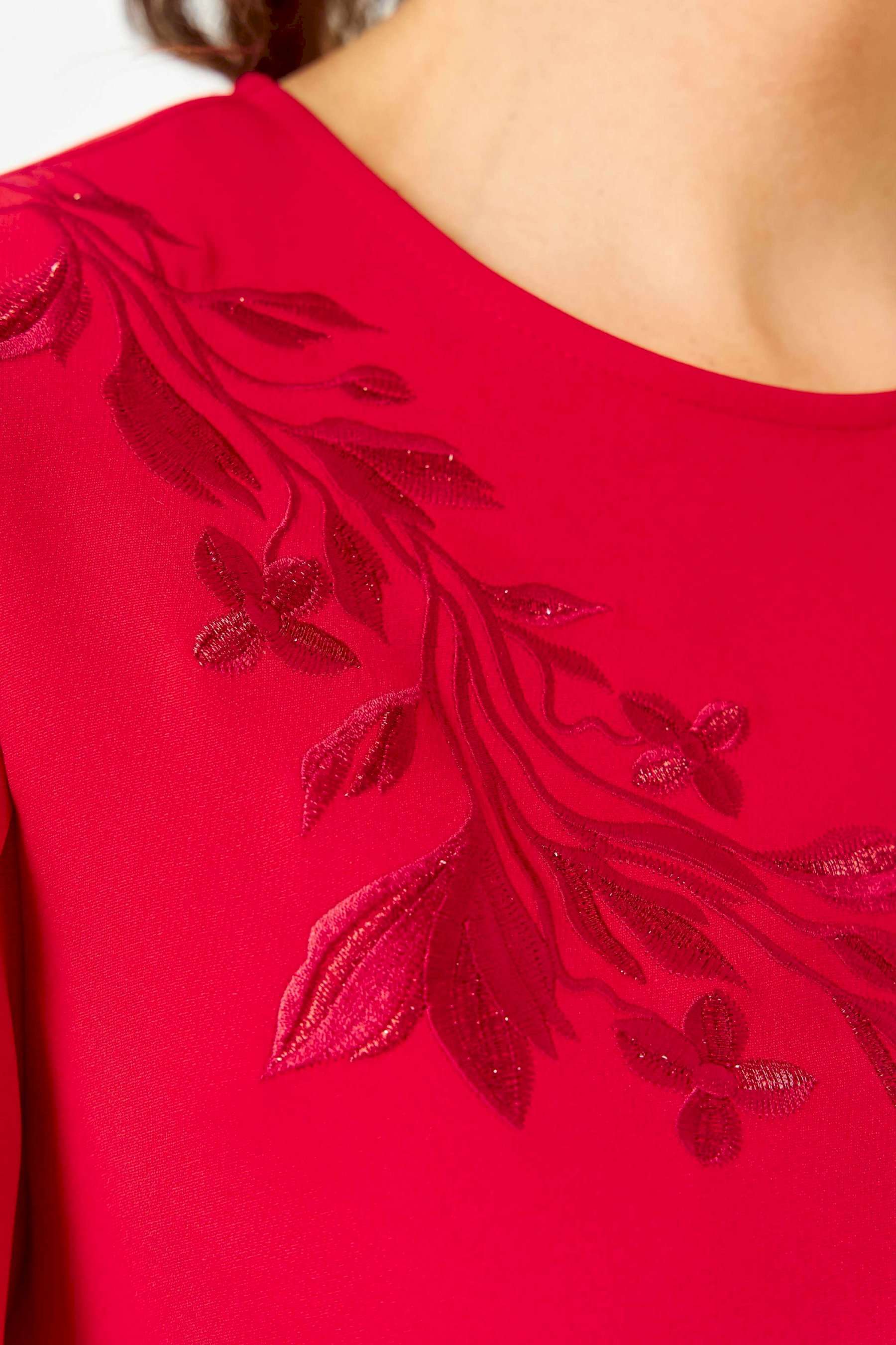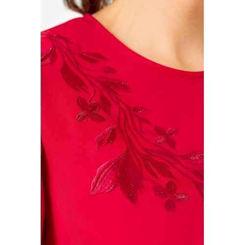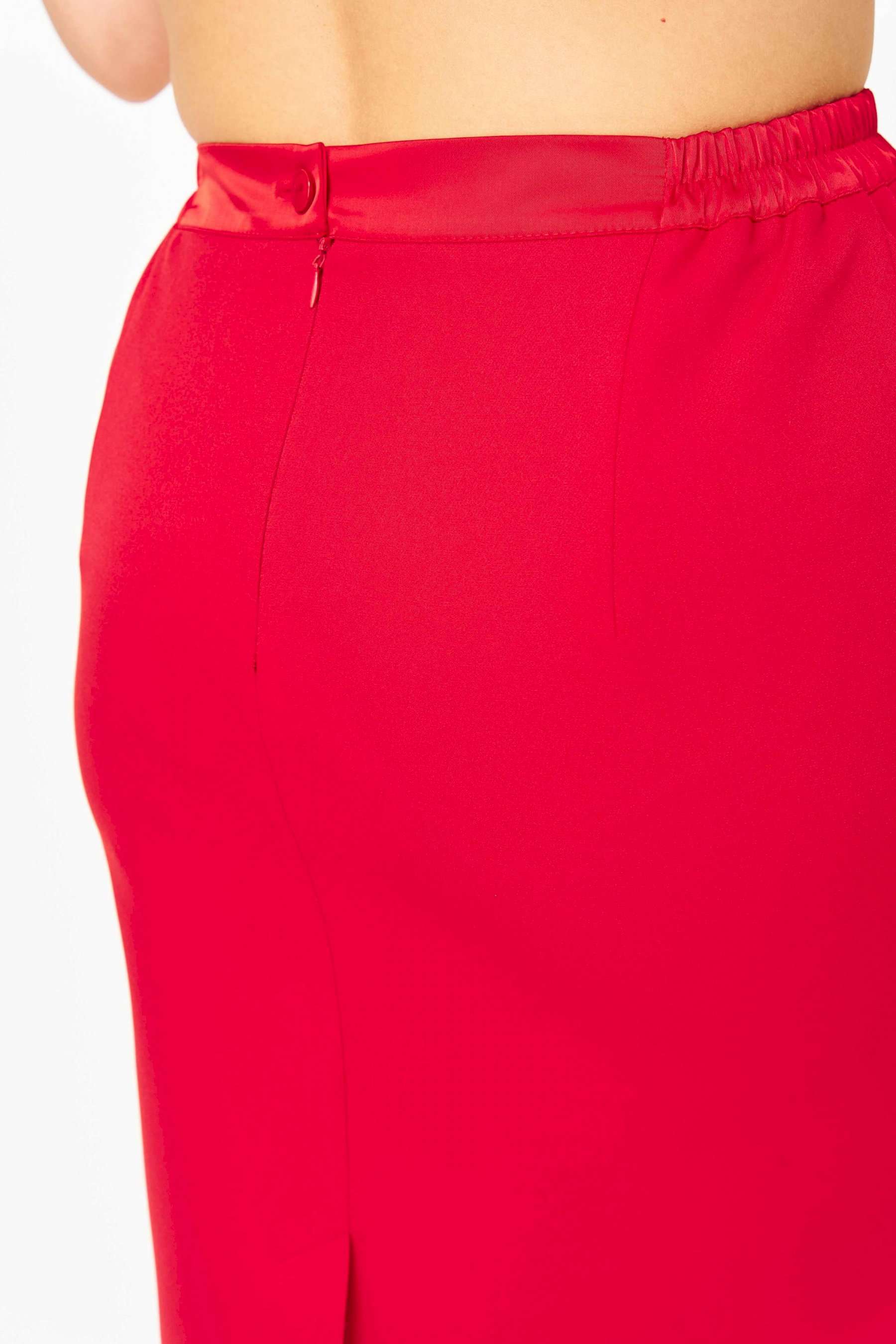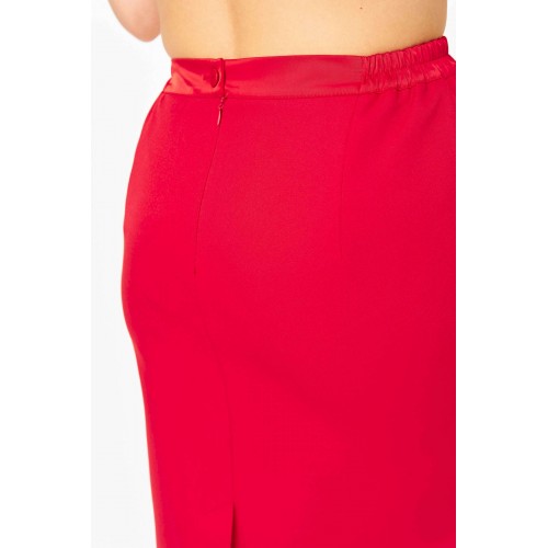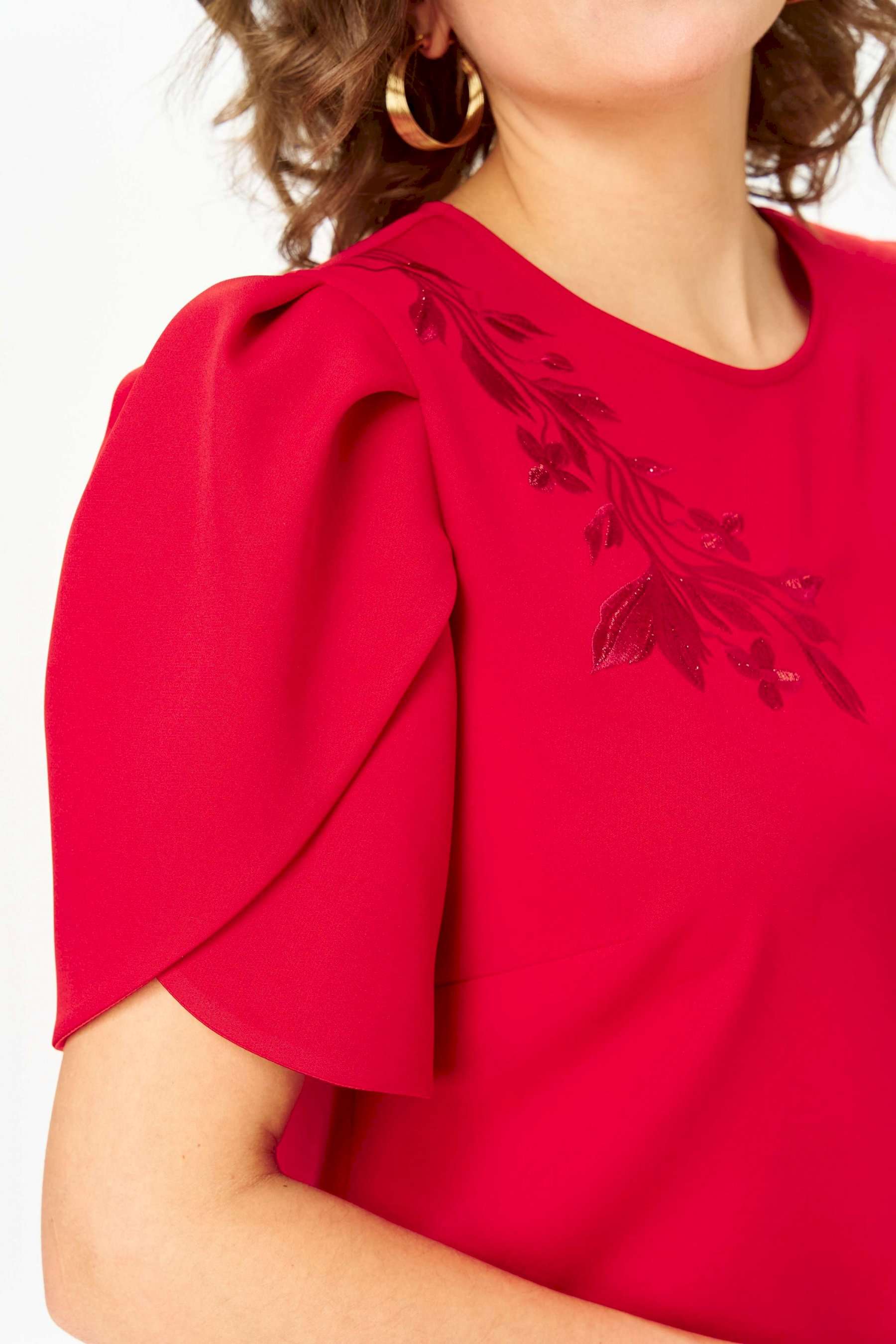 Костюм женский двухпредметный, состоящий из блузы и юбки. Блуза прямого силуэта, декорированная вышивкой, с нагрудными вытачками, выходящими из боковых швов, и с разрезами. Спинка со средним швом, в котором обработан разрез с навесной петлей и пуговицей. Горловина овальной формы. Рукава короткие фантазийной формы на запах со складками по окату. Рукав двойной, обтачен атласной тканью. Юбка-карандаш длиной до линии колена, с притачным поясом из атласа, на резинке между талиевыми вытачками. Заднее полотнище со средним швом, заканчивающимся шлицей. Застежка на одну петлю-пуговицу по поясу и тесьму-молнию в среднем шве.