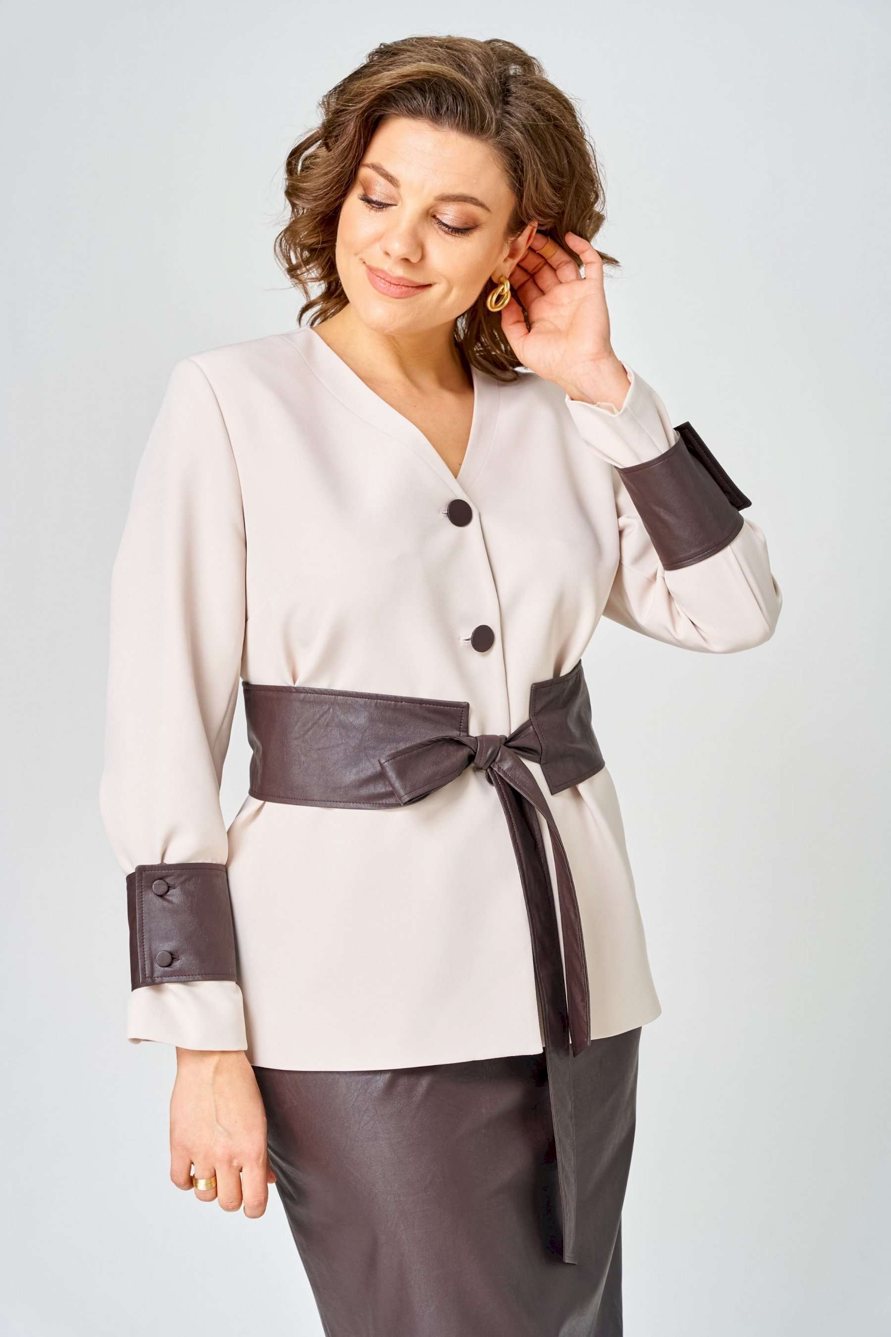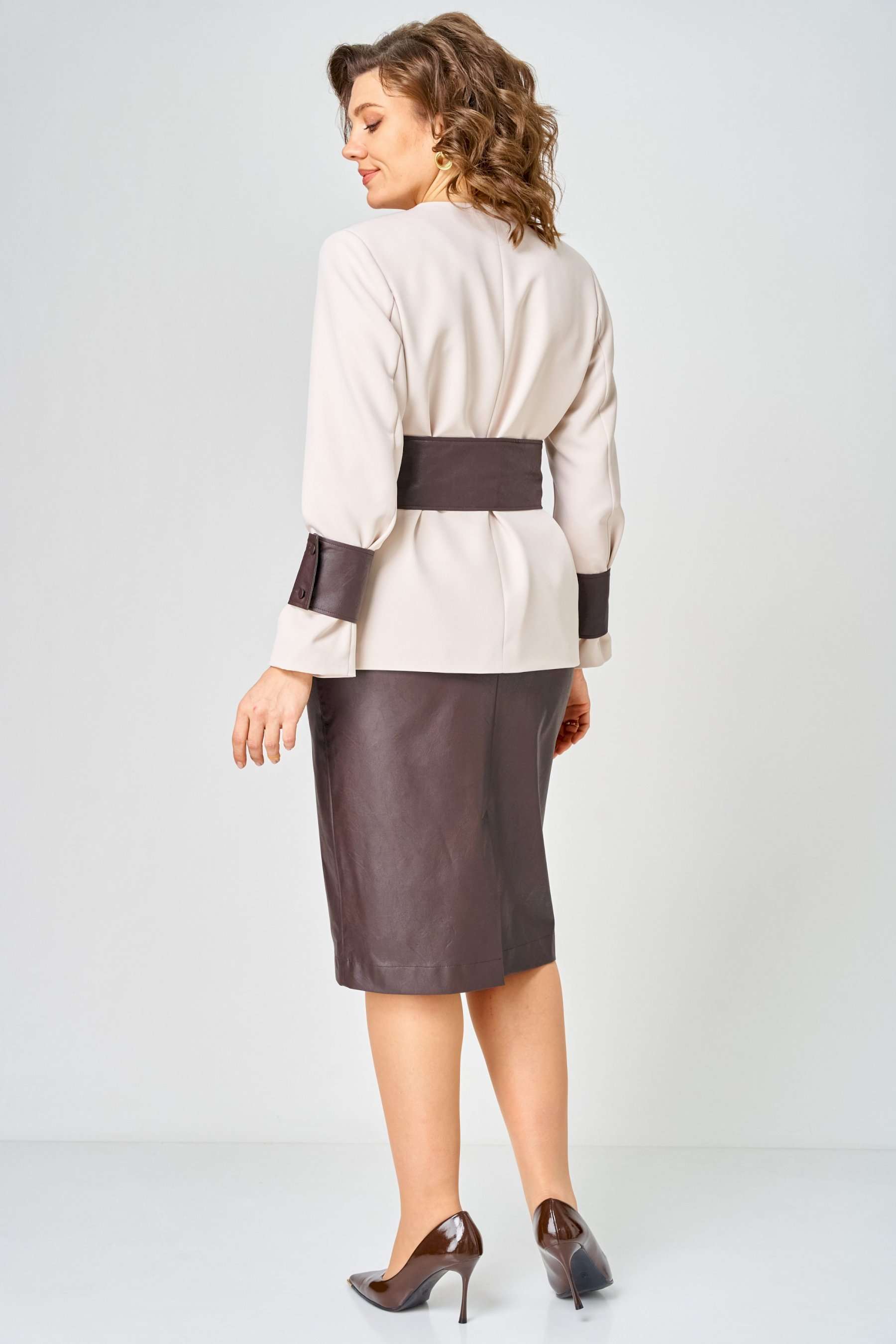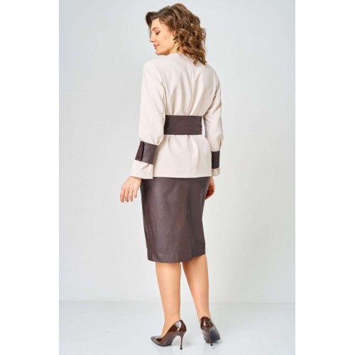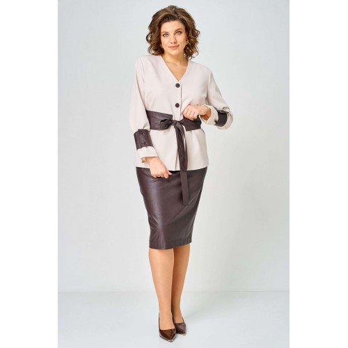 Костюм женский двухпредметный на подкладке, состоящий из жакета и юбки. Жакет полуприлегающего силуэта с центральной бортовой застежкой на 3 петли-пуговицы. Перед с нагрудной вытачкой. Спинка со средним швом. Горловина фигурной V-образной формы с фантазийным подрезом. Рукава втачные длинные одношовные. В изделии предусмотрены съемные манжеты на 2 петли-пуговицы, и съемные пояс фантазийной формы с завязками. Пояс и манжеты изготовлены из ткани, как и юбка. Юбка на подкладке, заужена книзу, с притачным поясом по бокам на резинке. На переднем и заднем полотнище обработаны талиевые вытачки. Застежка на петлю-пуговицу по поясу и тесьму-молнию в среднем шве спинки, заканчивающаяся шлицей.