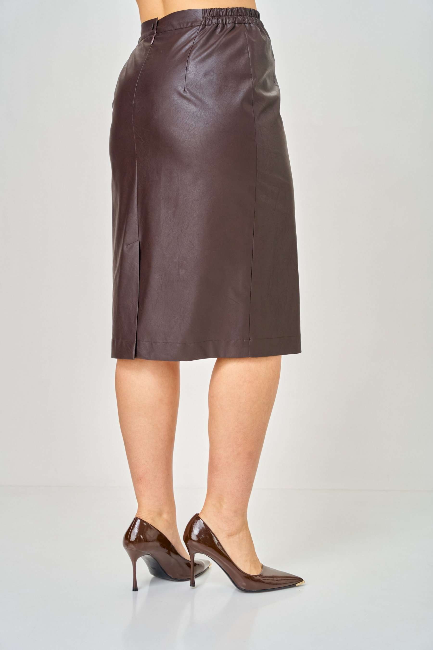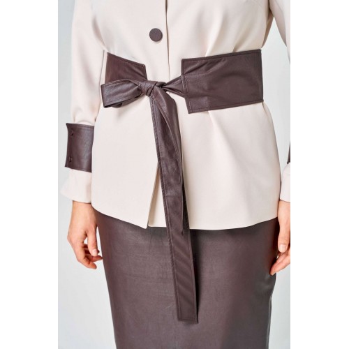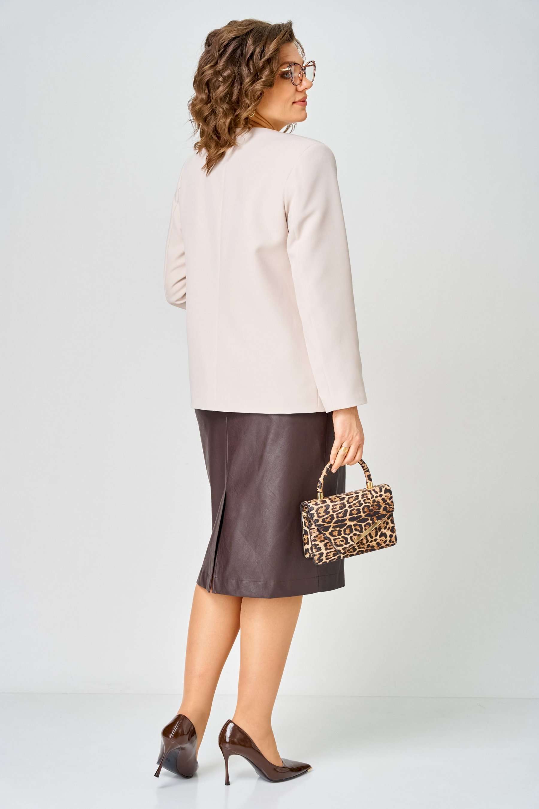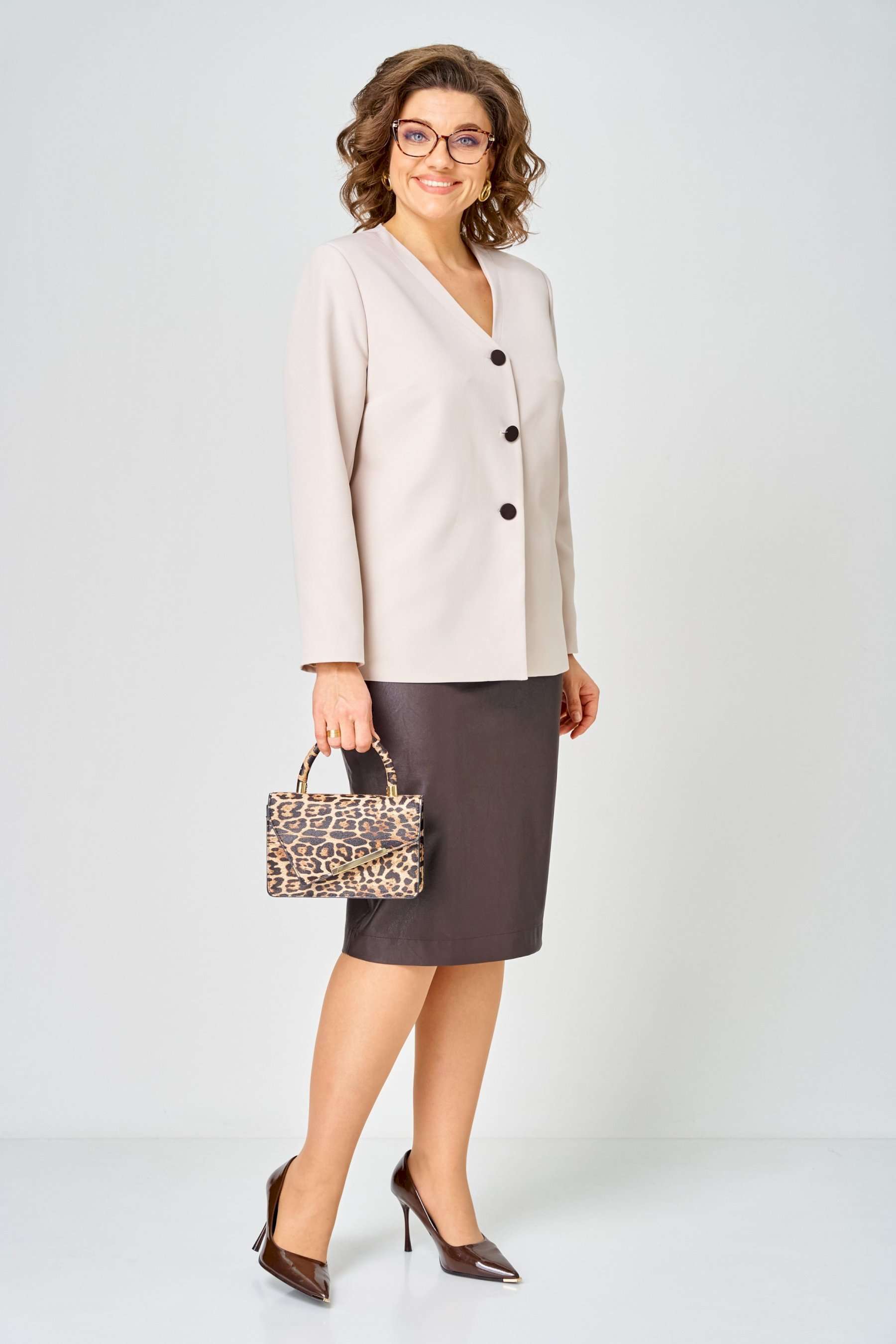 Костюм женский двухпредметный на подкладке, состоящий из жакета и юбки. Жакет полуприлегающего силуэта с центральной бортовой застежкой на 3 петли-пуговицы. Перед с нагрудной вытачкой. Спинка со средним швом. Горловина фигурной V-образной формы с фантазийным подрезом. Рукава втачные длинные одношовные. В изделии предусмотрены съемные манжеты на 2 петли-пуговицы, и съемные пояс фантазийной формы с завязками. Пояс и манжеты изготовлены из ткани, как и юбка. Юбка на подкладке, заужена книзу, с притачным поясом по бокам на резинке. На переднем и заднем полотнище обработаны талиевые вытачки. Застежка на петлю-пуговицу по поясу и тесьму-молнию в среднем шве спинки, заканчивающаяся шлицей.
