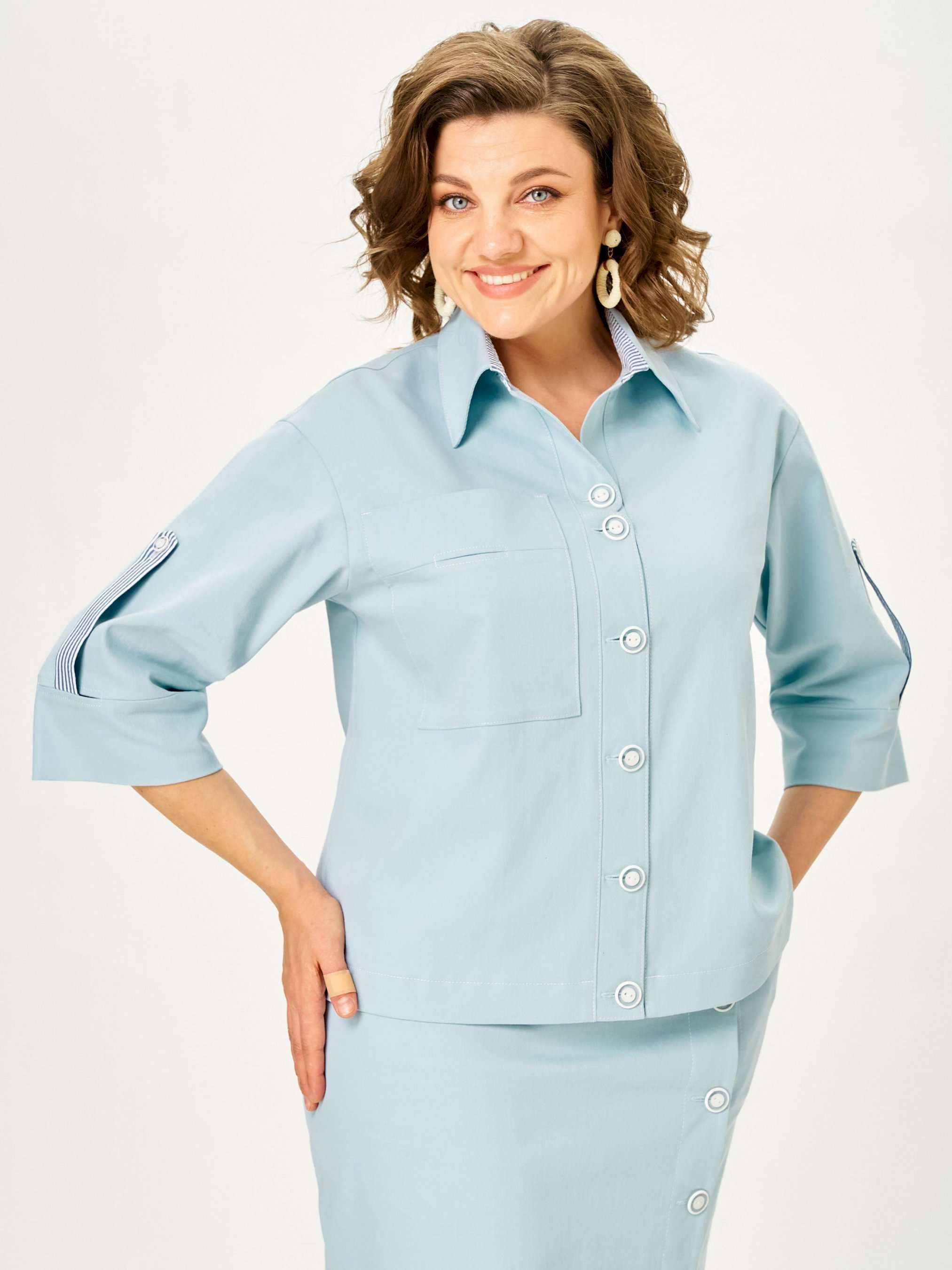 Костюм женский двухпредметный, состоящий из жакета без подкладки и юбки. Жакет прямого силуэта с притачной фантазийной планкой, состоящей из двух частей и застегивающейся на 1 петлю-пуговицу по верхней и 5 петель-пуговиц по нижней планке. На правой части переда в верхней части изделия настрочен накладной карман фантазийной формы с прорезью. Спинка с горизонтальной кокеткой и встречной складкой. Воротник с отрезной стойкой под застежку до верха. Изделие имеет спущенную линию проймы. Рукав рубашечный длиной ¾, одношовный, с притачной манжетой , в разрезе которой пришита пата на 1 петлю-пуговицу. Стойка воротника и пата изготовлены из отделочной ткани. Юбка с притачным поясом, сзади на резинке, заужена к низу, с боковыми карманами, наклонными к боковому шву. Переднее полотнище состоит из двух ассиметричных частей, в котором обработана застежка на 5 петель-пуговиц и 1 петлю-пуговицу по поясу изделия.
