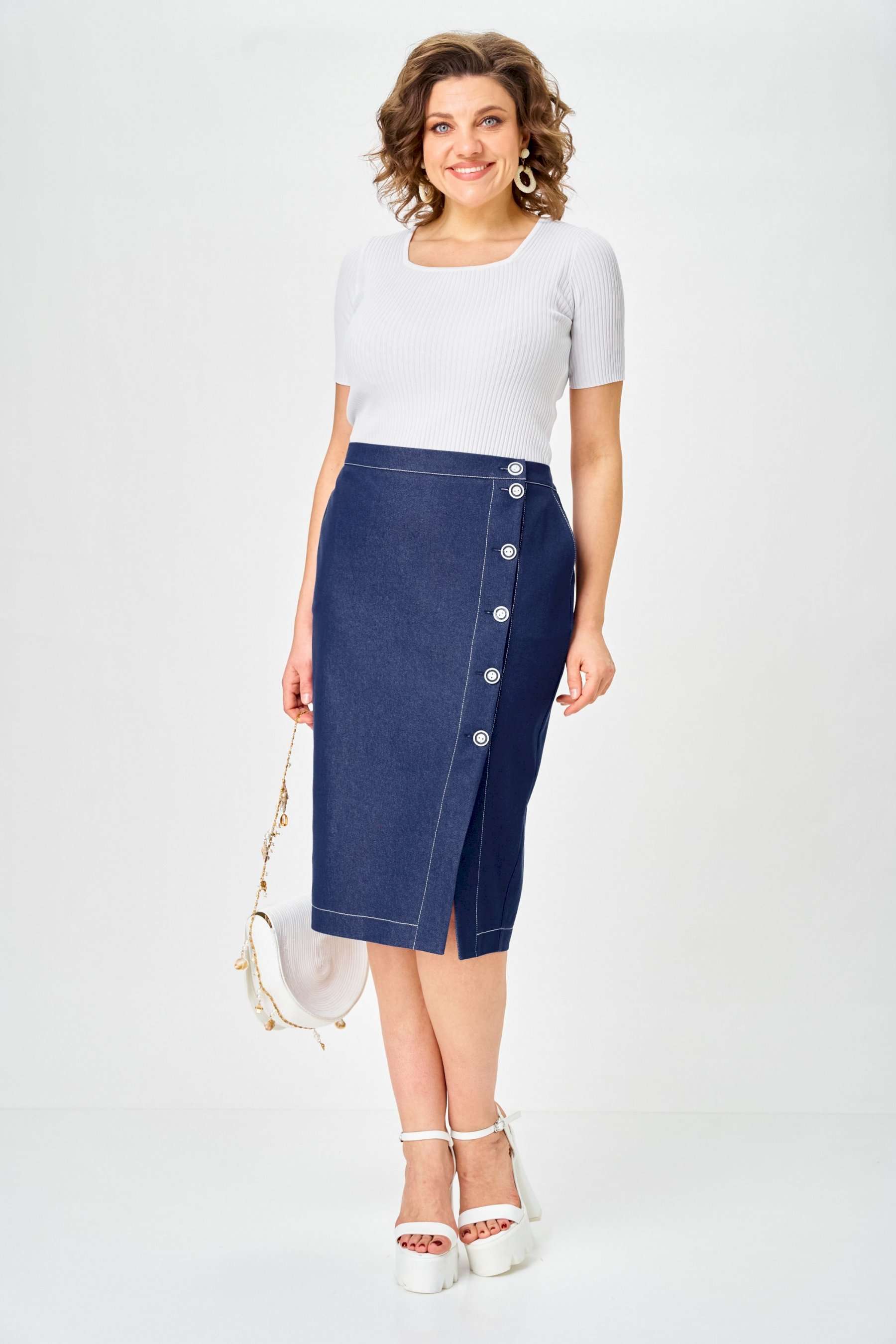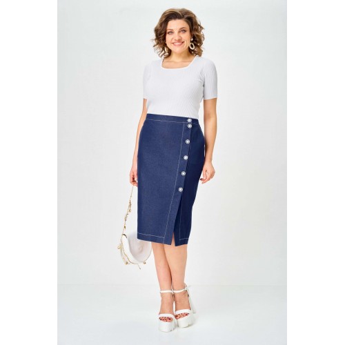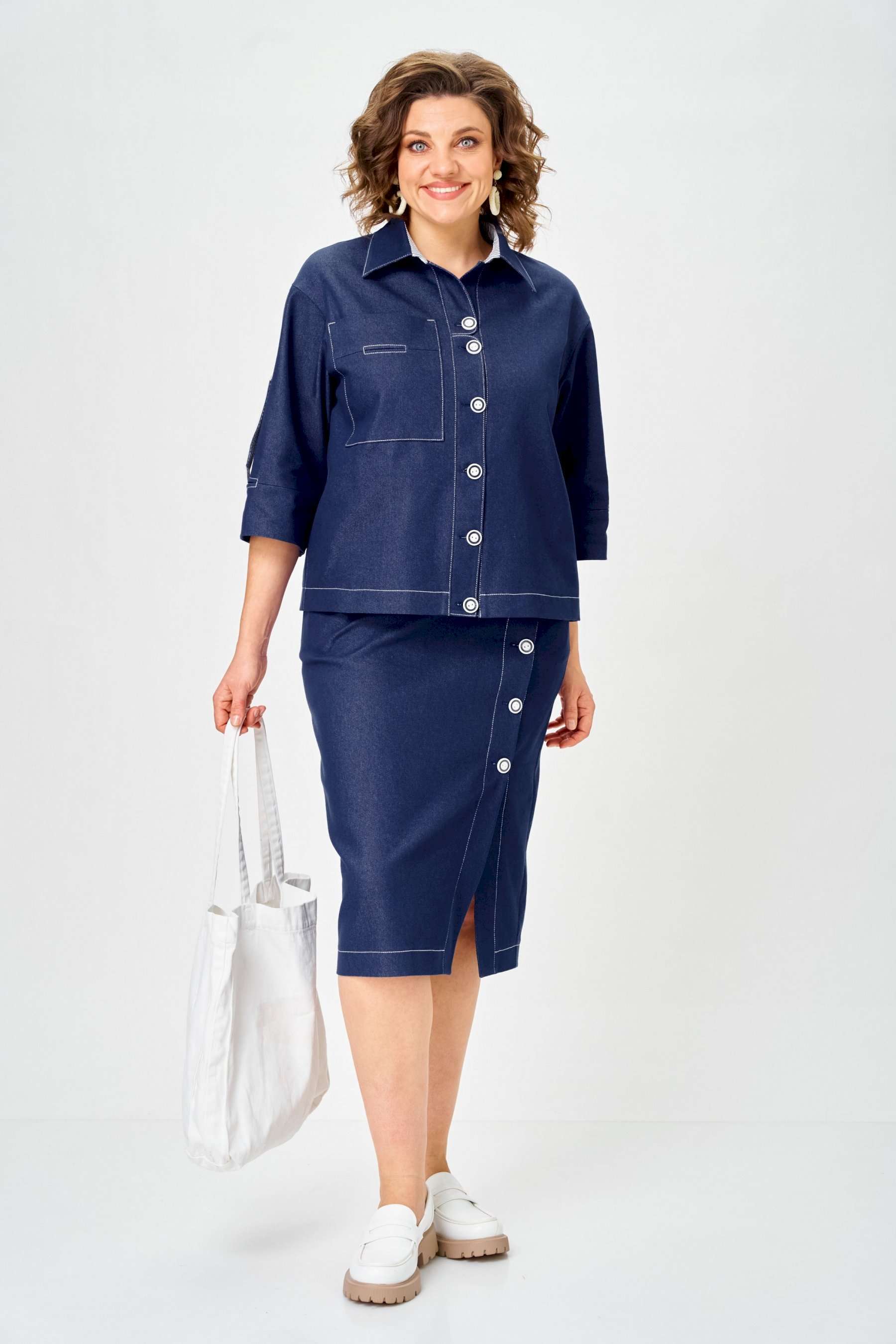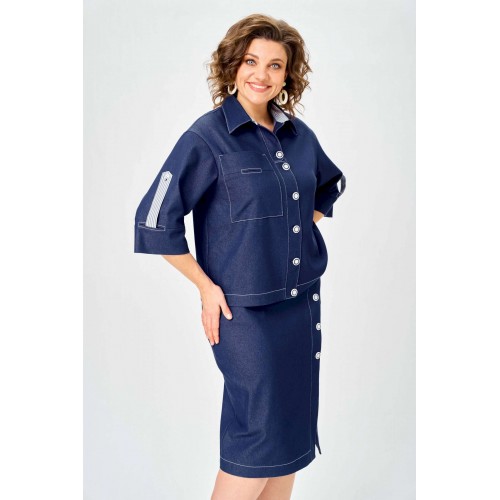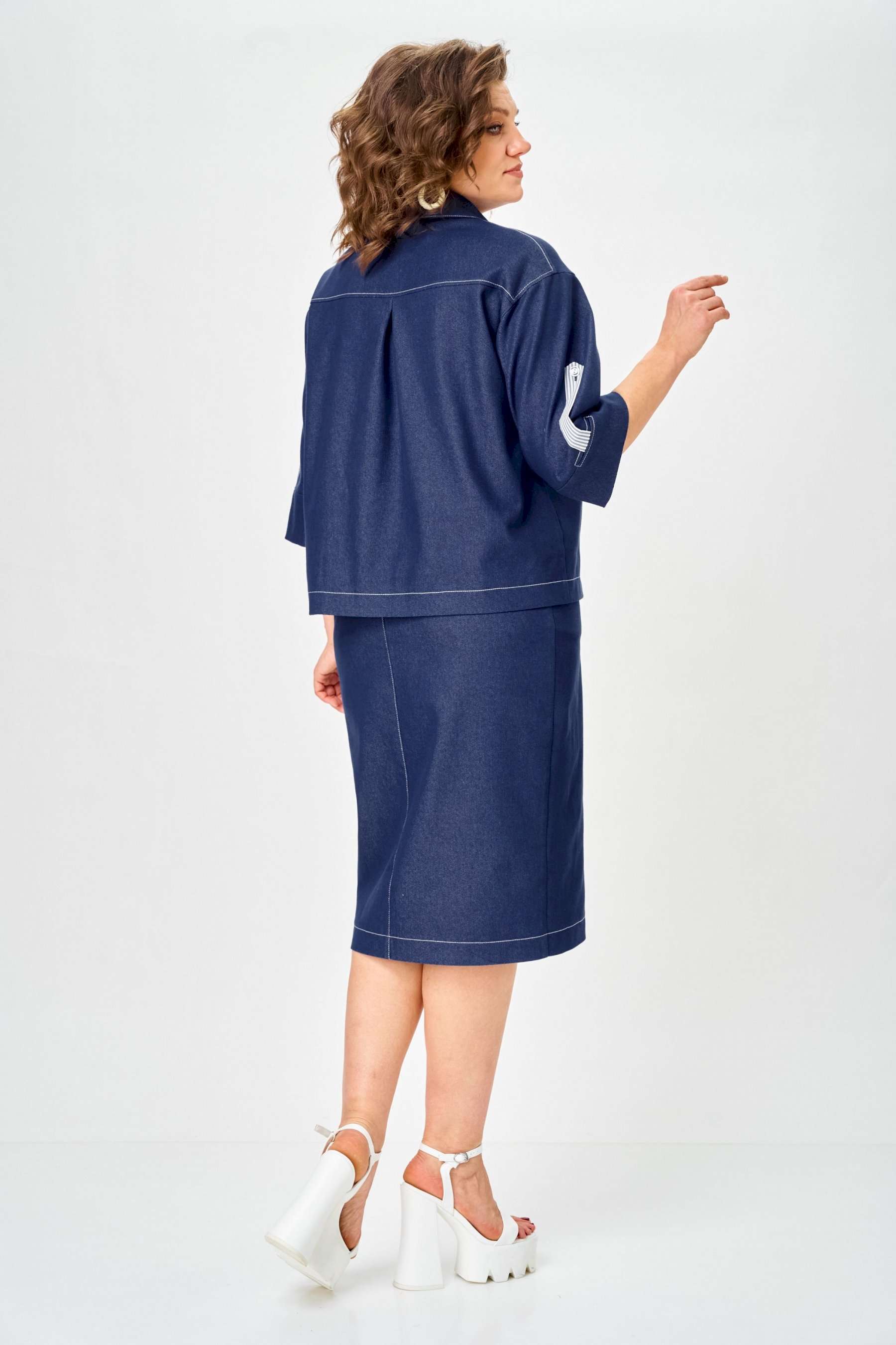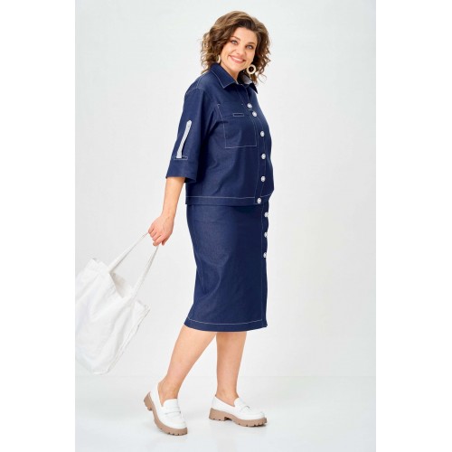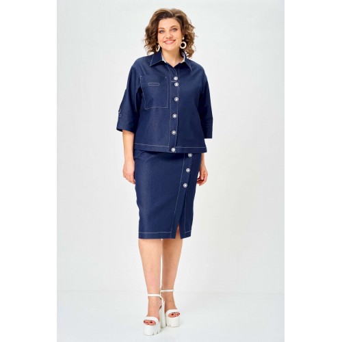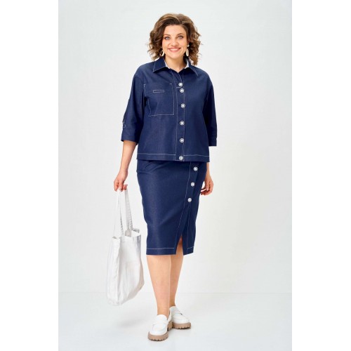 Костюм женский двухпредметный, состоящий из жакета без подкладки и юбки. Жакет прямого силуэта с притачной фантазийной планкой, состоящей из двух частей и застегивающейся на 1 петлю-пуговицу по верхней и 5 петель-пуговиц по нижней планке. На правой части переда в верхней части изделия настрочен накладной карман фантазийной формы с прорезью. Спинка с горизонтальной кокеткой и встречной складкой. Воротник с отрезной стойкой под застежку до верха. Изделие имеет спущенную линию проймы. Рукав рубашечный длиной ¾, одношовный, с притачной манжетой , в разрезе которой пришита пата на 1 петлю-пуговицу. Стойка воротника и пата изготовлены из отделочной ткани. Юбка с притачным поясом, сзади на резинке, заужена к низу, с боковыми карманами, наклонными к боковому шву. Переднее полотнище состоит из двух ассиметричных частей, в котором обработана застежка на 5 петель-пуговиц и 1 петлю-пуговицу по поясу изделия.