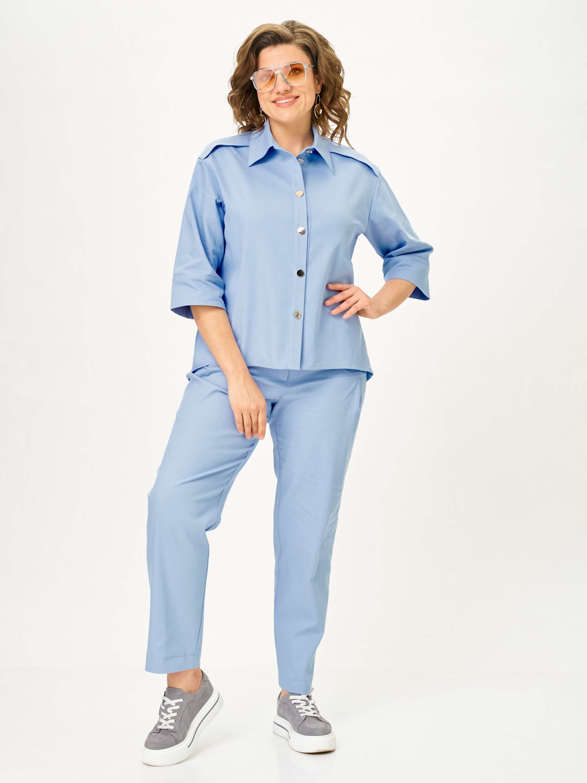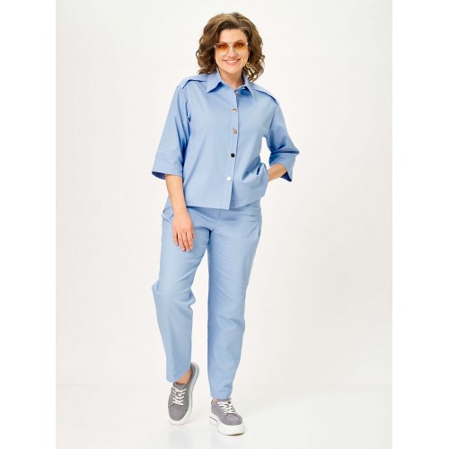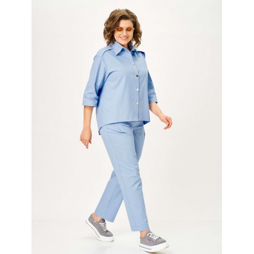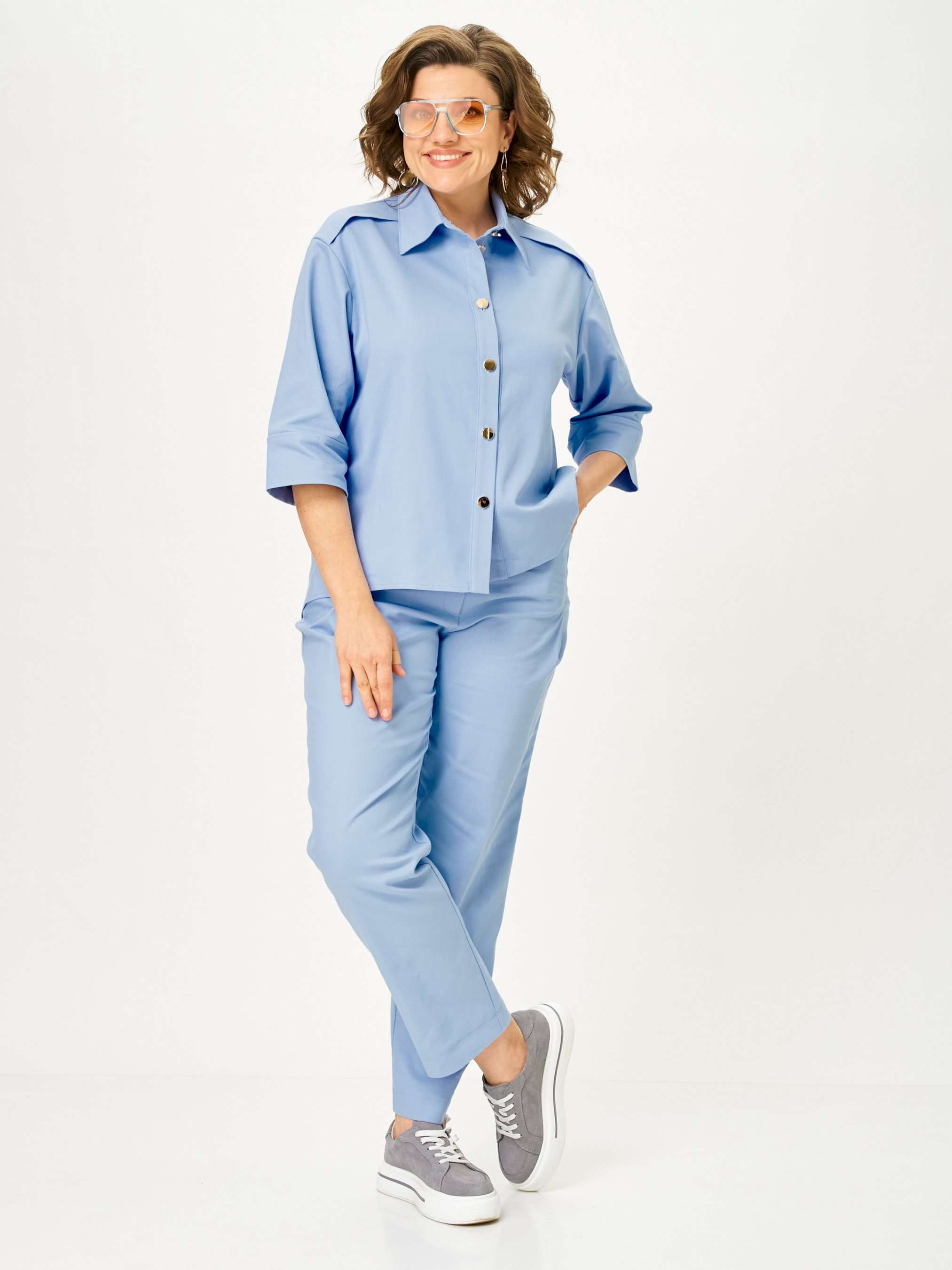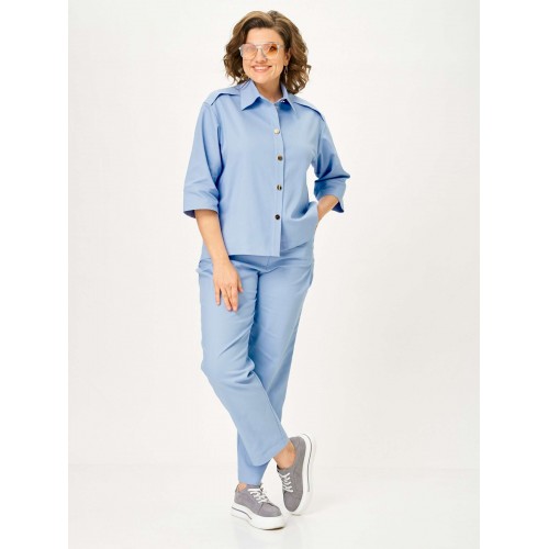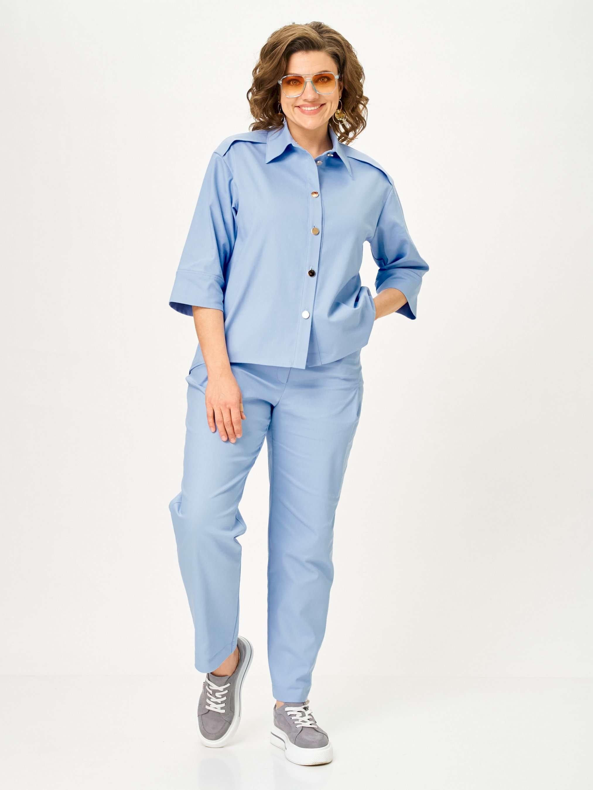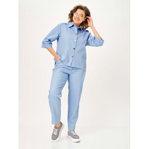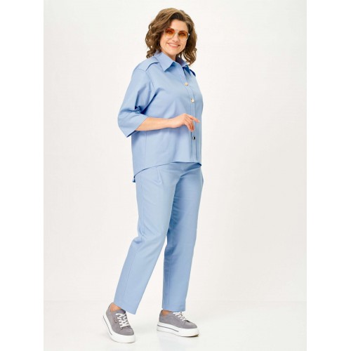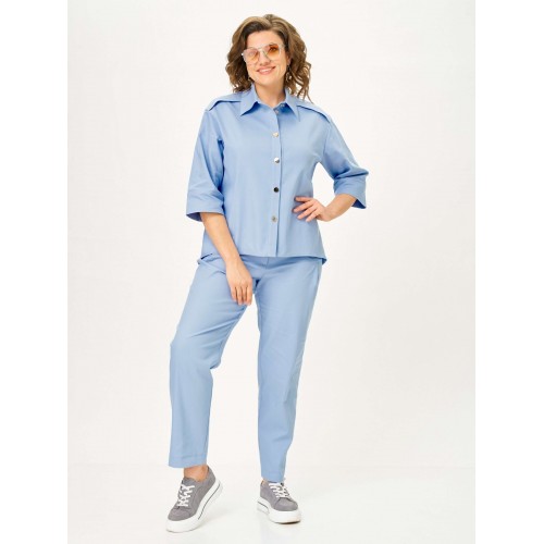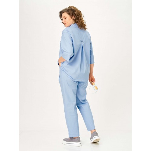 Костюм женский двухпредметный, состоящий из блузы и брюк. Блуза с застежкой доверху с притачной планкой на 5 петель-пуговиц и 1 петлю-пуговицу на стойке. По плечевым швам вставлена отлетная кокетка. Спинка со встречной складкой, зашитой сверху, и с настрочной шлевкой. Изделие со спущенной линией проймы. Воротник отложной с застежкой доверху. Рукава одношовные с притачной манжетой, длиной ¾. Брюки с притачным поясом сзади на резинке. Застежка на тесьму-молнию и 1 петлю-пуговицу по поясу. Карман фигурной формы с односторонней складкой, выходящей из кармана. На задних половинках обработаны фигурные кокетки. По поясу имеются шлевки – по 1 шт. на передних половинках и 2 фантазийные по среднему шву задних половинок.