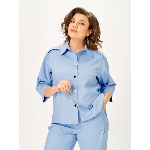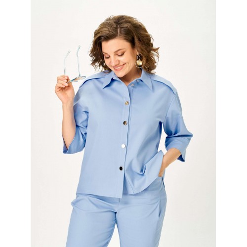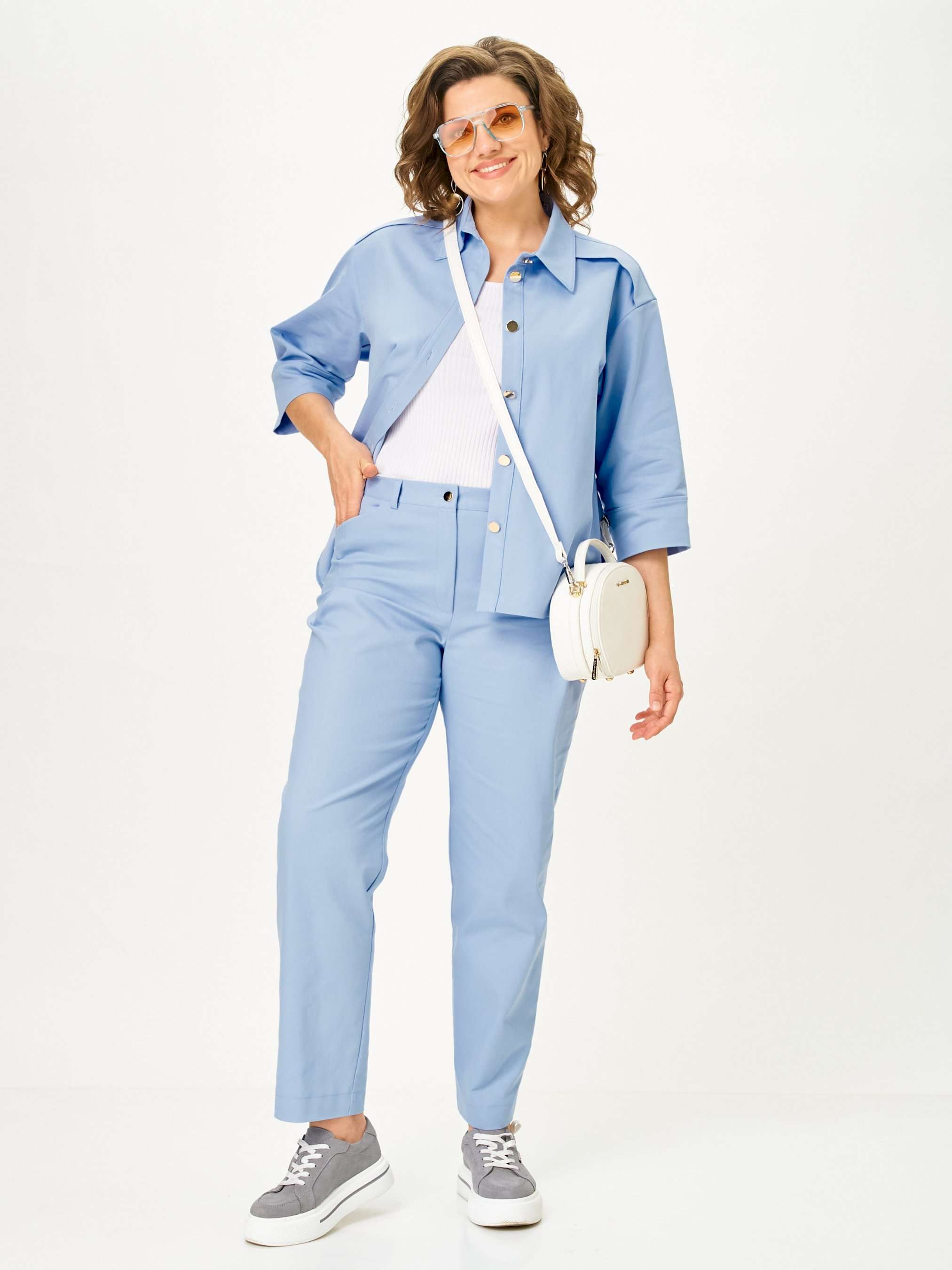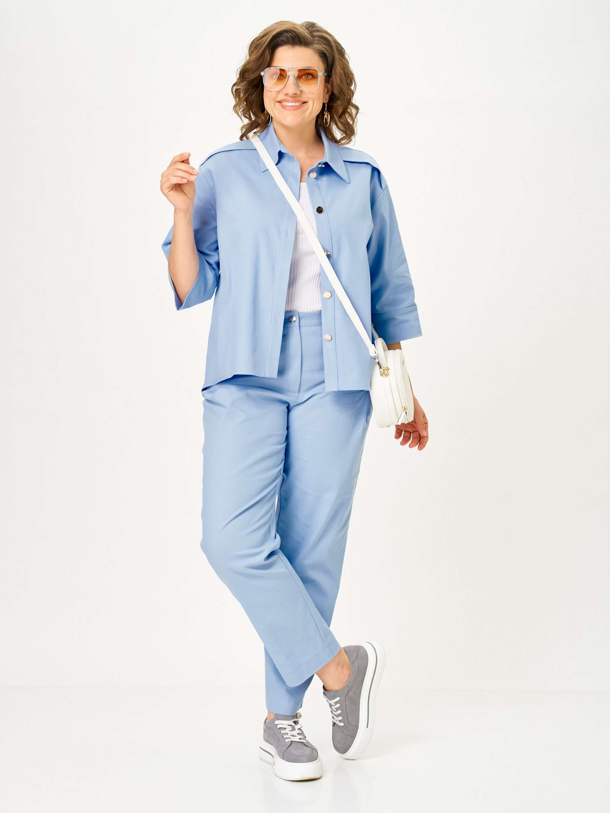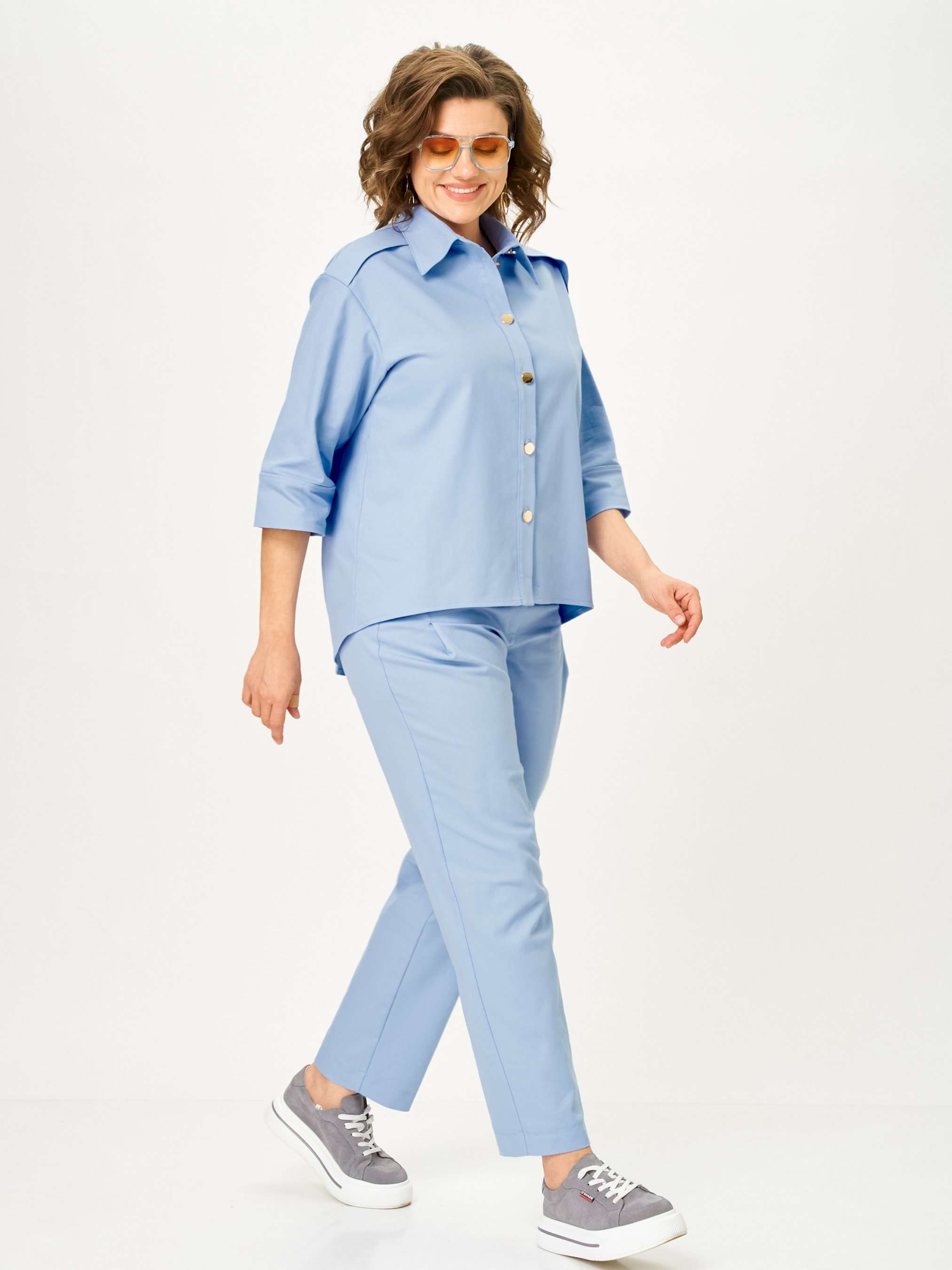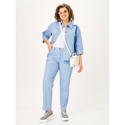 Костюм женский двухпредметный, состоящий из блузы и брюк. Блуза с застежкой доверху с притачной планкой на 5 петель-пуговиц и 1 петлю-пуговицу на стойке. По плечевым швам вставлена отлетная кокетка. Спинка со встречной складкой, зашитой сверху, и с настрочной шлевкой. Изделие со спущенной линией проймы. Воротник отложной с застежкой доверху. Рукава одношовные с притачной манжетой, длиной ¾. Брюки с притачным поясом сзади на резинке. Застежка на тесьму-молнию и 1 петлю-пуговицу по поясу. Карман фигурной формы с односторонней складкой, выходящей из кармана. На задних половинках обработаны фигурные кокетки. По поясу имеются шлевки – по 1 шт. на передних половинках и 2 фантазийные по среднему шву задних половинок.