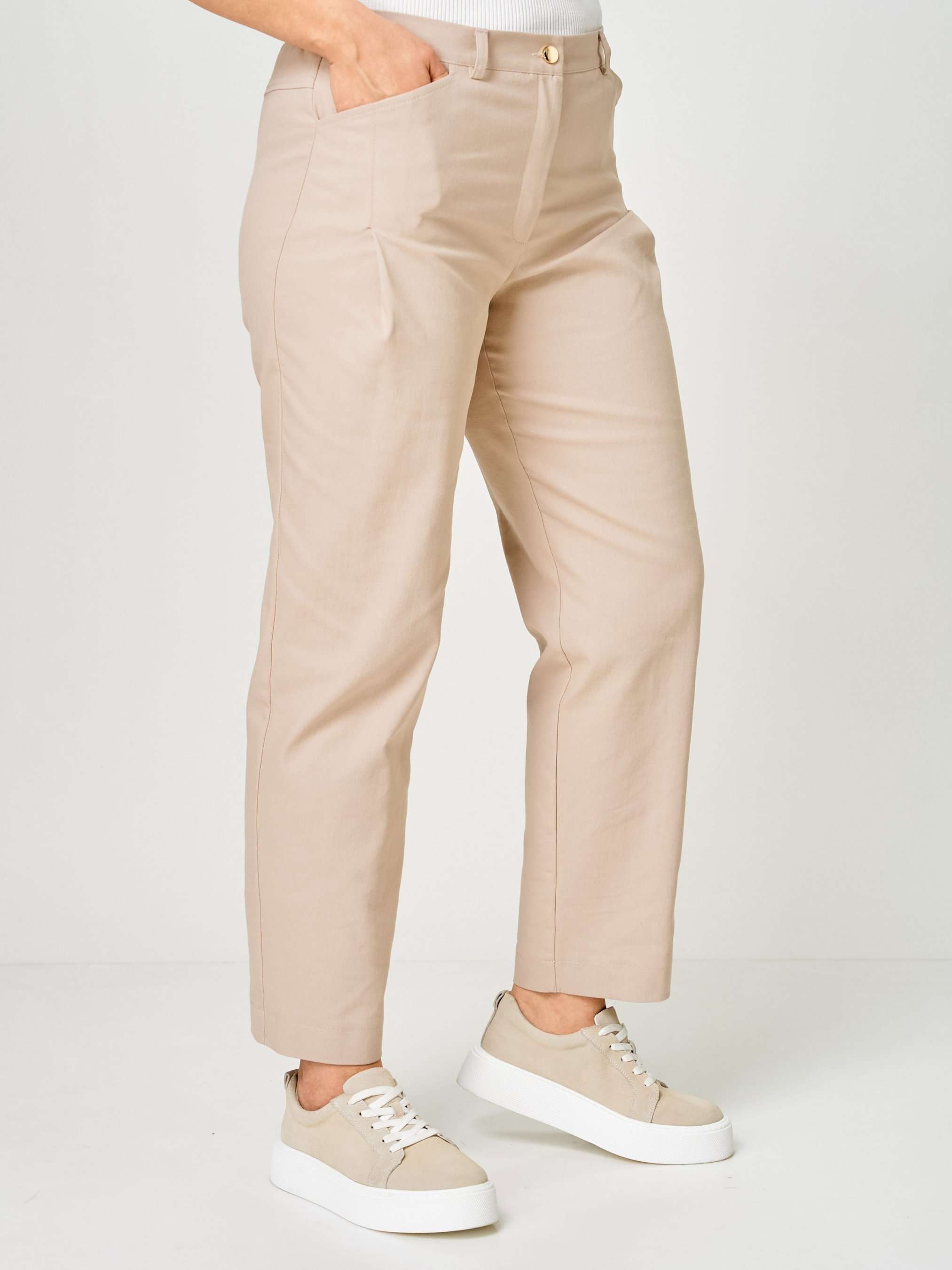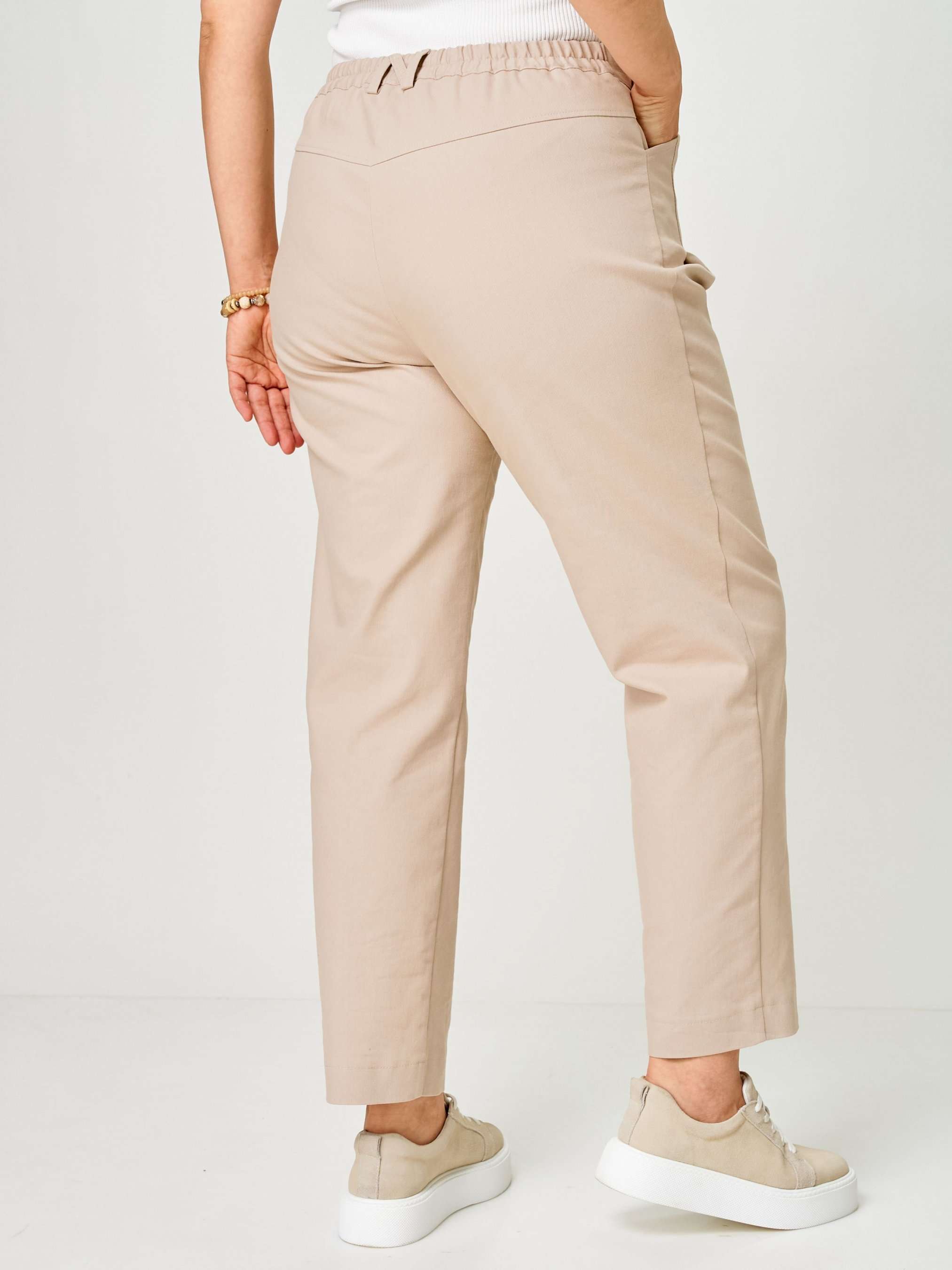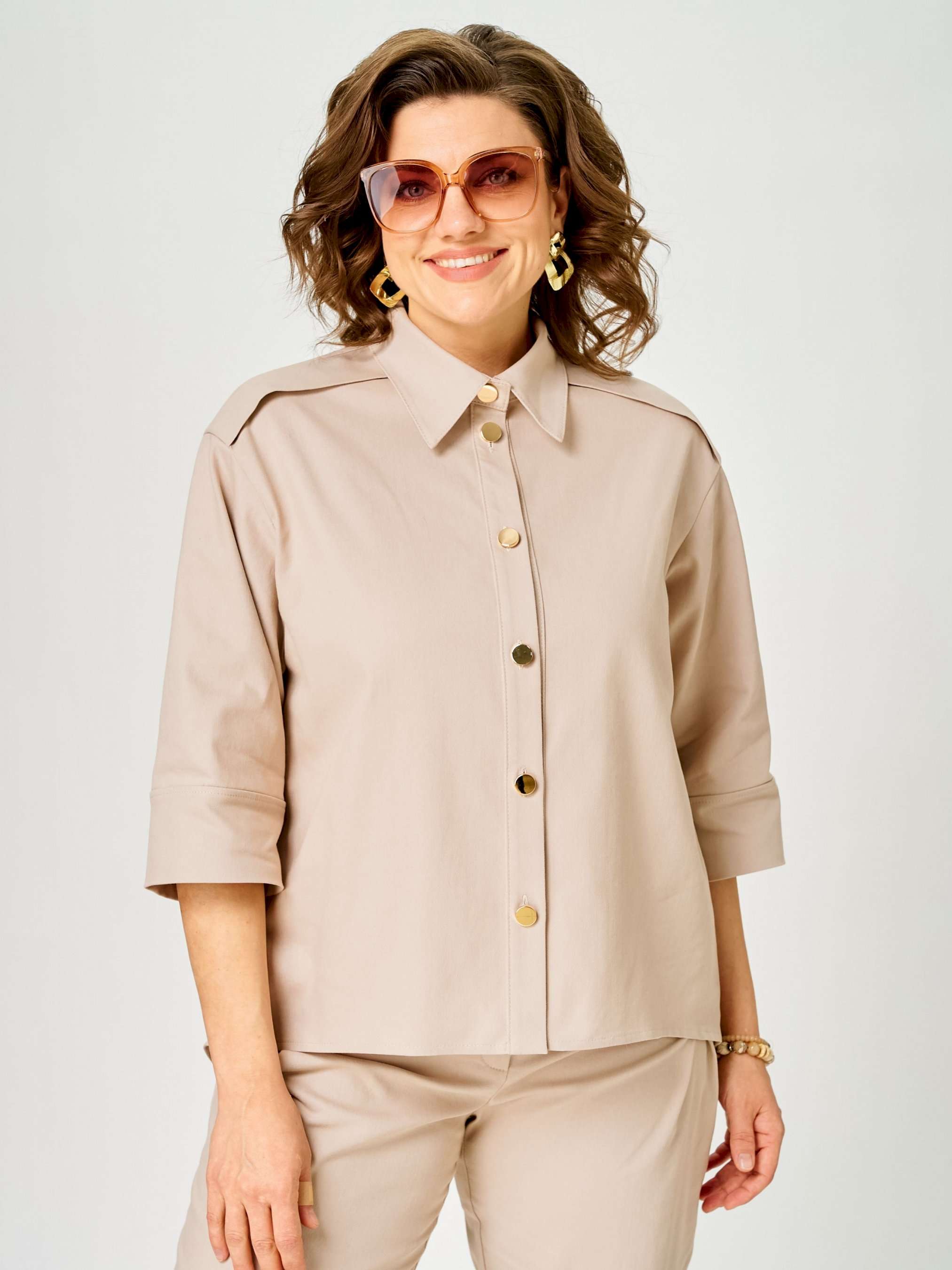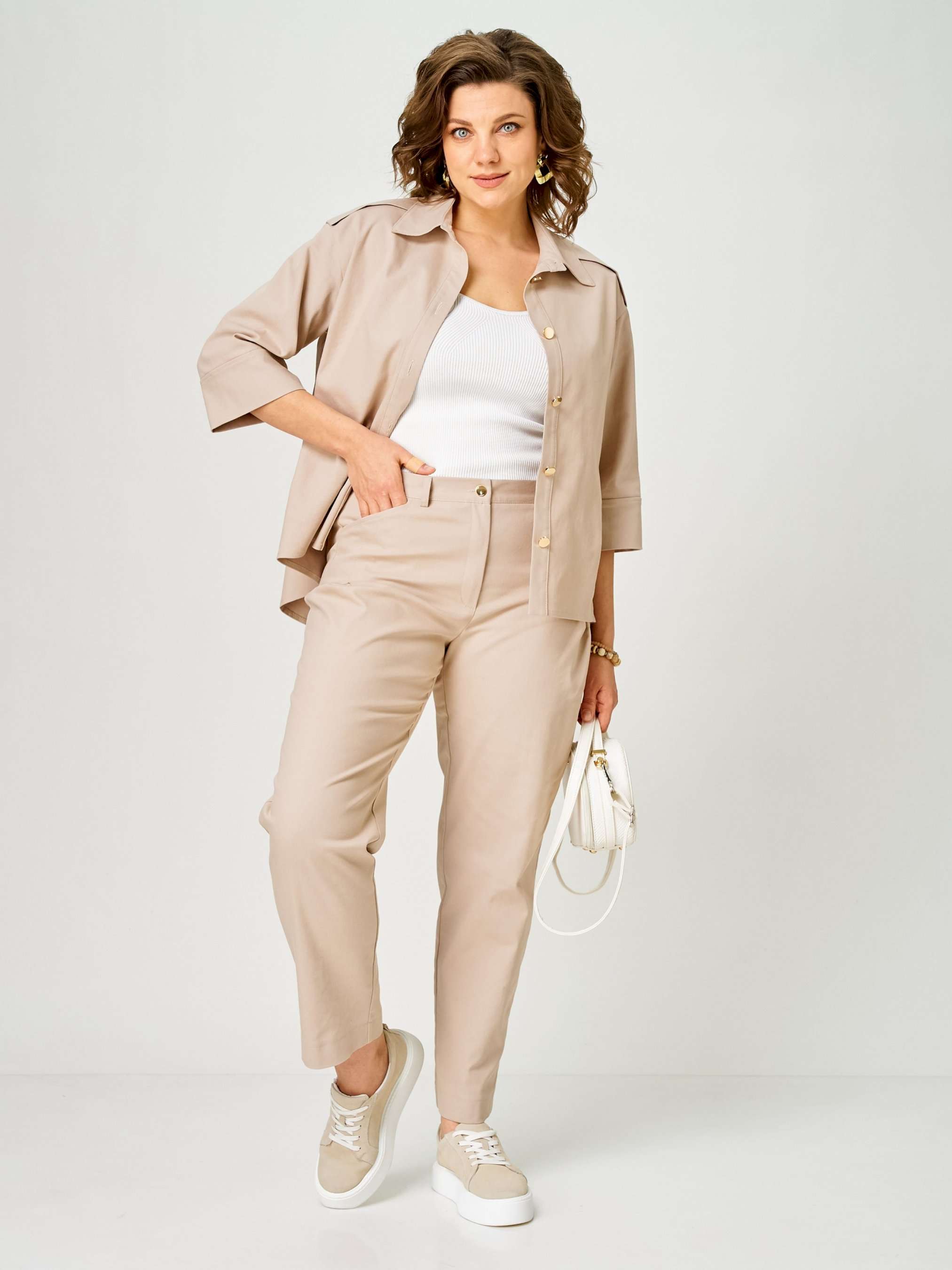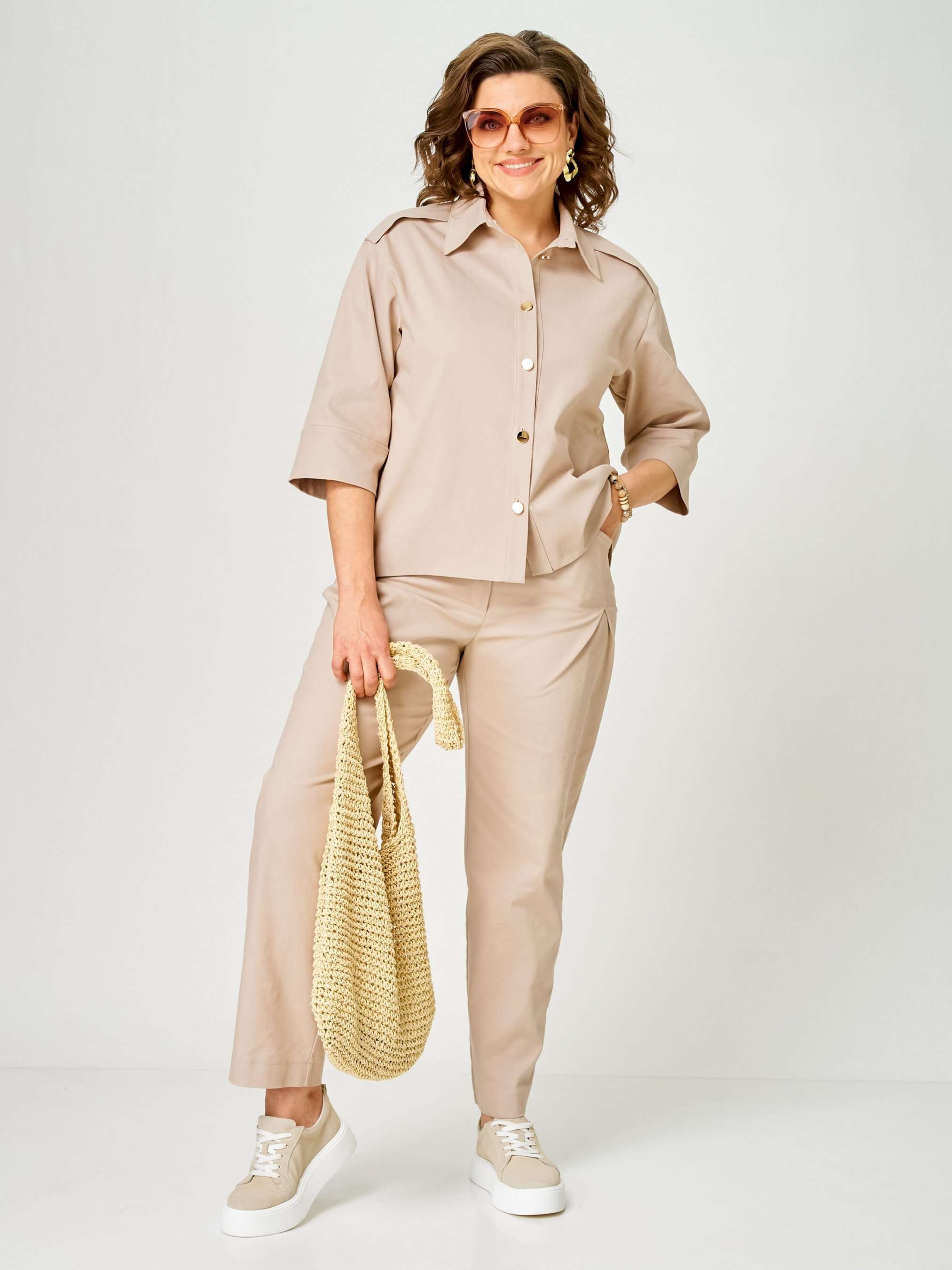Костюм женский двухпредметный, состоящий из блузы и брюк. Блуза с застежкой доверху с притачной планкой на 5 петель-пуговиц и 1 петлю-пуговицу на стойке. По плечевым швам вставлена отлетная кокетка. Спинка со встречной складкой, зашитой сверху, и с настрочной шлевкой. Изделие со спущенной линией проймы. Воротник отложной с застежкой доверху. Рукава одношовные с притачной манжетой, длиной ¾. Брюки с притачным поясом сзади на резинке. Застежка на тесьму-молнию и 1 петлю-пуговицу по поясу. Карман фигурной формы с односторонней складкой, выходящей из кармана. На задних половинках обработаны фигурные кокетки. По поясу имеются шлевки – по 1 шт. на передних половинках и 2 фантазийные по среднему шву задних половинок.