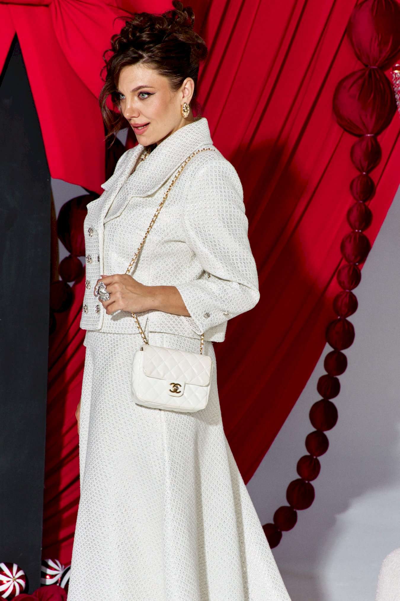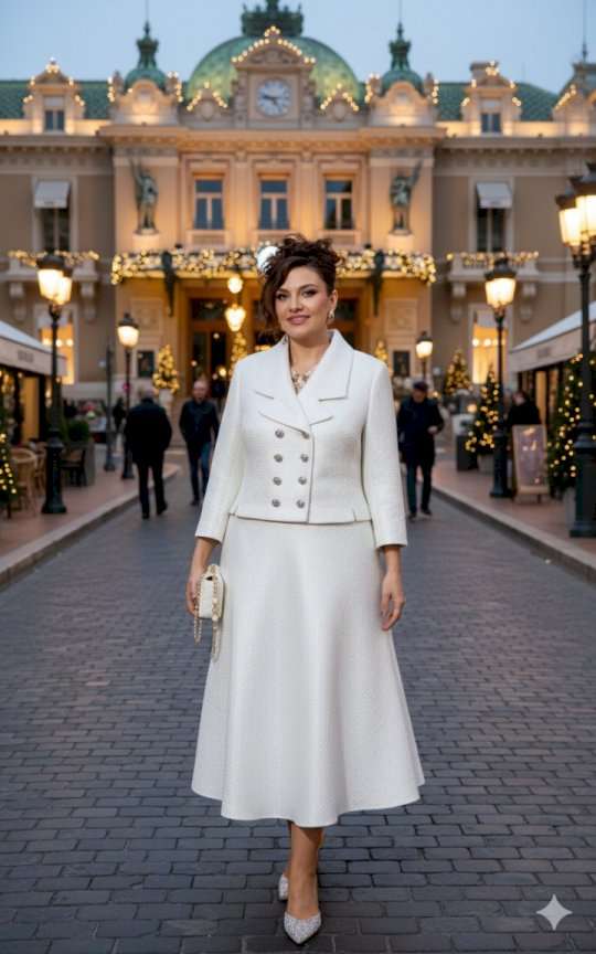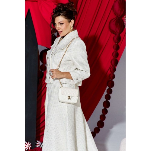 Изящный женский юбочный костюм из твида в стиле Шанель, состоящий из жакета и юбки, подчеркнет Ваш стиль, где элегантность и сдержанность сочетаются с яркой роскошью! Мерцающее на свету перламутровое напыление подчеркивает богатую фактуру твида, и создает неповторимое праздничное настроение! Рыхлая и подвижная структура позволяет твиду красиво обрисовывать фигуру, скрывая все несовершенства и подчеркивая достоинства. Костюм состоит из жакета и юбки. Жакет прилегающего силуэта, укороченный с двубортной застежкой на петли и пуговицы, воротник отложной с лацканами пиджачного типа с закругленными краями. В жакете отрезные бочки с разрезами по низу. Спинка без особенностей. Рукав втачной, одношовный, длинной 7/8. Жакет на подкладке. Юбка расклешенная с притачным поясом с резинкой по спинке, по переду наклонные карманы. В боковом шве юбки застёжка на потайную молнию и пуговицу в поясе. Юбка на подкладке. Обращаем Ваше внимание, что фурнитура может незначительно отличаться от фото. Длина жакета по спинке 49 см, длина рукава 51 см. Длина юбки 81 см.