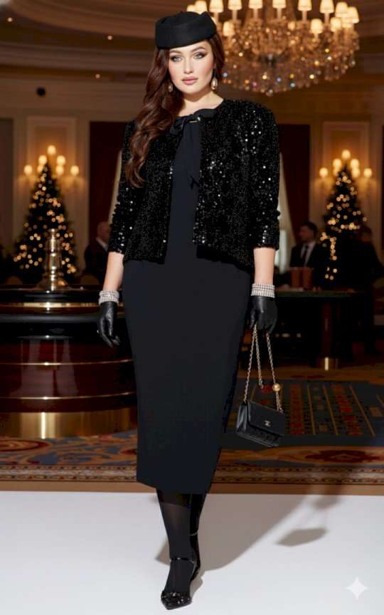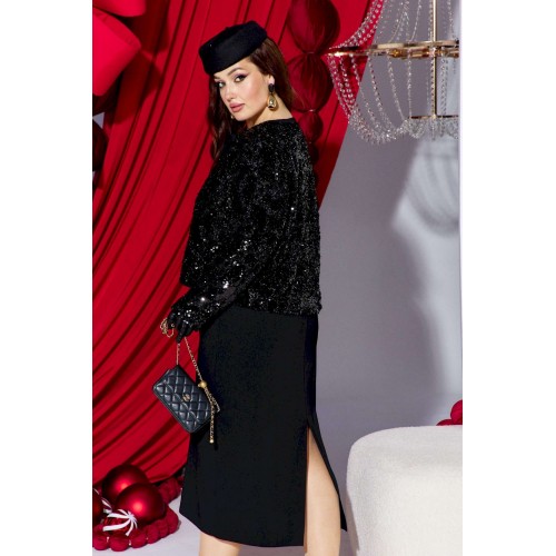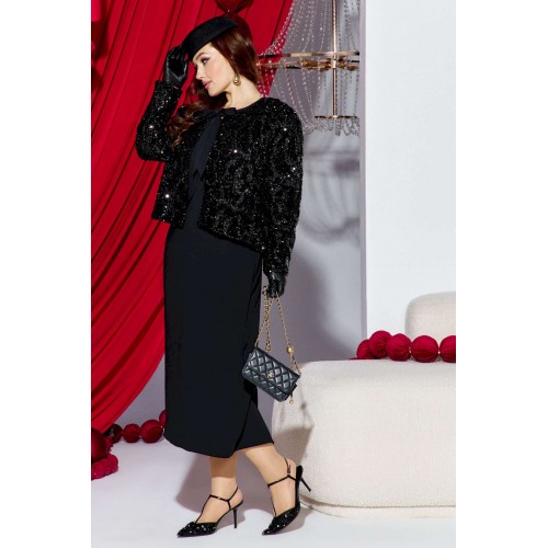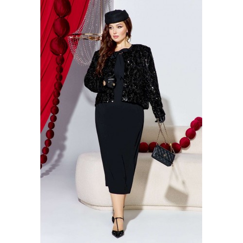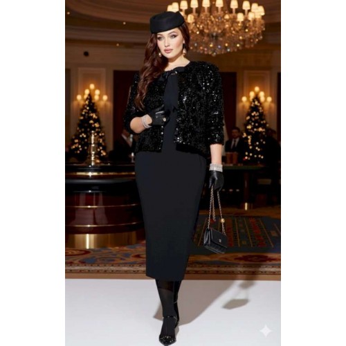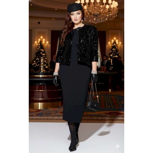 Если вы ищете идеальное сочетание стиля и комфорта, вот идеальный выбор - плательный комплект. Сочетание однотонного материала с фактурной пайеткой, придает образу интересную текстуру и современный вид, оставаясь при этом невероятно практичным. Глубокий черный цвет подчеркивает элегантность и универсальность модели, позволяя легко комбинировать ее с различными аксессуарами. Жакет укороченный, свободного силуэта, без застёжки, с акцентом на ровную линию плеч. Головина округлой формы с прилегающей стойкой из отделочной ткани переходящей в декоративные ленты завязывающиеся на бант. Спинка без особенностей. Рукав втачной, длинный. Жакет на подкладке. Платье полуприлегающего силуэта, с округлой формой горловины. По переду платья нагрудные вытачки. Спинка в платье со средним швом переходящим в разрез от низа, и с талиевыми вытачками. Линия плеча в платье слегка спущенная. Длина жакета по спинке 60 см, длина рукава 60 см. Длина платья 122 см, ширина плеча 13 см (р 50-54), 14 см (р 56-60).