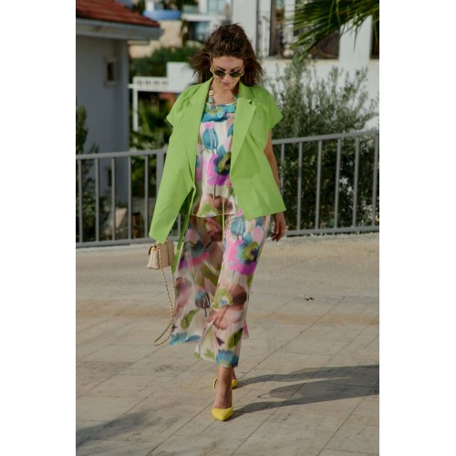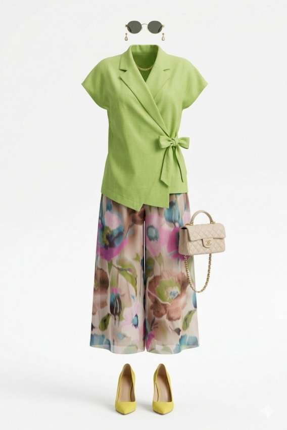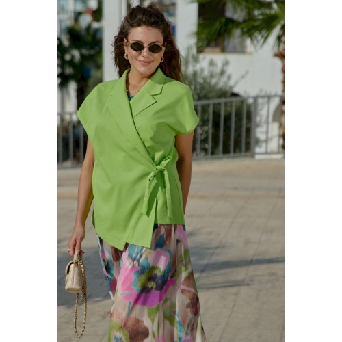 Джинсовая фактура переосмыслена: средняя плотность — достаточно структурированный, чтобы держать форму. Классический крой — но с современными деталями. Салатовый оттенок жакета— это не просто цвет, а заявление. Жакет работает как цветовой акцент: притягивает взгляд — становится центром композиции, оживляет образ — добавляет динамики и современности. Жакет прямого силуэта с воротником пиджачного типа, «на запах», фиксируется на фигура при помощи декоративных лент завязывающихся на узел. Спинка в жакете с вертикальным подрезом переходящим в отлетную шлицу. Линия плеча в жакет спущенная. Низ ассиметричный. Жакет достаточно универсален для офиса, а та же для особых мероприятий. Ключ к успешной стилизации — баланс: позвольте цветочным акцентам быть главными героями образа, а всё остальное пусть будет их достойным фоном. Помните — иногда одна яркая деталь говорит больше, чем целый ансамбль, и эта блузка именно такая деталь. Длина жакета по спинке 72 см.