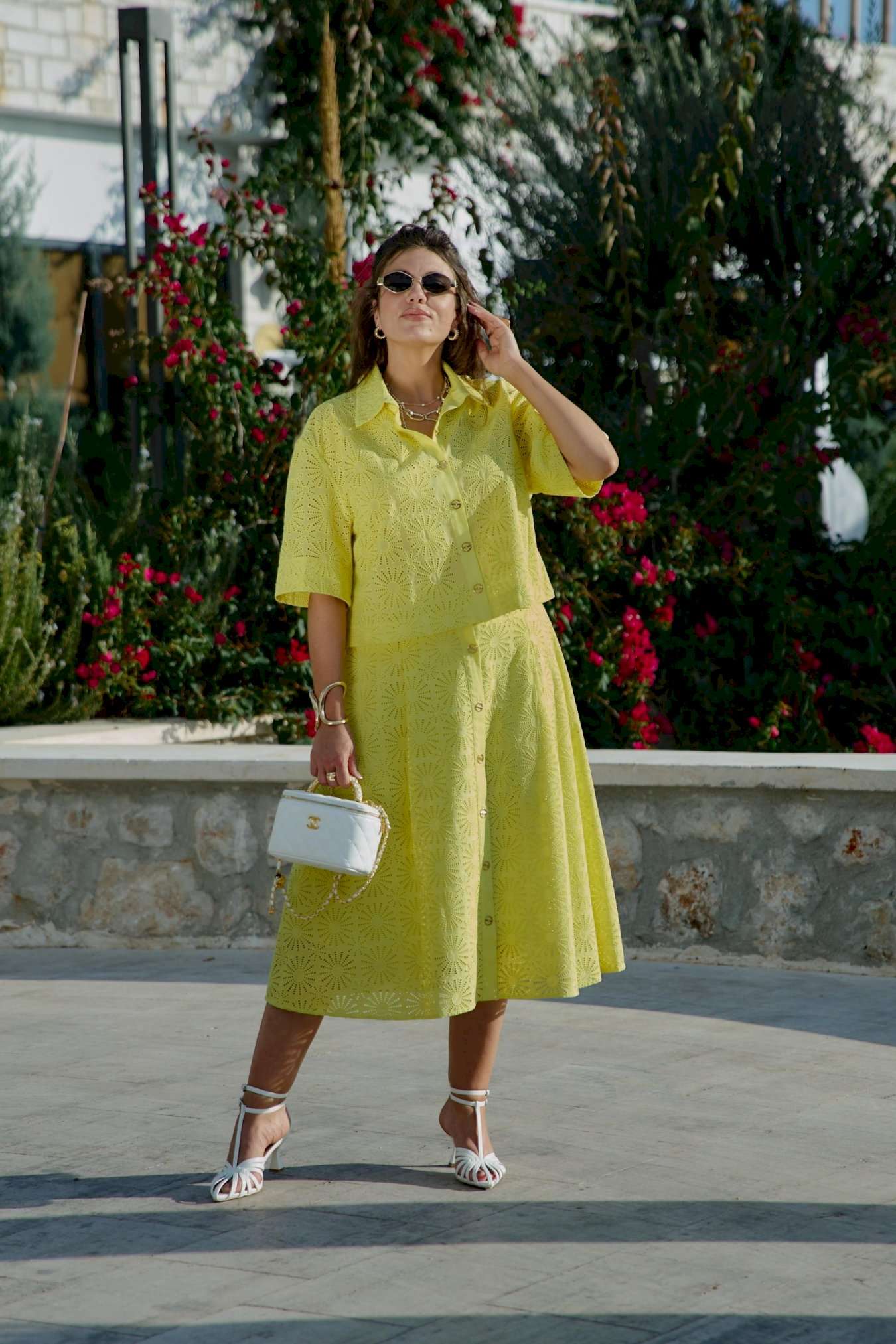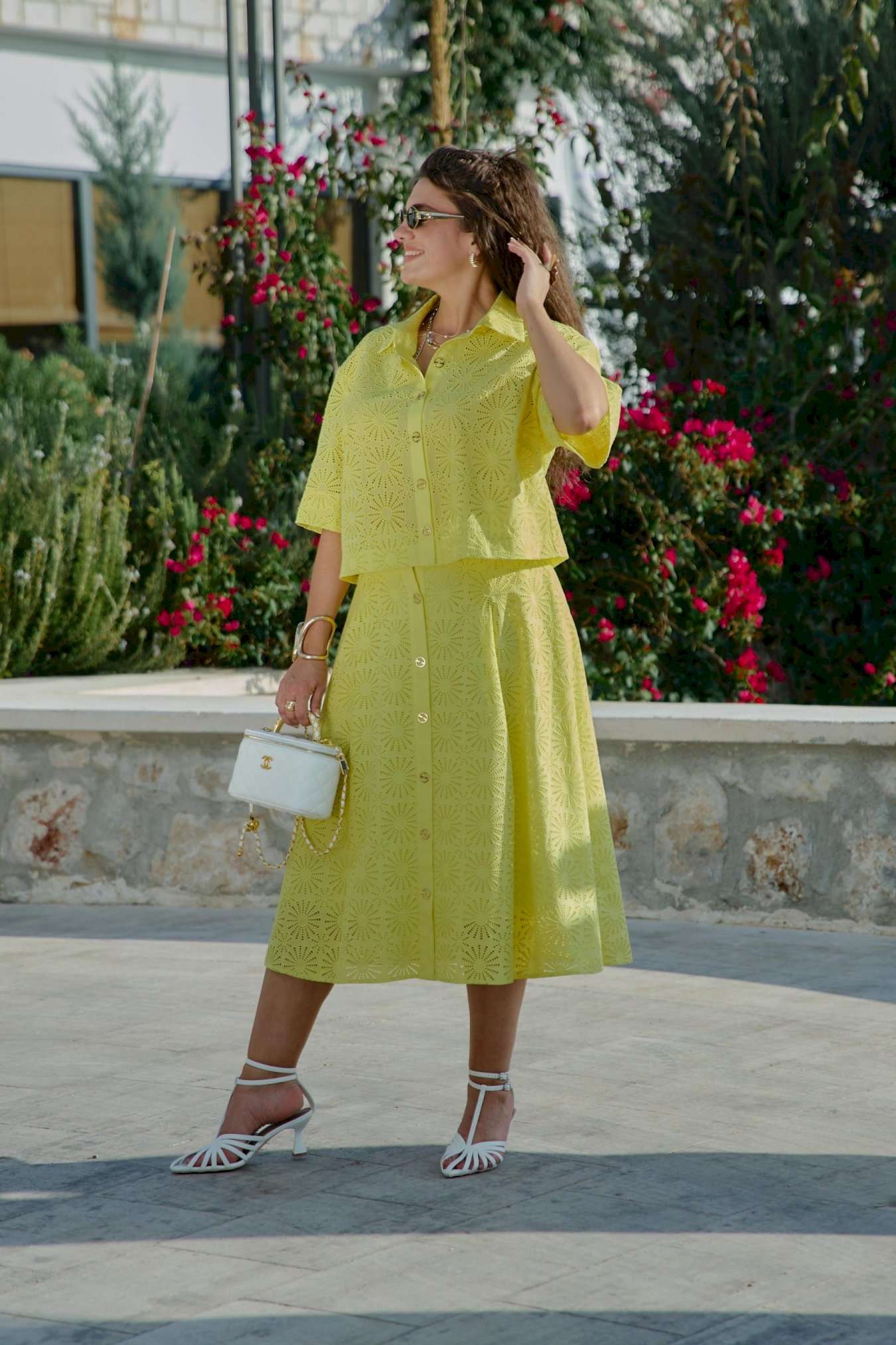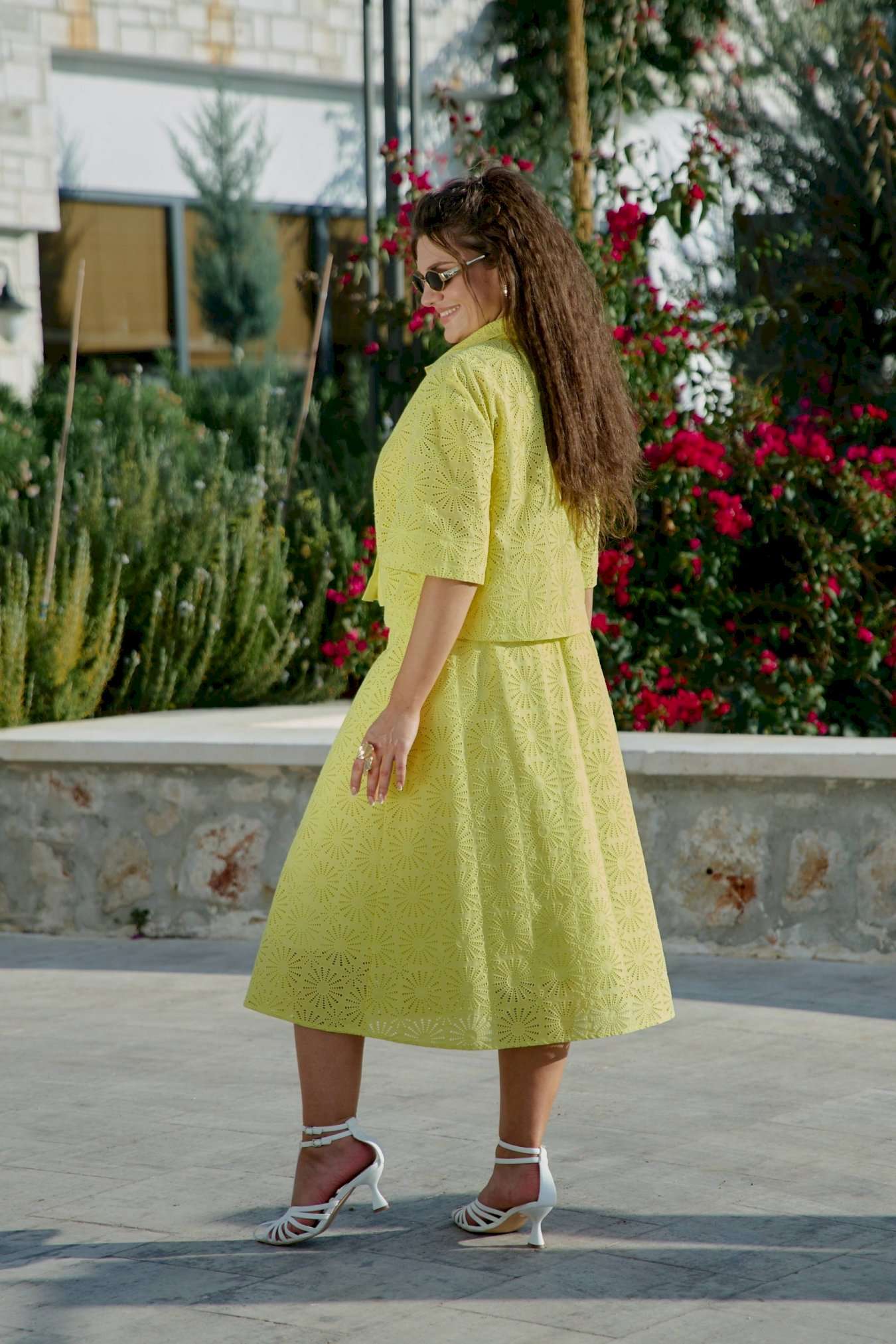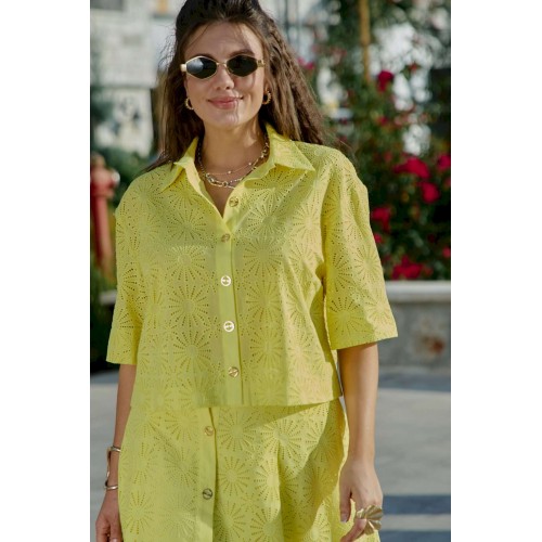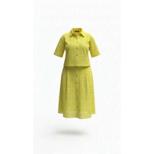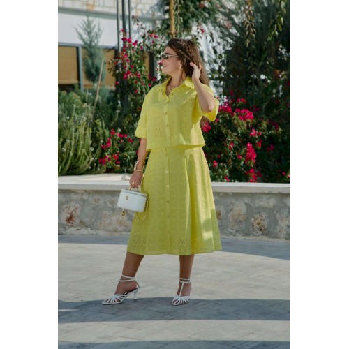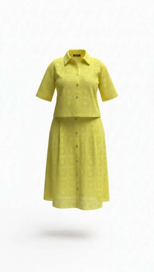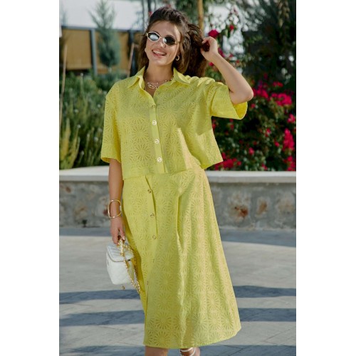 Костюм женский, состоящий из блузы и юбки выполненный в ткани ришелье. Он напоминает, что лето — время не только для простых сарафанов, но и для изысканных нарядов, что яркость и элегантность могут идти рука об руку, что настоящая женственность — в внимании к деталям, в любви к прекрасному, в умении носить сложные вещи с легкостью и уверенностью. Лимонный оттенок, яркий и жизнерадостный, сочетается с изысканной техникой ришелье, создавая образ одновременно легкий и торжественный. Блузка свободного силуэта, укороченная с центральной застёжкой на петли-пуговицы по планке, воротником рубашечного типа. Рукав в блузке втачной, длиной ¾ с широкой подгибкой по низу. Спинка без особенностей. Юбка трапециевидного силуэта с притачным поясом , со вставкой эластичной тесьмы-резинки от талиевых вытачек по переду и по задней части пояса. По переду юбки заложены декоративные складки, а так же функциональная застёжка на петли-пуговицы по планке. Юбка на подкладке. Длина блузы 49 см (р 48-52), 50 см (р 54-58), длина рукава 29 см. Длина юбки 77 см.
