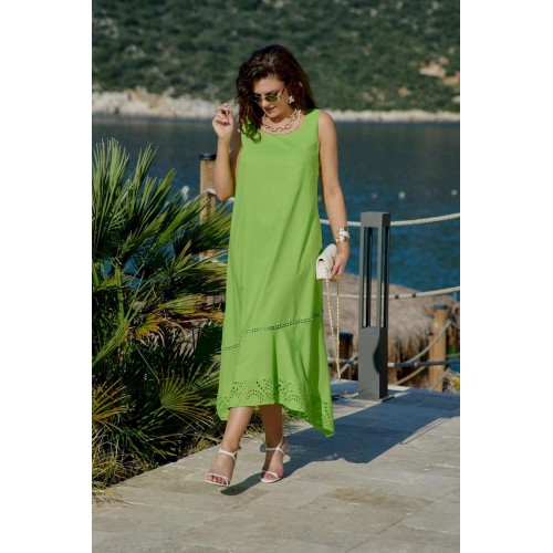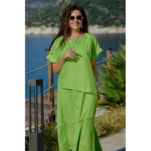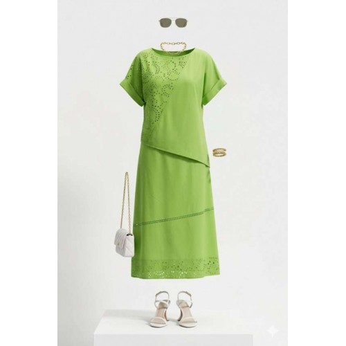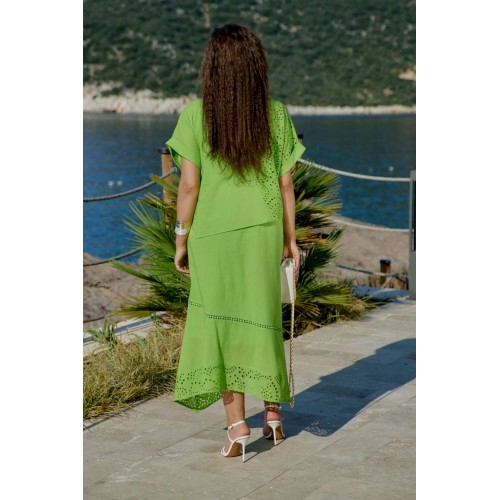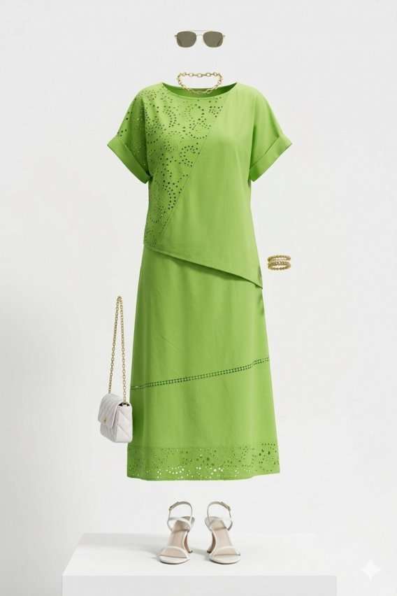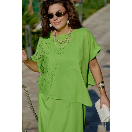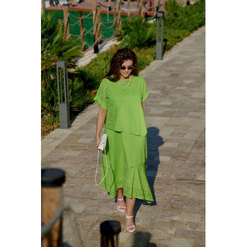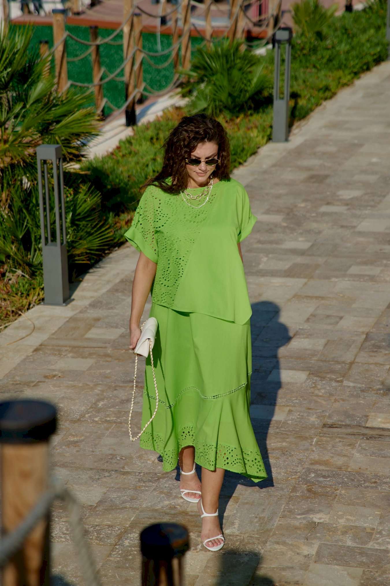 Комплект женский, двух предметный, состоящий из блузы и платья. Этот комплект — не просто одежда, а настоящее летнее настроение, застывшее в ткани. Он говорит о женщине, которая ценит красоту в деталях, смело экспериментирует с формами и цветами, и при этом сохраняет врожденное чувство стиля и гармонии. Комплект мастерски сочетает в себе: воздушность ажурного ришелье; сочность салатового цвета; динамику асимметричных линий, элегантность классического кроя. Блуза свободного силуэта, с округлой формой горловины. Рукав в блузе цельнокроеный с притачной фигурной манжетой по низу. По переду и спинке блузы диагональный подрез с декоративной вставкой из вышивки ришелье. Низ в блузе фигурной формы, создавая динамичный, летящий силуэт. Платье А-силуэта, длины «миди». Основная часть платья выполнена из однотонной ярко-салатовой ткани. Этот оттенок оживляет кожу, придает лицу свежесть, а глазам — особый блеск. Силуэт платья мягко облегает фигуру, не стесняя движений. Широкие бретели — стильный акцент, который одновременно практичен и элегантен. Они уверенно лежат на плечах, подчеркивая их линию, и переходят в глубокий вырез, открывающий ключицы. Горловина в платье округлой формы, по переду нагрудные вытачки. По низу платья притачной волан со вставкой «на просвет» декоративного кружева. Нижний ассиметричный волан из отделочной ткани — кружева. Асимметричный волан — главное украшение платья. При движении волан колышется, создавая иллюзию, будто платье живет своей собственной, таинственной жизнью. Платье на подкладке. Длина блузы по левой стороне 66 см (р 52-56), 68 см (р 58-62), по правой стороне 56 см (р 52-56), 58 см (р 58-62). Длина платья 126 см (р 52-56), 127 см (р 58-62).