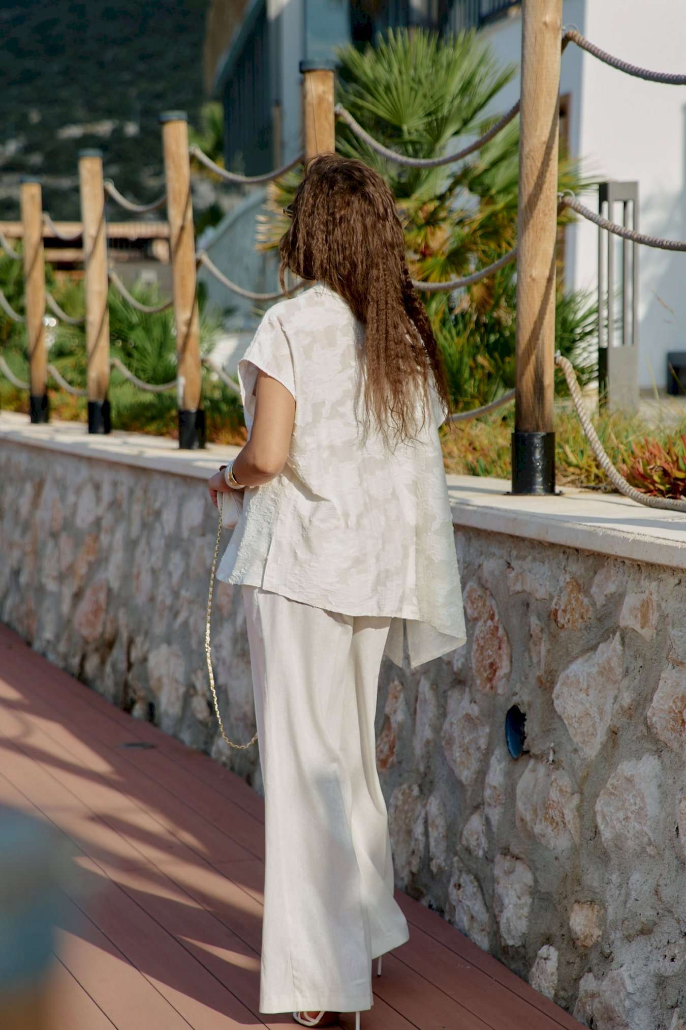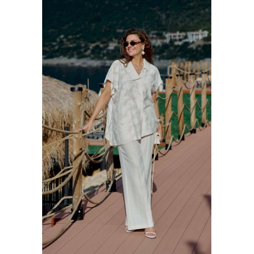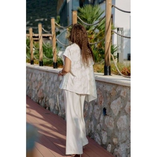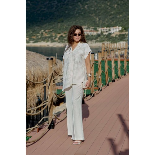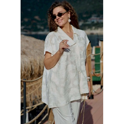 Блузка женская, главной особенностью которой является фактурный принт. Принт не бросается в глаза, а лишь намекает на свое присутствие, проявляясь при определенном освещении или движении, создавая игру света и тени. При определенном угле зрения узор \"оживает\". Блузка свободного силуэта с плавным V-образным вырезом горловины, отложным ассиметричным воротником. Линия борта в блузке немного смещена от центра, с застёжкой на потайные кнопки по краю борта. Рукав цельнокроеный, разной длины. Спинка без особенностей. Низ в блузке ассиметричный с разрезами в боковых швах. Длина блузки 70 см, длина рукава 27/33 (р 52-56), 30/36 (р 58-62).