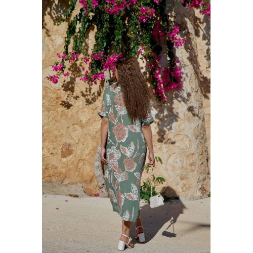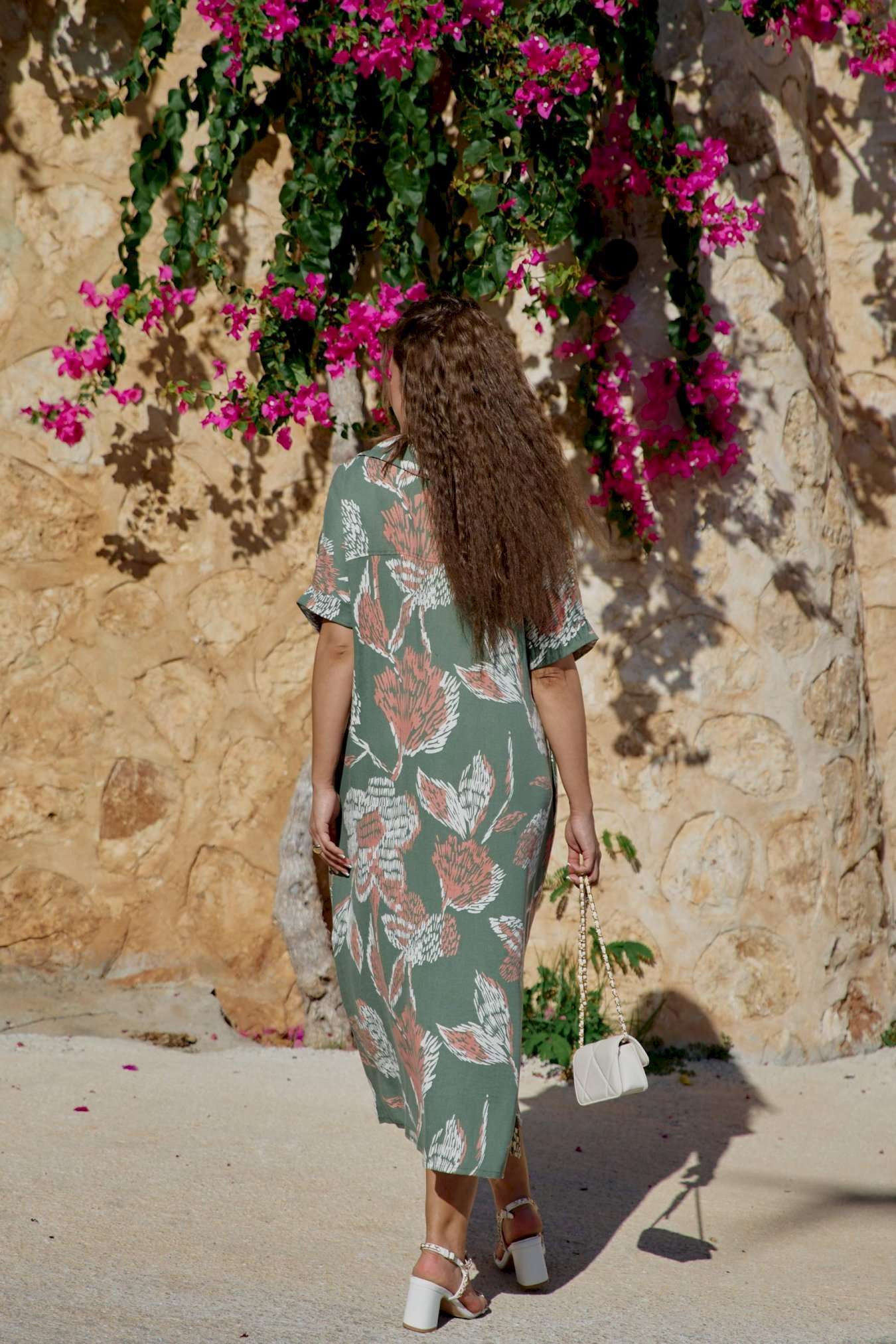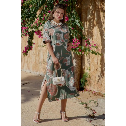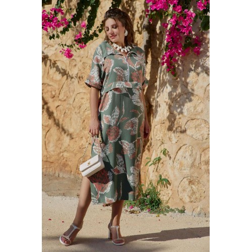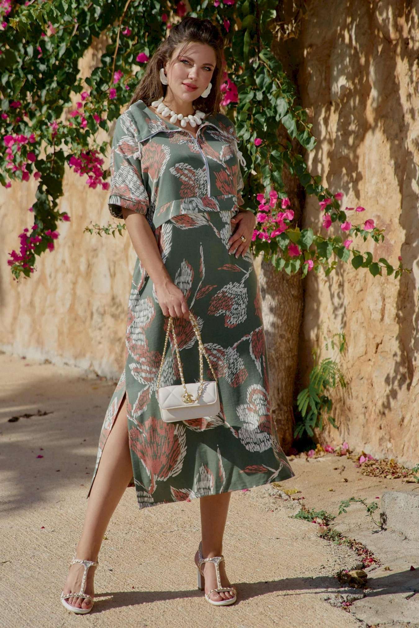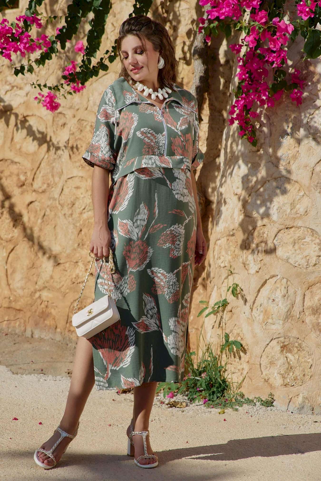 Стильное и лаконичное платье, в котором комфортно гулять даже в самую жаркую погоду, станет отличной базой в Вашем гардеробе, а ненавязчивыйй принт изделия будет притягивать к себе взгляды. Данная модель подойдёт как для похода на работу, так и для отдыха в путешествии. Платье прямого силуэта с центральной застёжкой на тесьму молнию по переду, отложным воротником с отделкой в виде декоративного шнура. По переду платья отлетная складка, в боковых швах карманы и высокие разрезы от низа. Спинка платья с отрезной кокеткой. Рукав цельнокроеный с отложной манжетой. Платье без подкладки. Длина платья 118 см (р 52-56), 119 см (р 58-62). Длина рукава (длина по плечу) 37 см (р 52-56), 38,5 см (р 58-62).