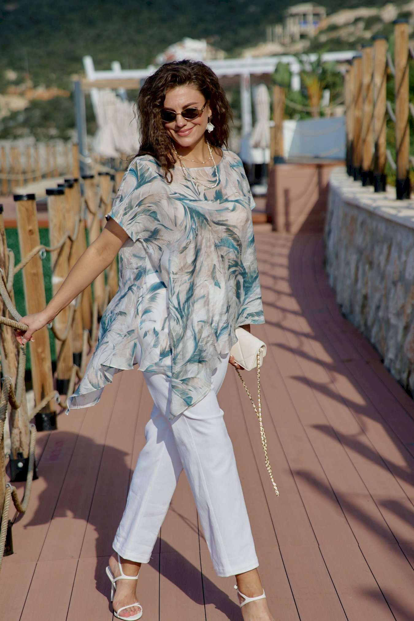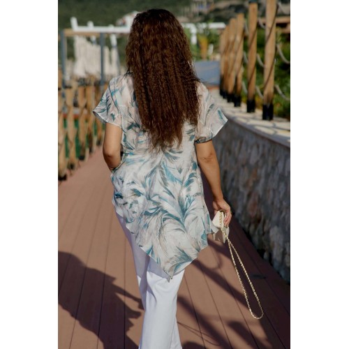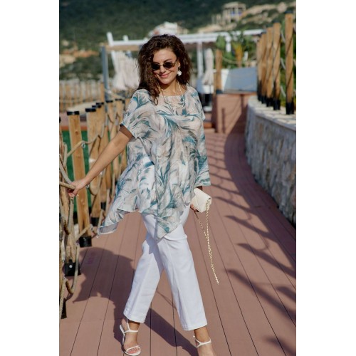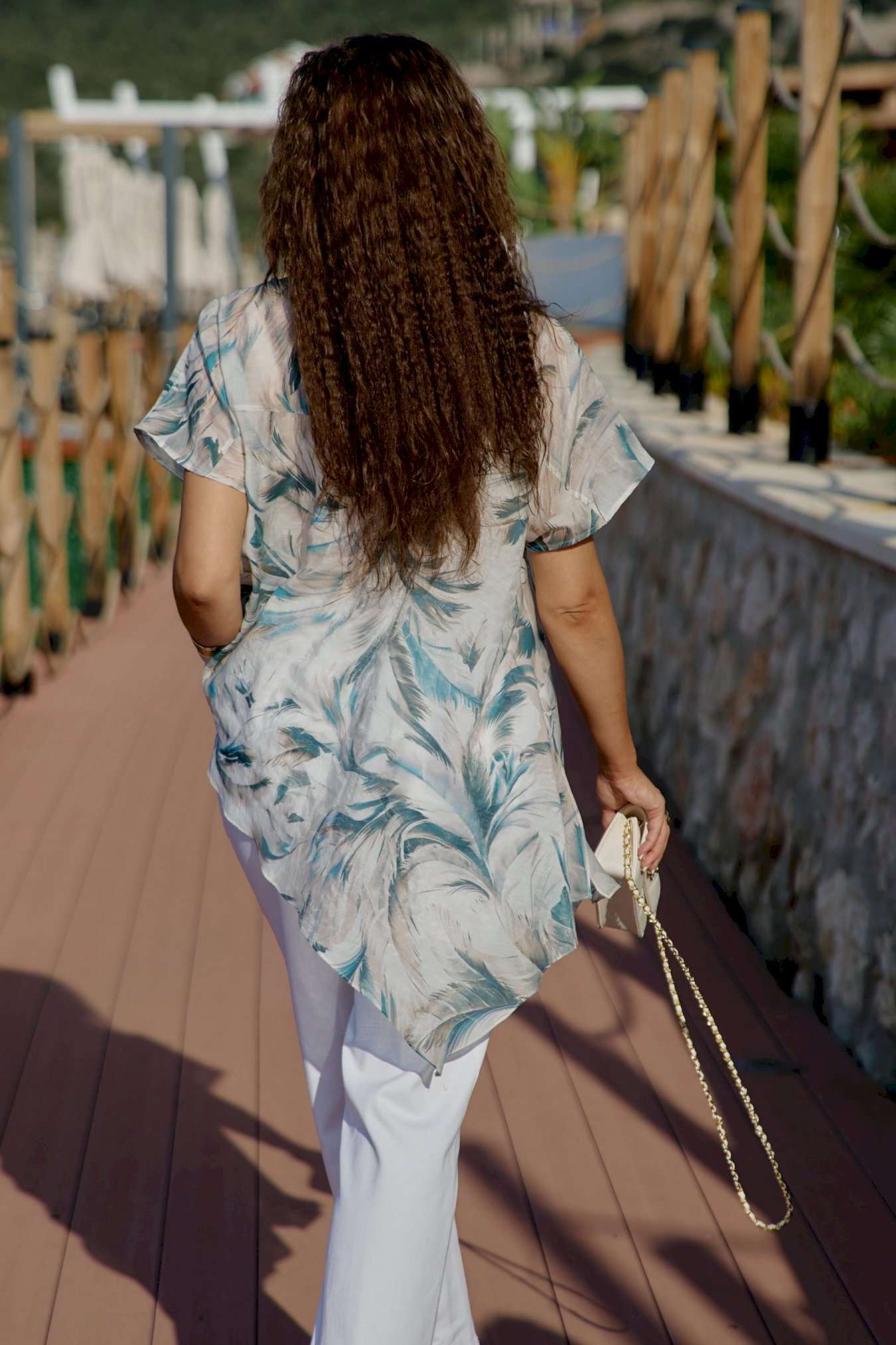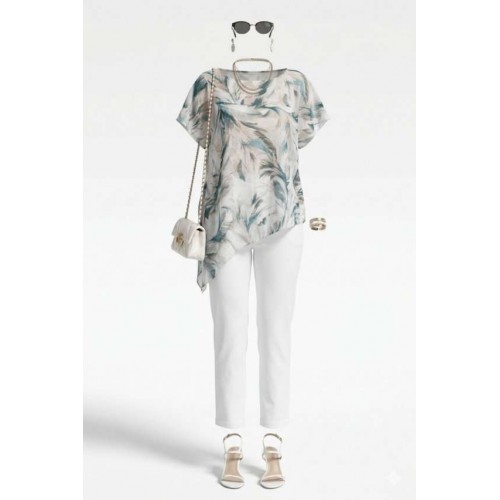 Комплект женский, двух-предметный, состоящий из блузы и брюк. В таком наряде женщина чувствует себя не просто модно, но и свободно. Невероятно стильный комплект со стильным дизайном станет ярким акцентом в вашем гардеробе! Легкий, летящий силуэт подчеркнет красоту вашей фигуры и скроет недостатки. Сочетание невесомой блузы со светлыми брюками придает образу особую изюминку. Блуза свободного силуэта с округлой формой горловины, фигурной кокеткой по переду блузы. Рукав в блузке цельнокроеный. Спинка с отрезной кокеткой. Низ в блузке ассиметричный с разрезами в боковых швах. Брюки прямого силуэта, по переду застежка на тесьму-молнию в гульфике и пуговицу в поясе. По переду наклонные карманы. В поясе брюк - вставка резинки в бочках, шлёвки. В задних половинках брюк вставка кокетки с отстрочкой и накладные карманы. Длина блузы 68 см Длина брюк 98 см.
