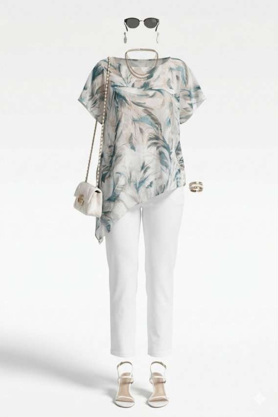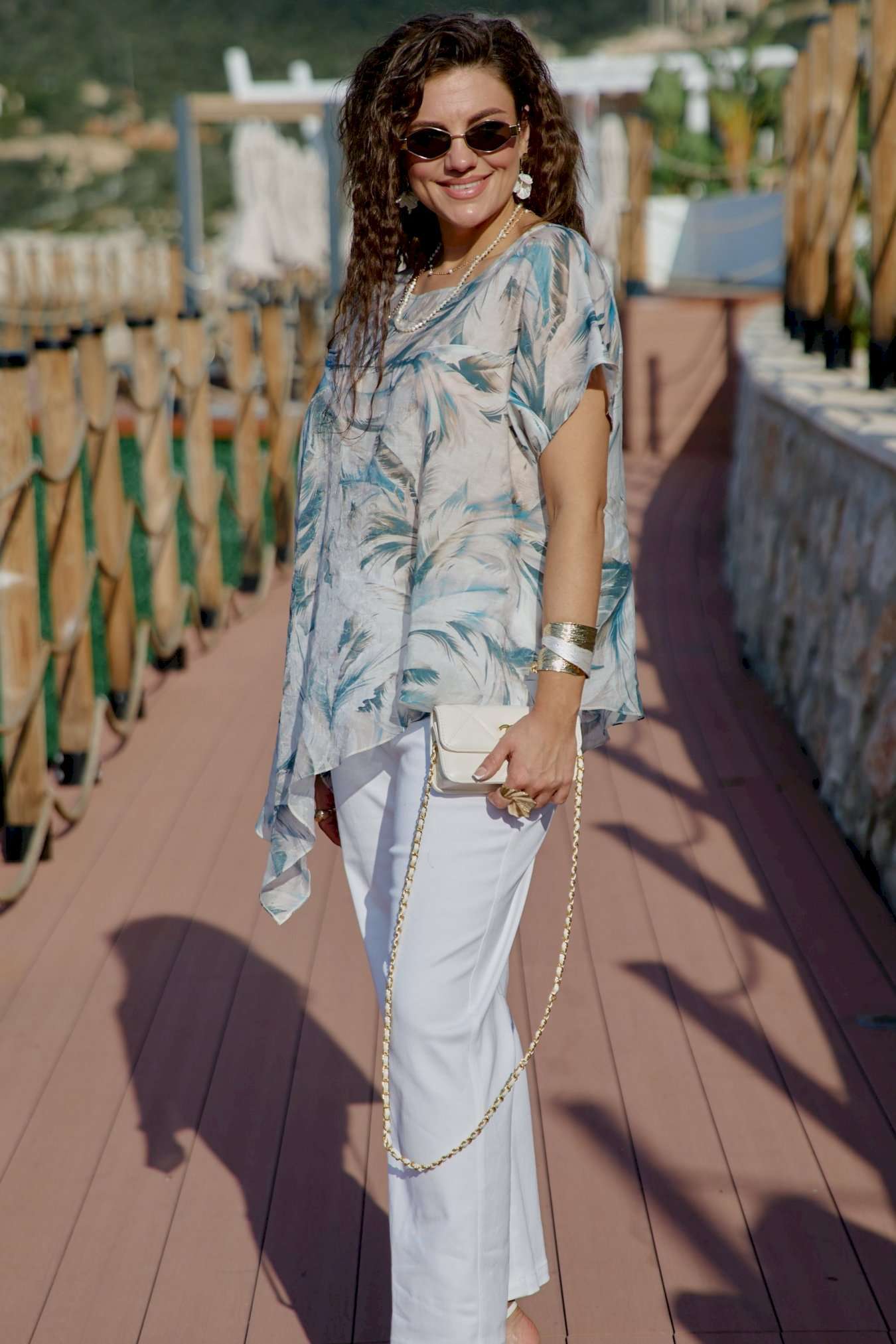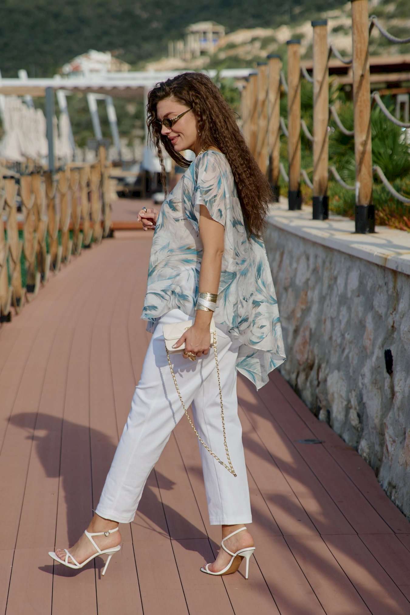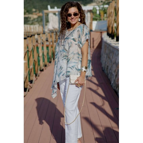 Комплект женский, двух-предметный, состоящий из блузы и брюк. В таком наряде женщина чувствует себя не просто модно, но и свободно. Невероятно стильный комплект со стильным дизайном станет ярким акцентом в вашем гардеробе! Легкий, летящий силуэт подчеркнет красоту вашей фигуры и скроет недостатки. Сочетание невесомой блузы со светлыми брюками придает образу особую изюминку. Блуза свободного силуэта с округлой формой горловины, фигурной кокеткой по переду блузы. Рукав в блузке цельнокроеный. Спинка с отрезной кокеткой. Низ в блузке ассиметричный с разрезами в боковых швах. Брюки прямого силуэта, по переду застежка на тесьму-молнию в гульфике и пуговицу в поясе. По переду наклонные карманы. В поясе брюк - вставка резинки в бочках, шлёвки. В задних половинках брюк вставка кокетки с отстрочкой и накладные карманы. Длина блузы 68 см Длина брюк 98 см.
