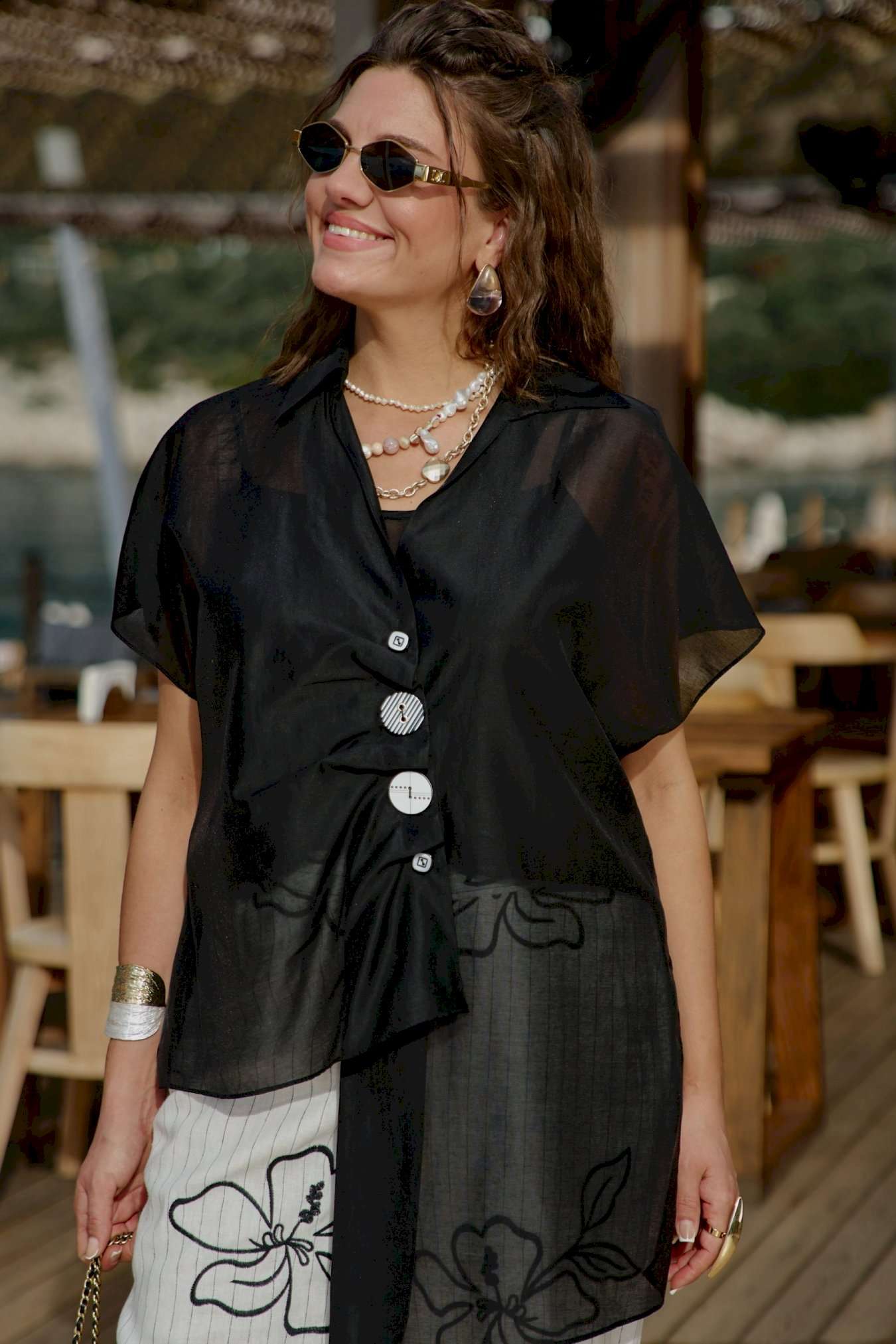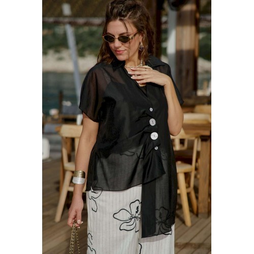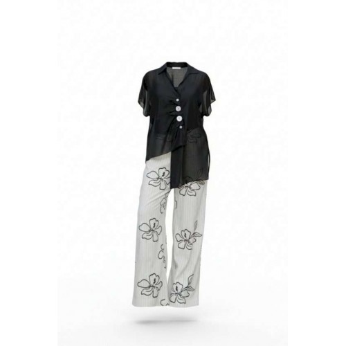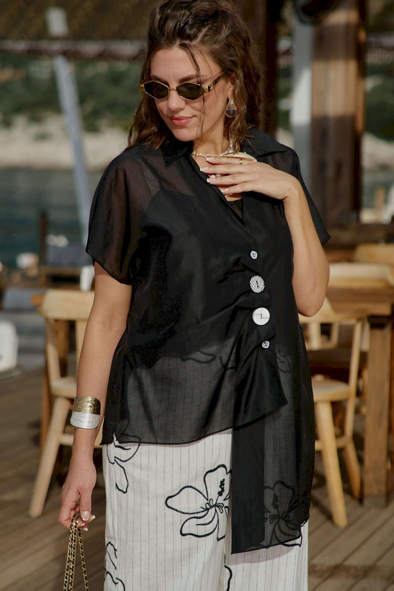 Комплект женский двух предметный, состоящий из блузки и блузы. Блузка свободного силуэта с ассиметричной линией борта с заложенными складками, имитацией застёжки на декоративные пуговицы. Горловина в блузке с отложным воротником со стойкой. Рукав в блузке цельнокроеный. Спинка с отрезной кокеткой. Низ в блузке ассиметричный с разрезами в боковых швах. Блуза прямого силуэта на регулируемых бретелях со вставкой эластичной тесьмы-резинке по спинке. В боковых швах от низа разрезы. Обращаем Ваше внимание, что фурнитура может незначительно отличаться от фото. Длина блузы спинки от плеча 69 см(р.52-56), 72 см (р.58-60). Длина переда правого 70 см (р.52-56), 73 см (р.58-62). Длина переда левого 84 см (р.52-56), 87 см (р.58-62). Блузка (топ) 43 см (р.52-56), 45 см (р.58-62).
