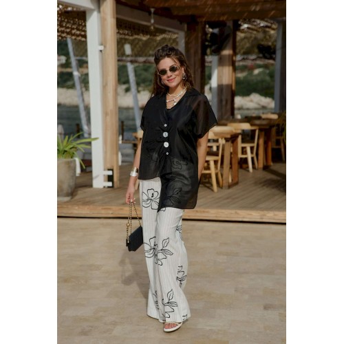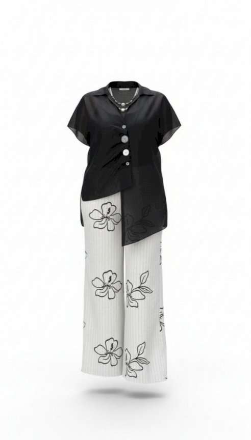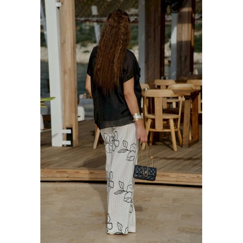 Брюки прямого силуэта, с притачным поясом со вставкой эластичной тесьмы-резинки в бочках, застёжкой на тесьму-молнию в гульфике и пуговицу в поясе. В боковых швах брюк прорезные карманы. Черные полоски плавно в сочетании с цветочными узорами добавляют в комплект легкость и игривость, превращая его в настоящее произведение искусства. Брюки на подкладке. Обращаем Ваше внимание, что фурнитура может незначительно отличаться от фото. Длина брюки по боковому шву 108 см.